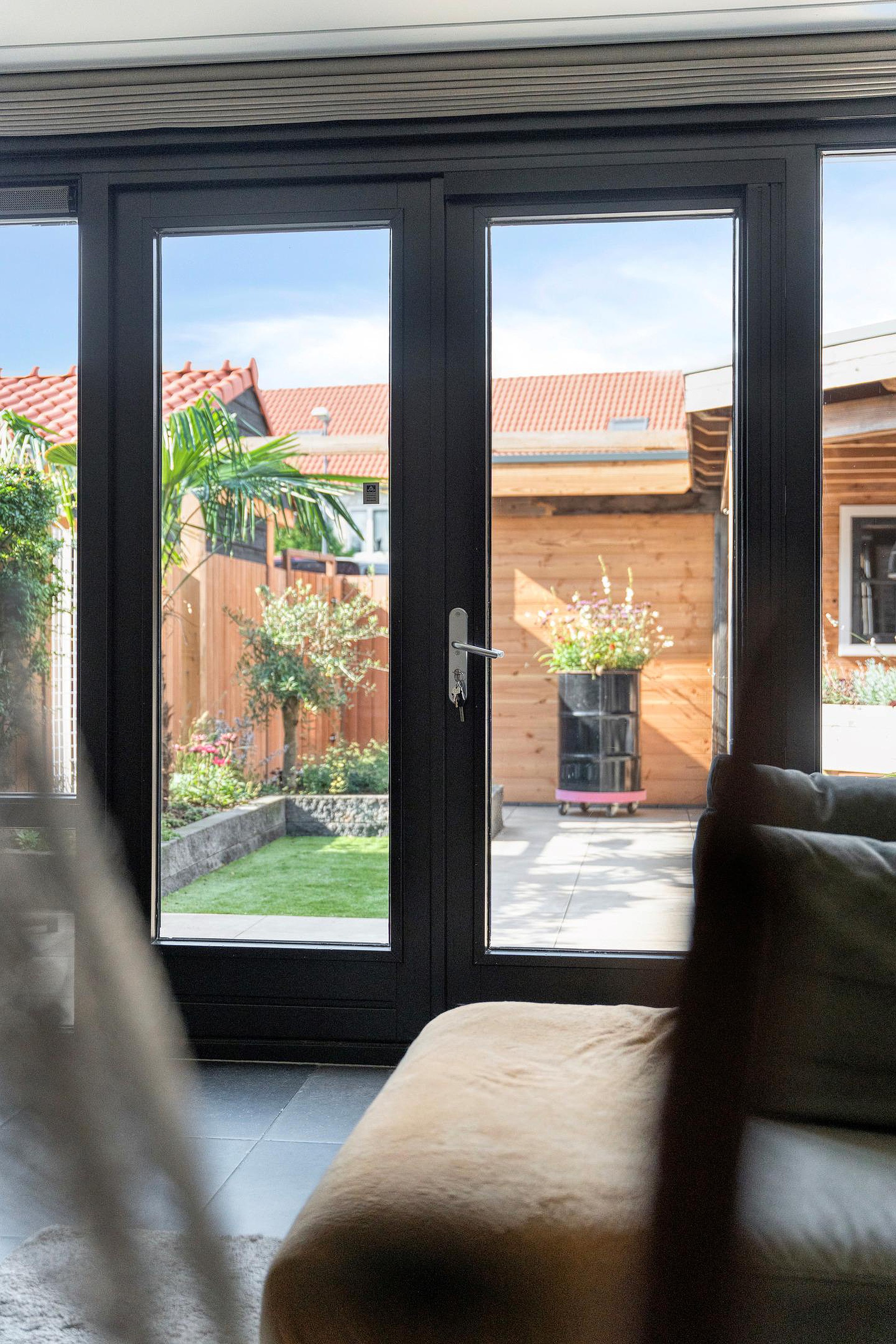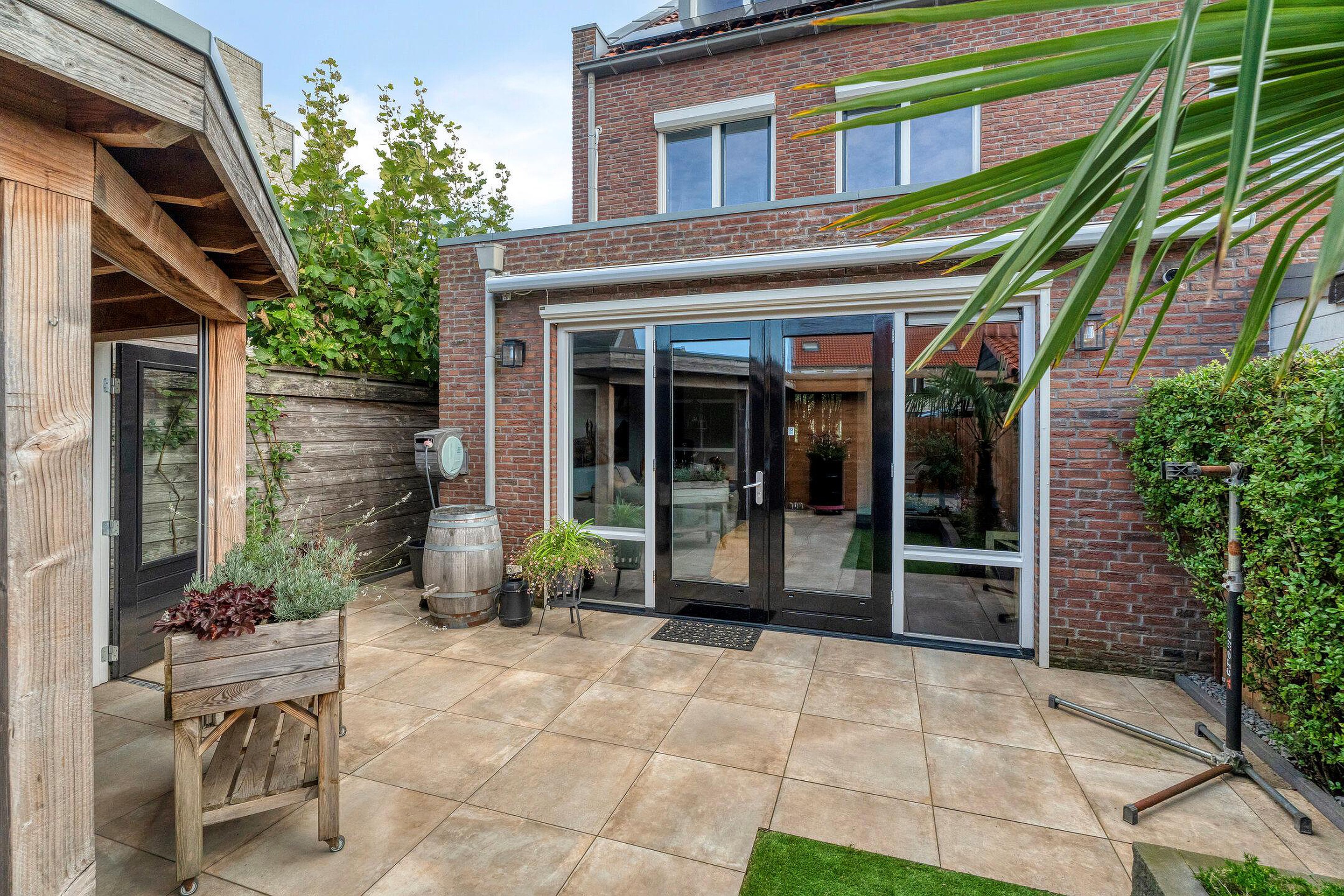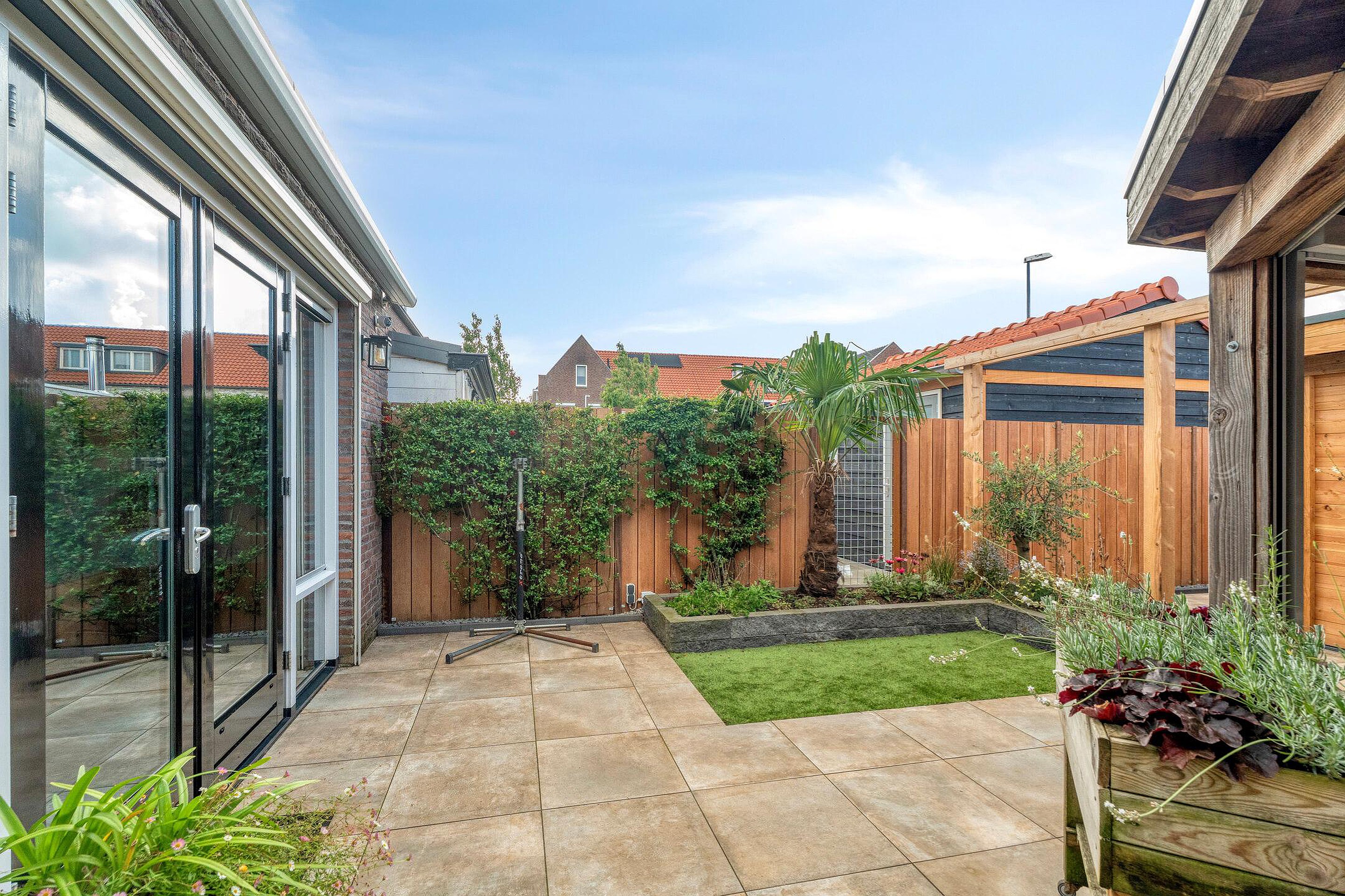 De tuin is volledig omsloten door een houten schutting, waardoor u hier veel privacy ervaart. Dankzij de gunstige ligging en de directe verbinding met de woonkamer via openslaande deuren loopt binnen en buiten naadloos in elkaar over.