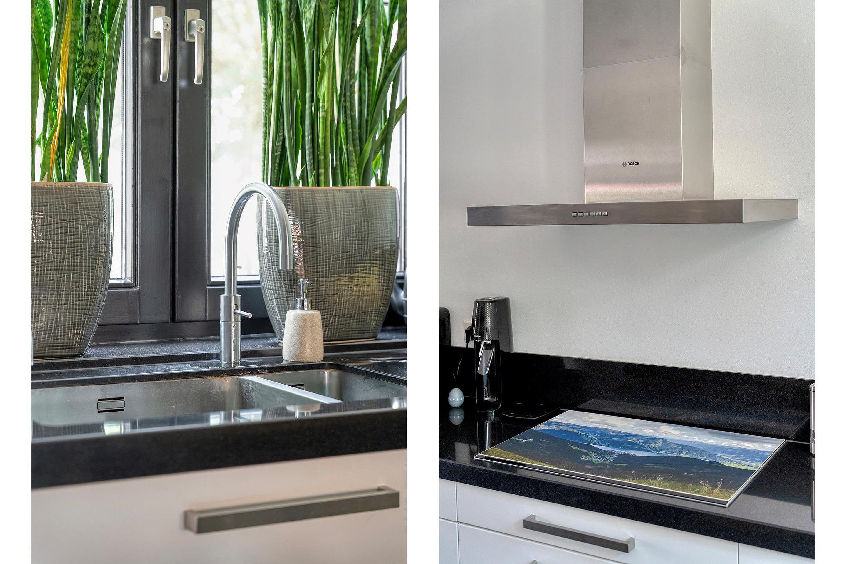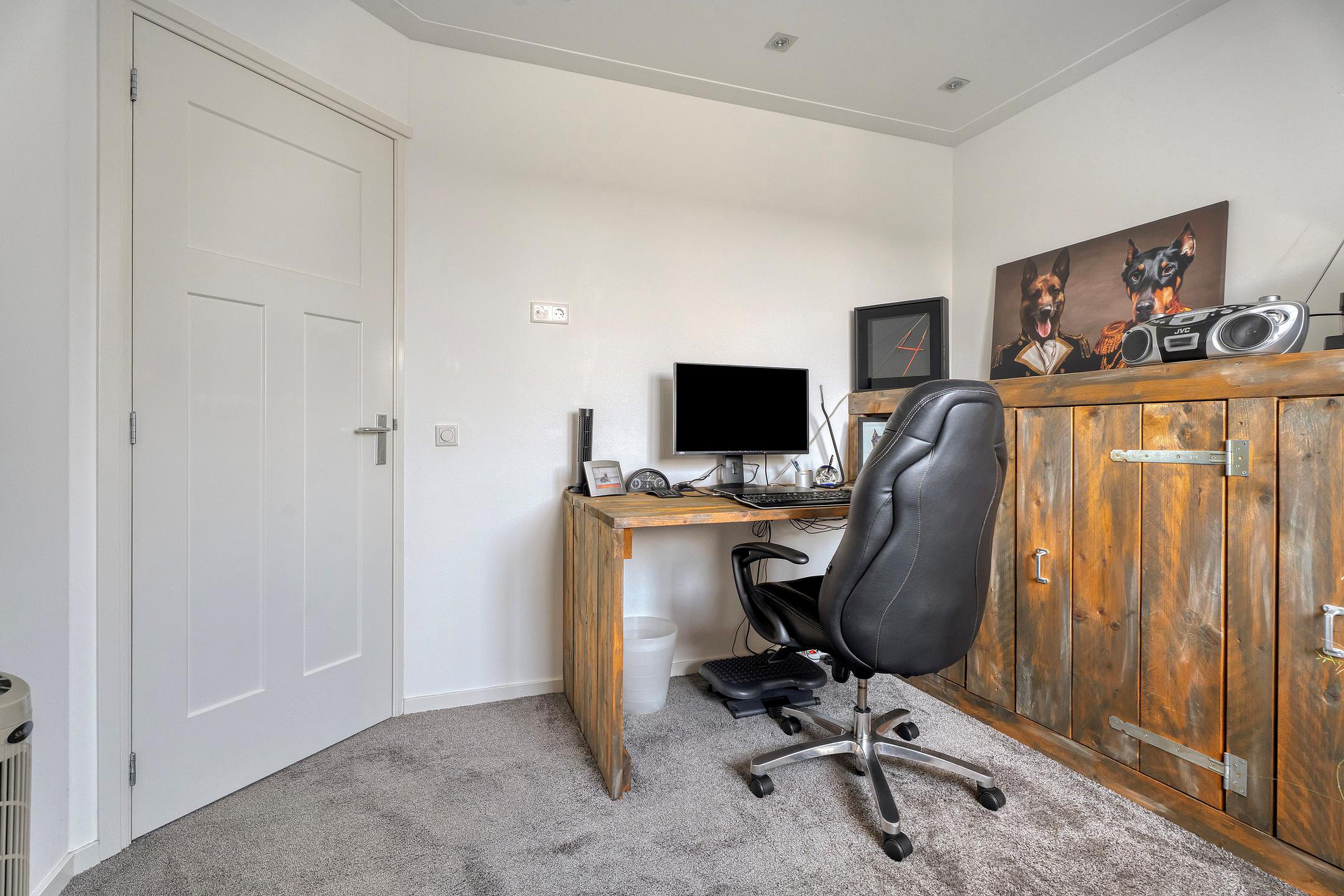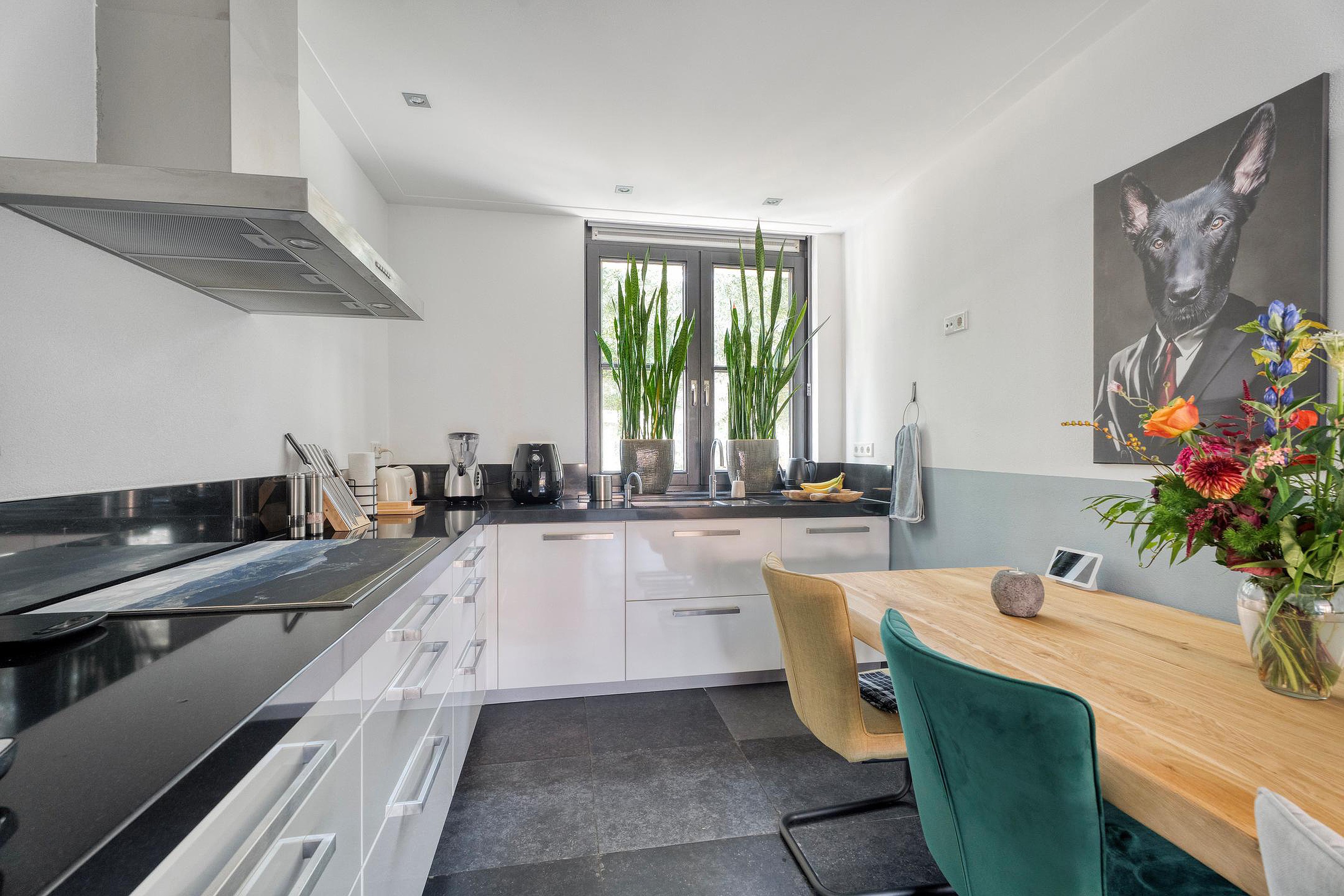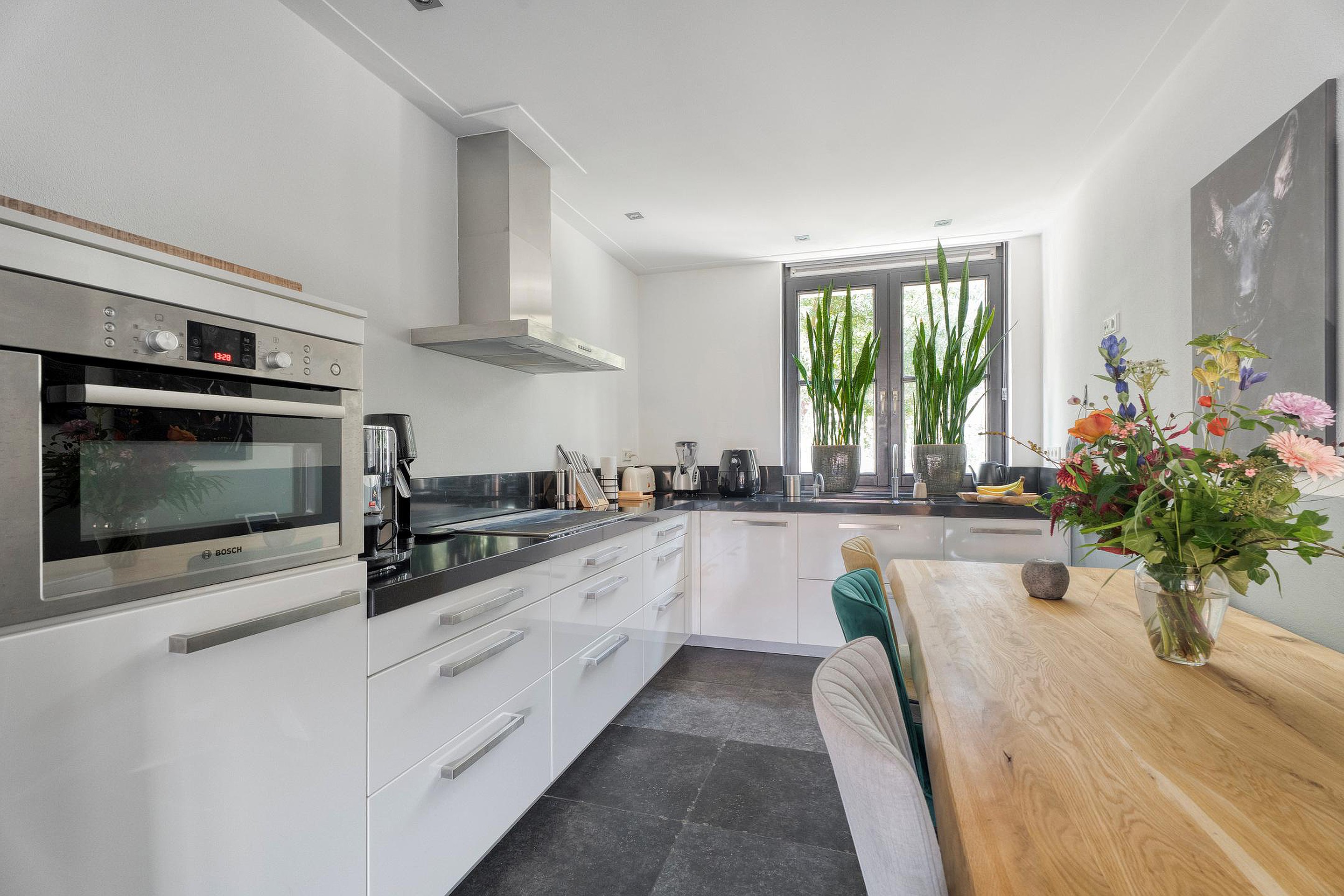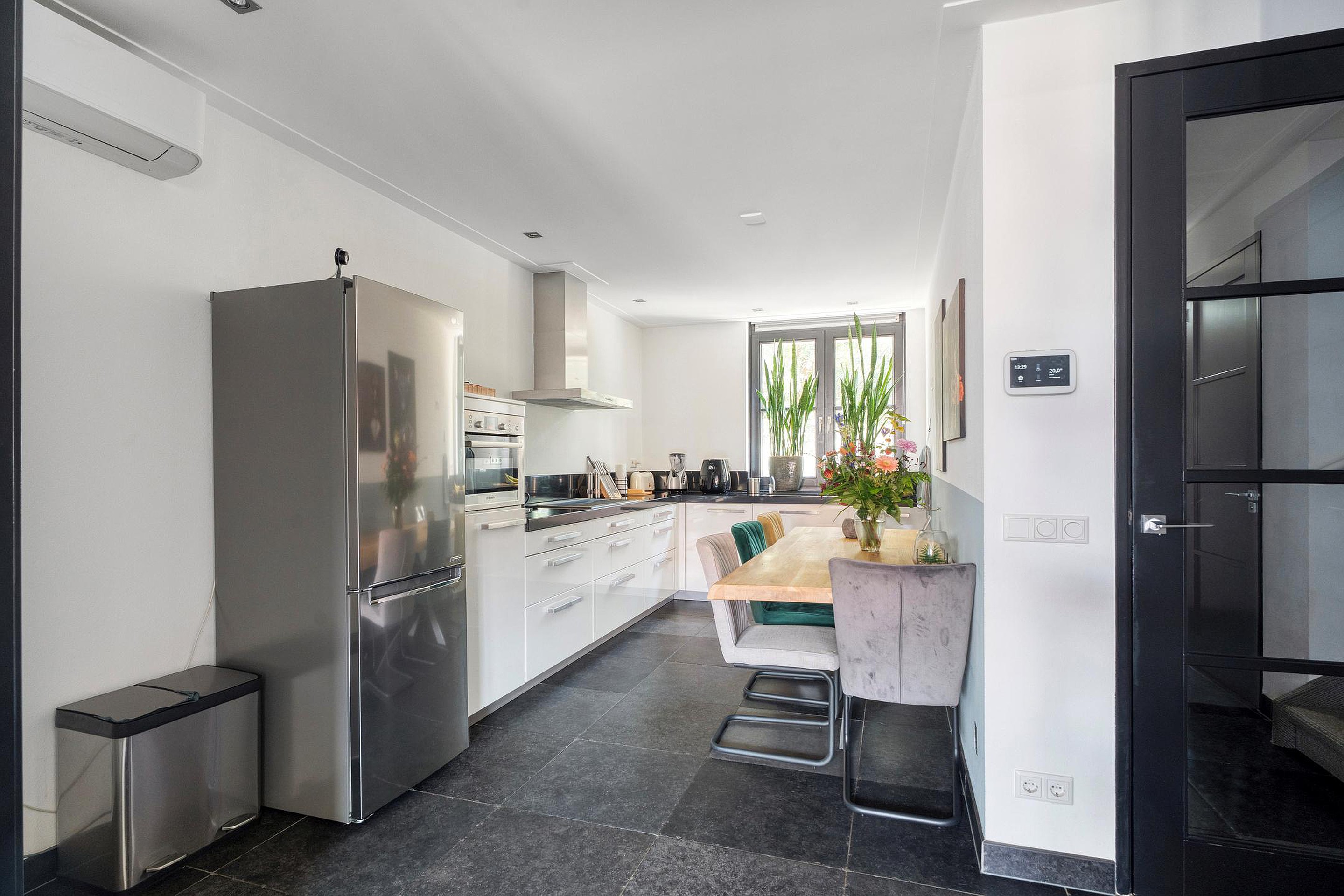 Aan de voorzijde van de woning bevindt zich de keuken. Deze is ruim opgezet en beschikt over een recht keukenblok met inbouwapparatuur en aansluitmogelijkheden voor alle gewenste voorzieningen. Dankzij de ligging aan de straatzijde heeft u hier prettig uitzicht en veel lichtinval. Daarnaast beschikt de keuken over een airco.