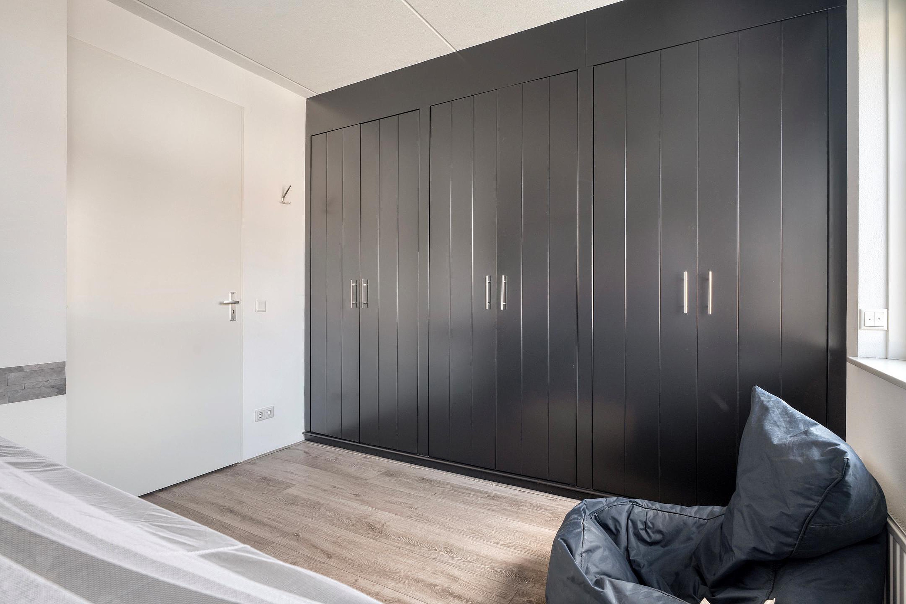 Aan de achterzijde van de woning bevindt zich een ruime slaapkamer over de volle breedte, voorzien van een handige ingebouwde kast en een airco. Dankzij de breedte van de kamer is er voldoende plaats voor een groot bed en extra kasten of een werkhoek.
