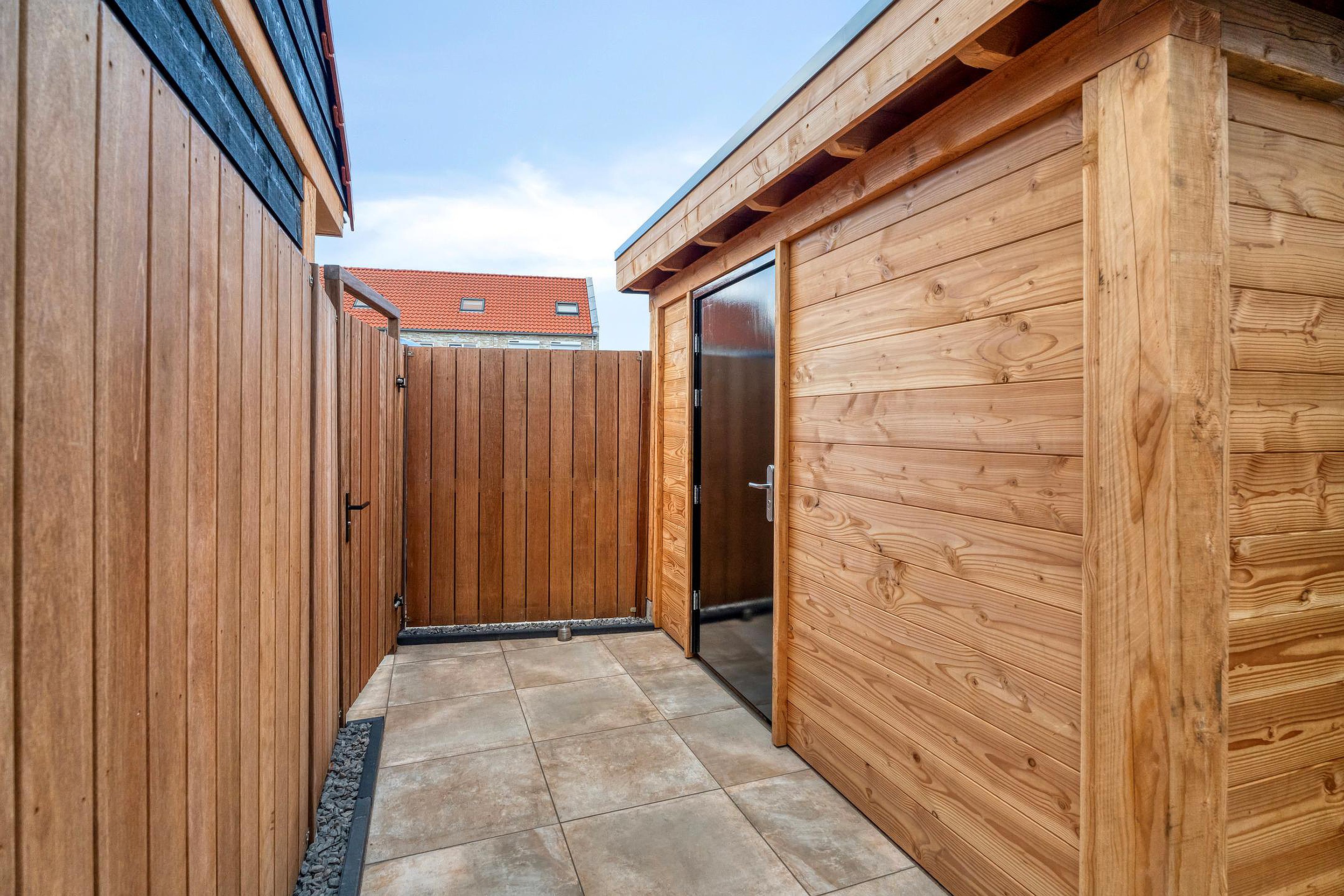 Buiten begint het genieten al. De tuin ligt perfect op het westen, waardoor je hier tot in de avond zon hebt. Onder de moderne veranda met elektrische schermen is het in elk seizoen een fijne plek om te ontspannen, terwijl de vergrote schuur zorgt voor volop praktische bergruimte.