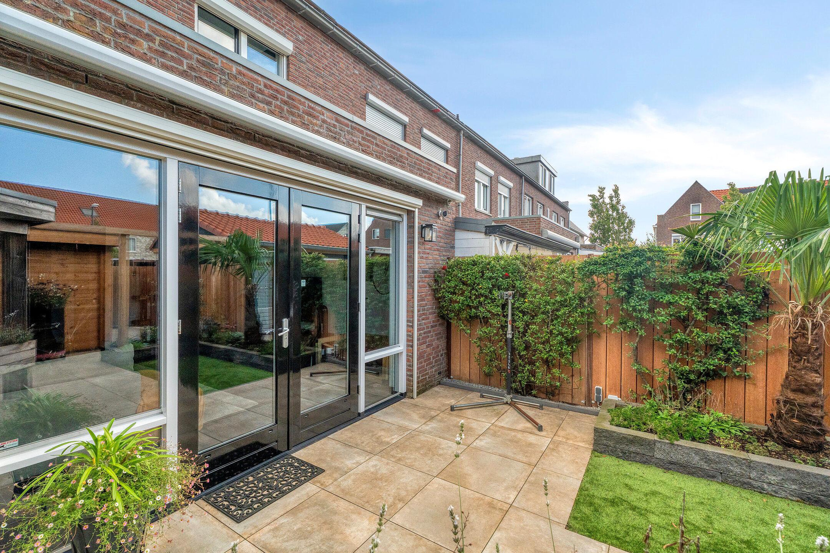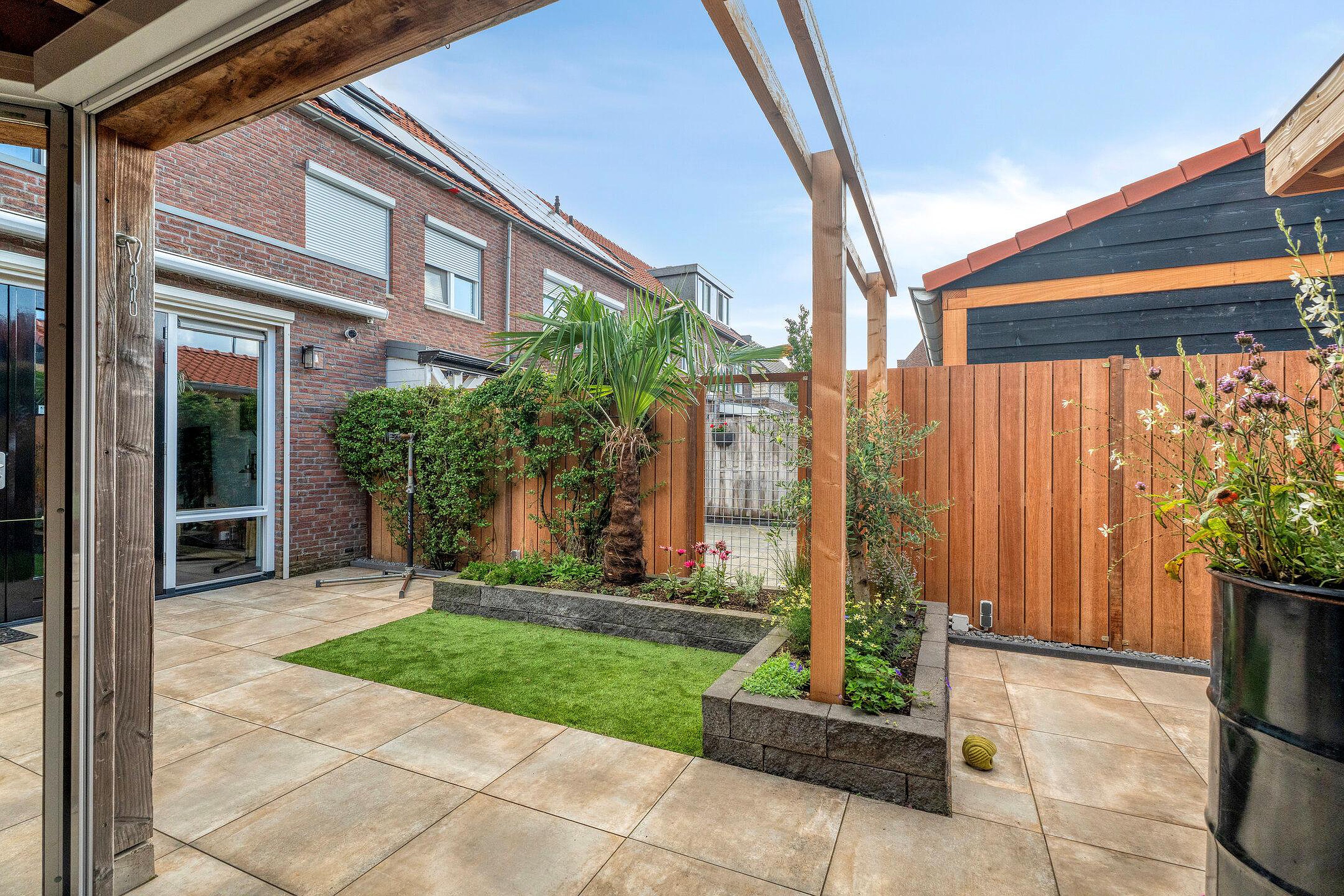 Tuin De woning beschikt over een fraai aangelegde achtertuin, die is ingericht met een combinatie van sierbestrating, groenperken en kunstgras. Dankzij de strakke betegeling is de tuin onderhoudsvriendelijk en biedt deze volop ruimte voor een zithoek, speelruimte en extra beplanting. De aanwezigheid van diverse groenaccenten, een palm en olijfboom geven de tuin een speels en sfeervol karakter.