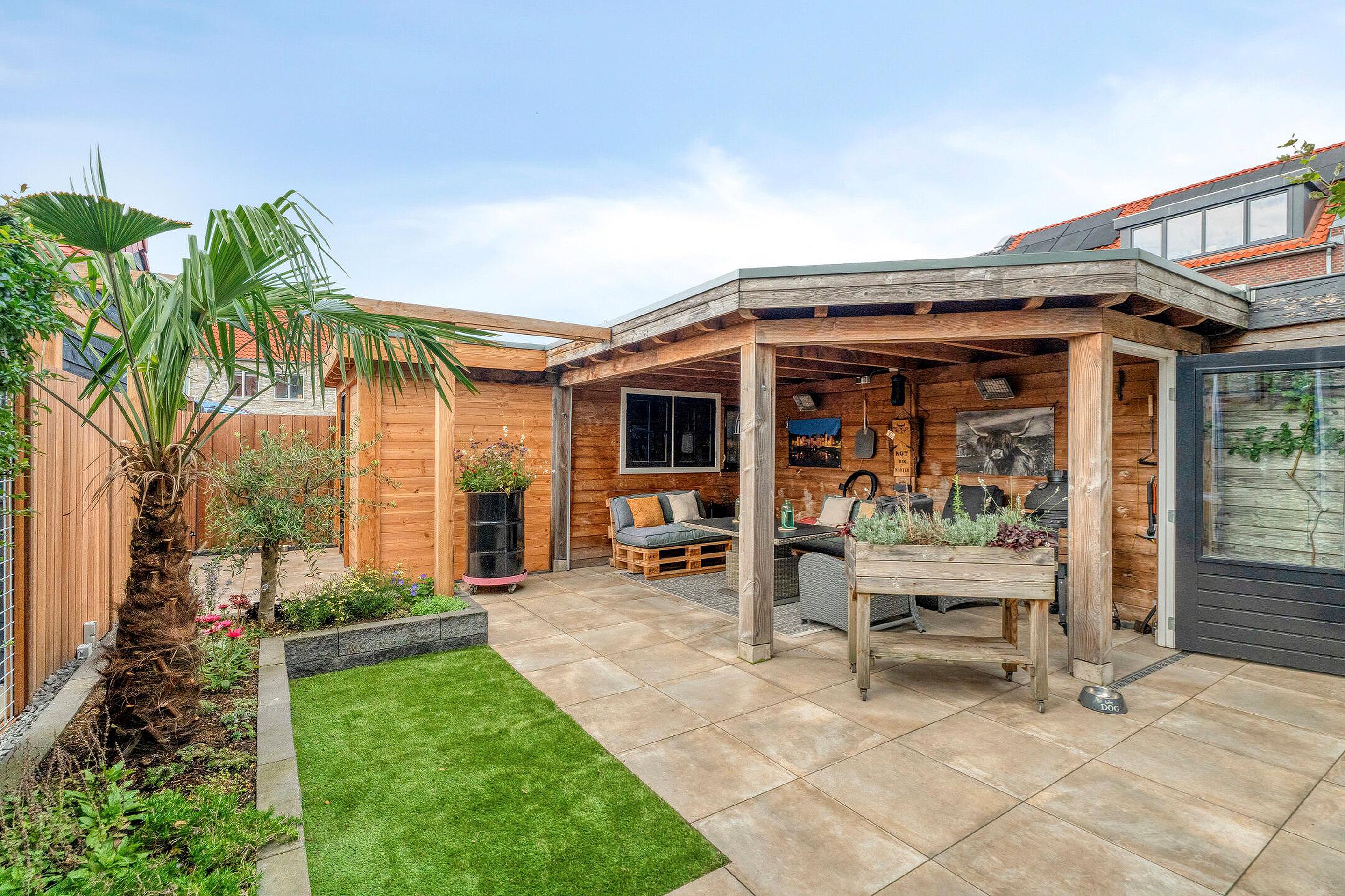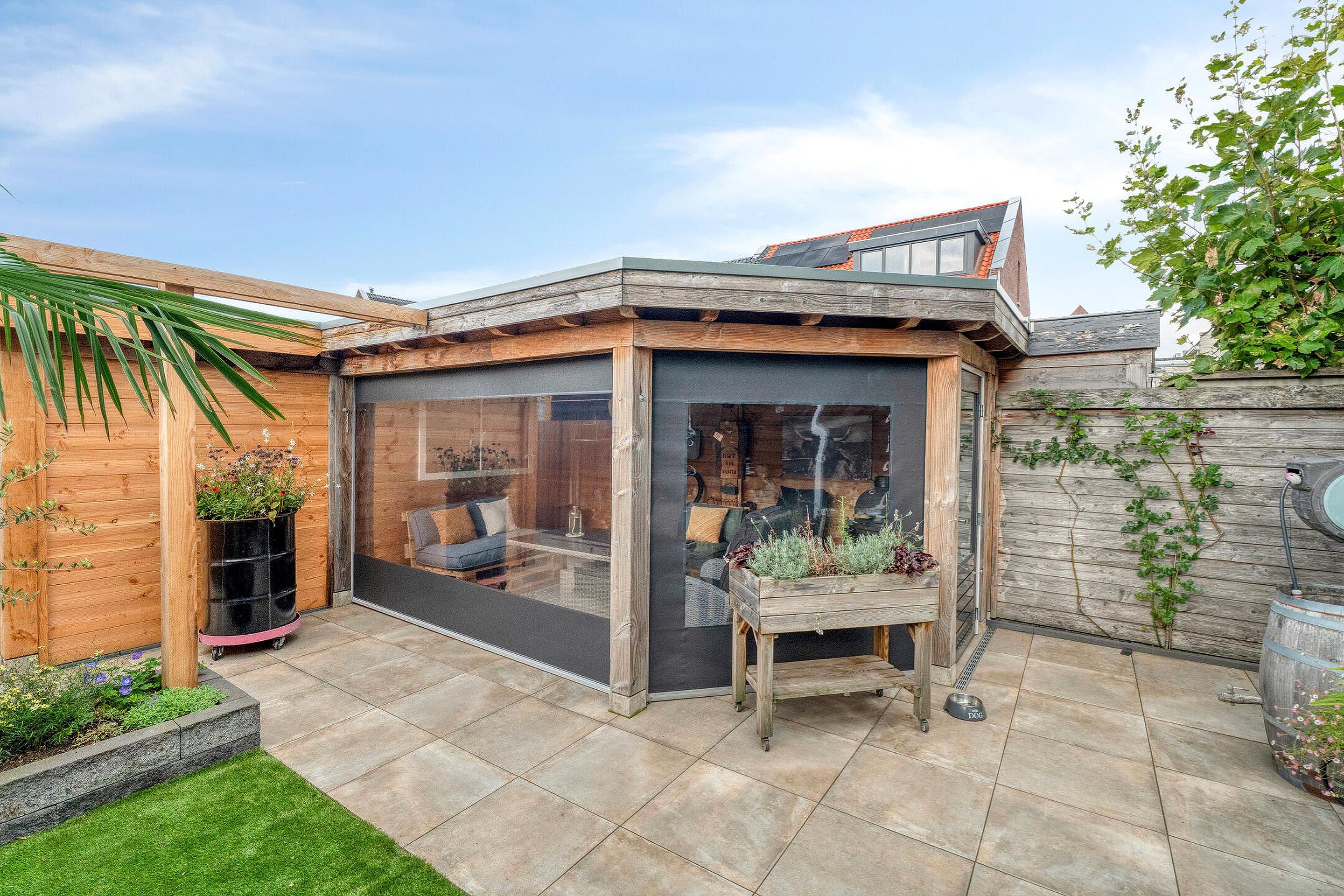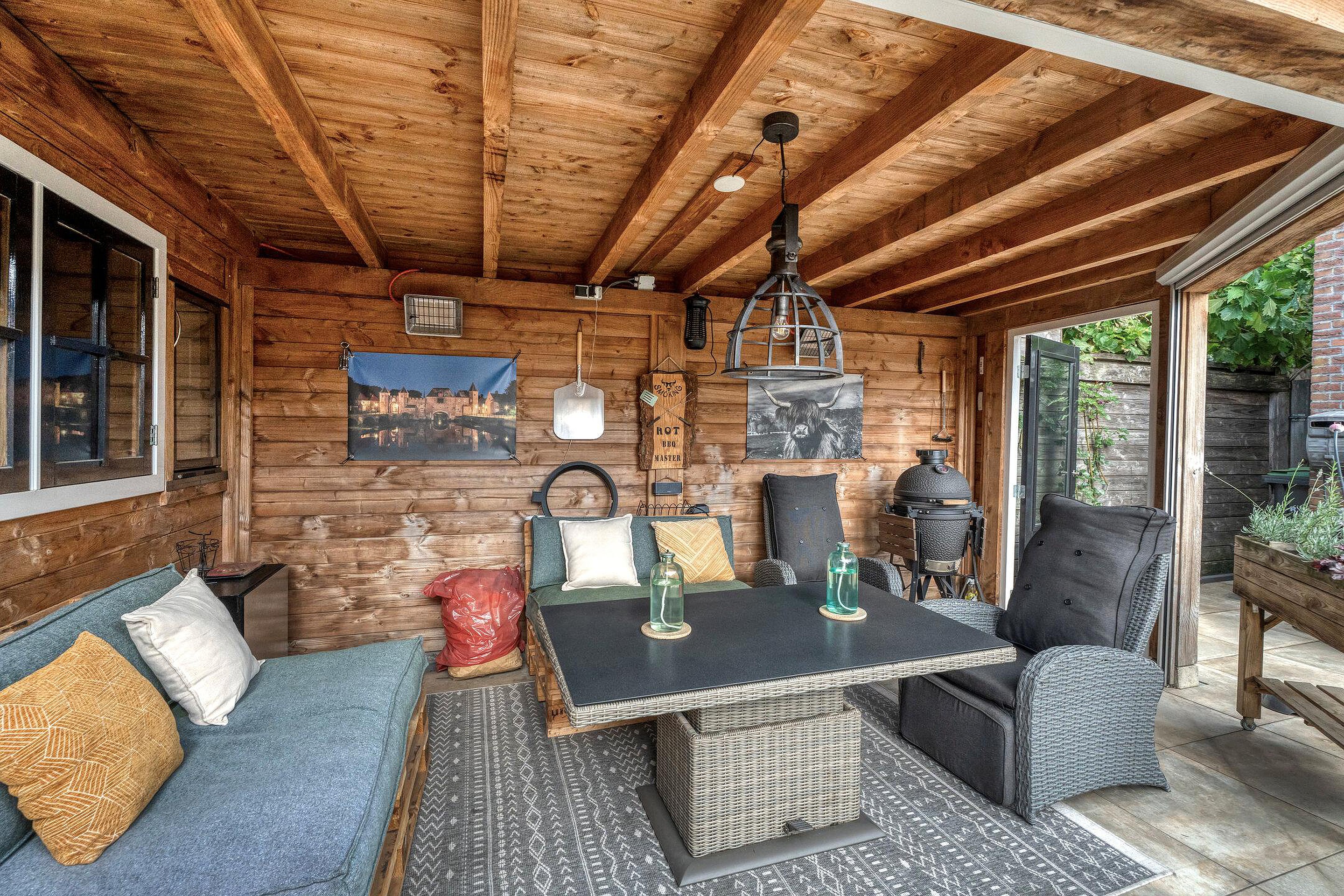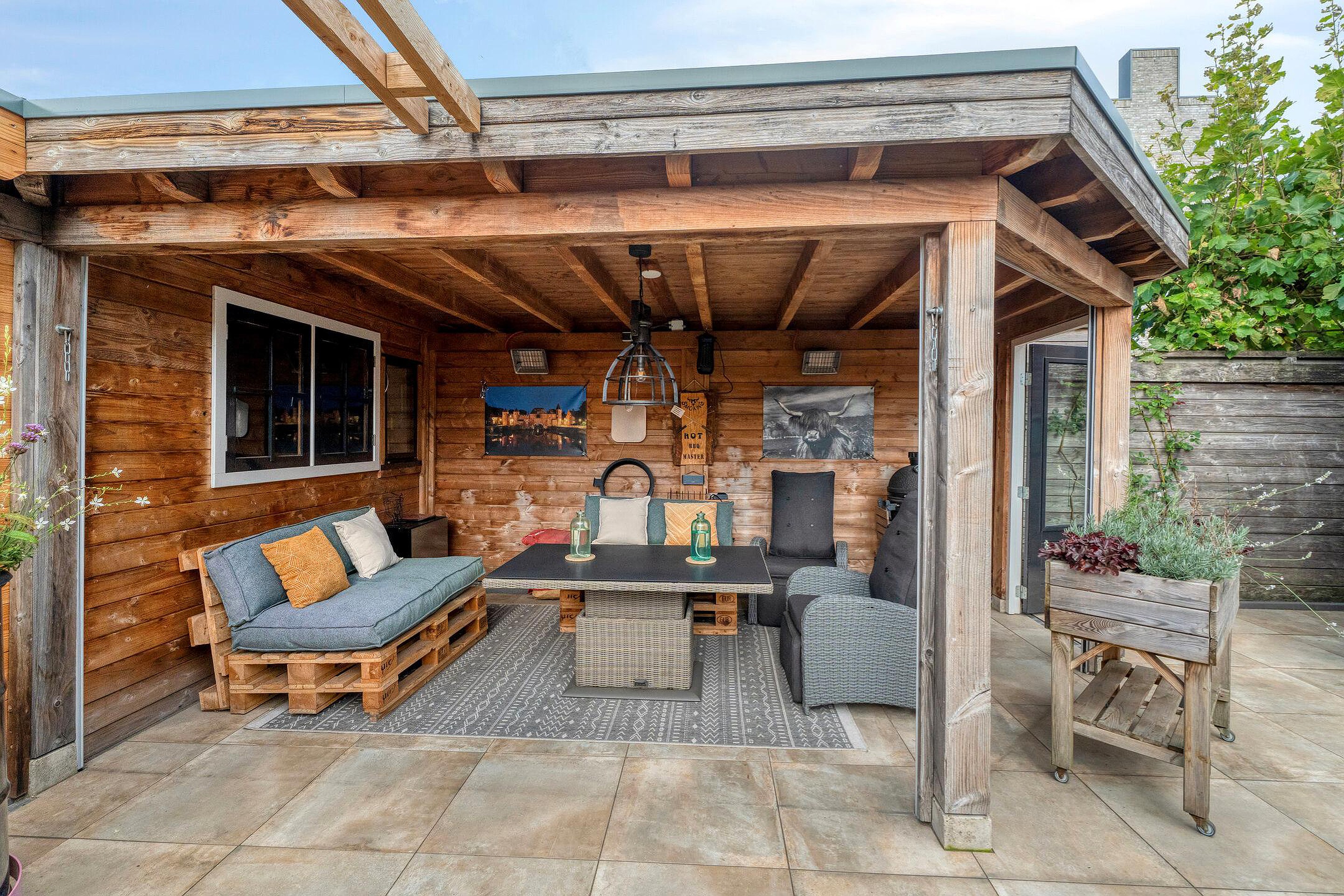 Achter in de tuin staat een royale overkapping met berging. Deze sfeervolle veranda is voorzien van een zitgedeelte en biedt de ideale plek om het hele jaar door te genieten van het buitenleven. Het overdekte terras is perfect geschikt voor gezellige avonden met vrienden of familie, en biedt tevens praktische ruimte voor een barbecue of buitenkeuken.
