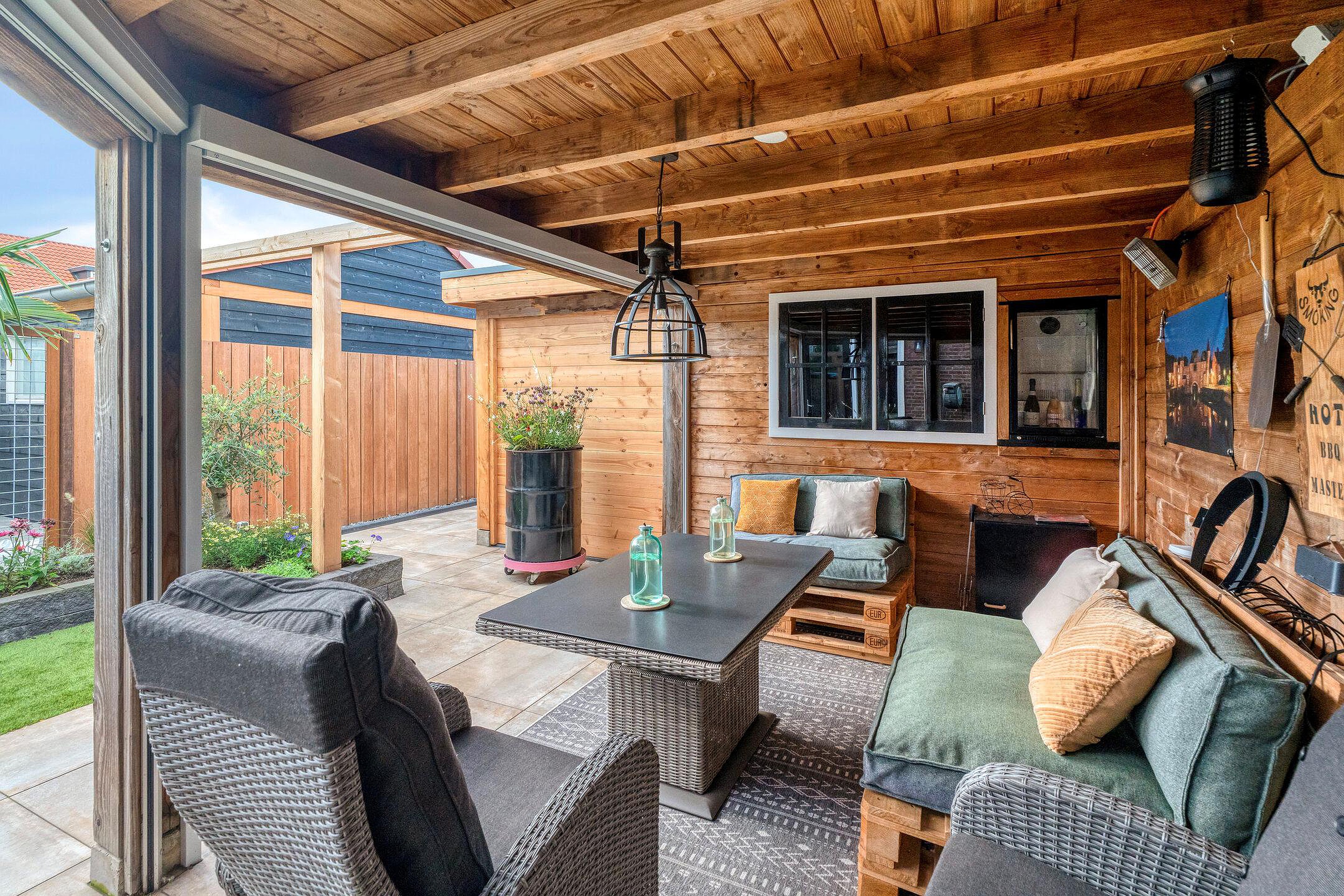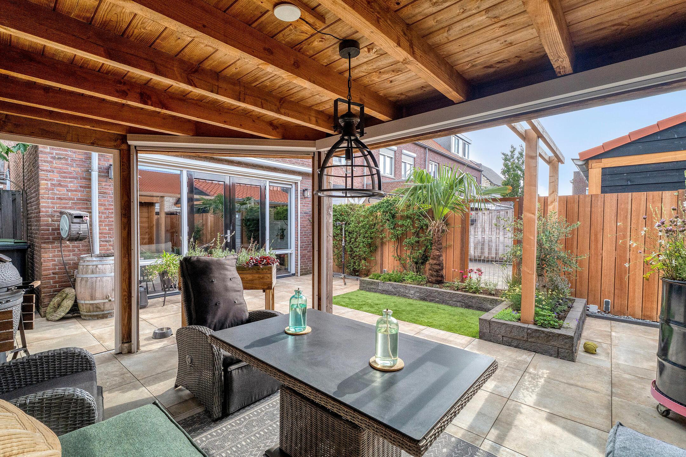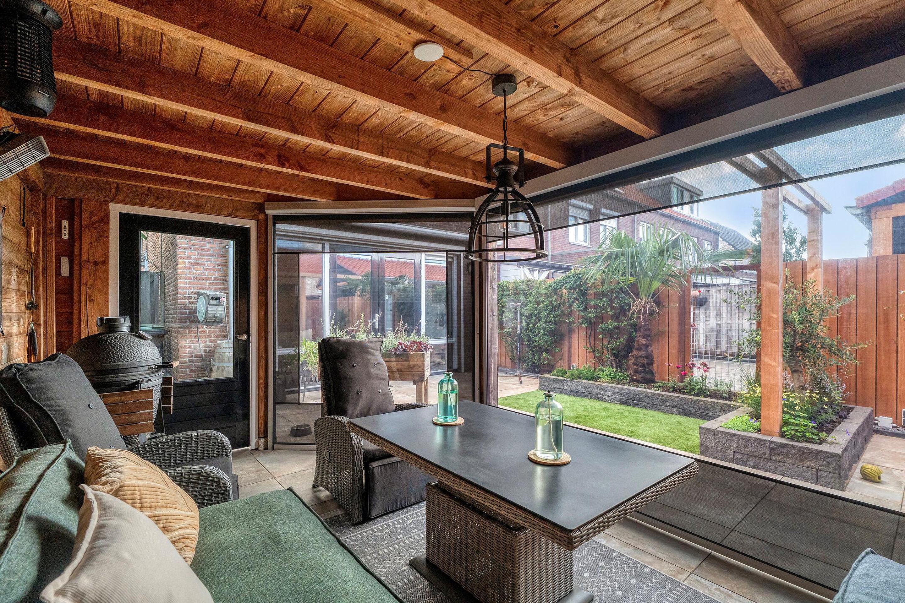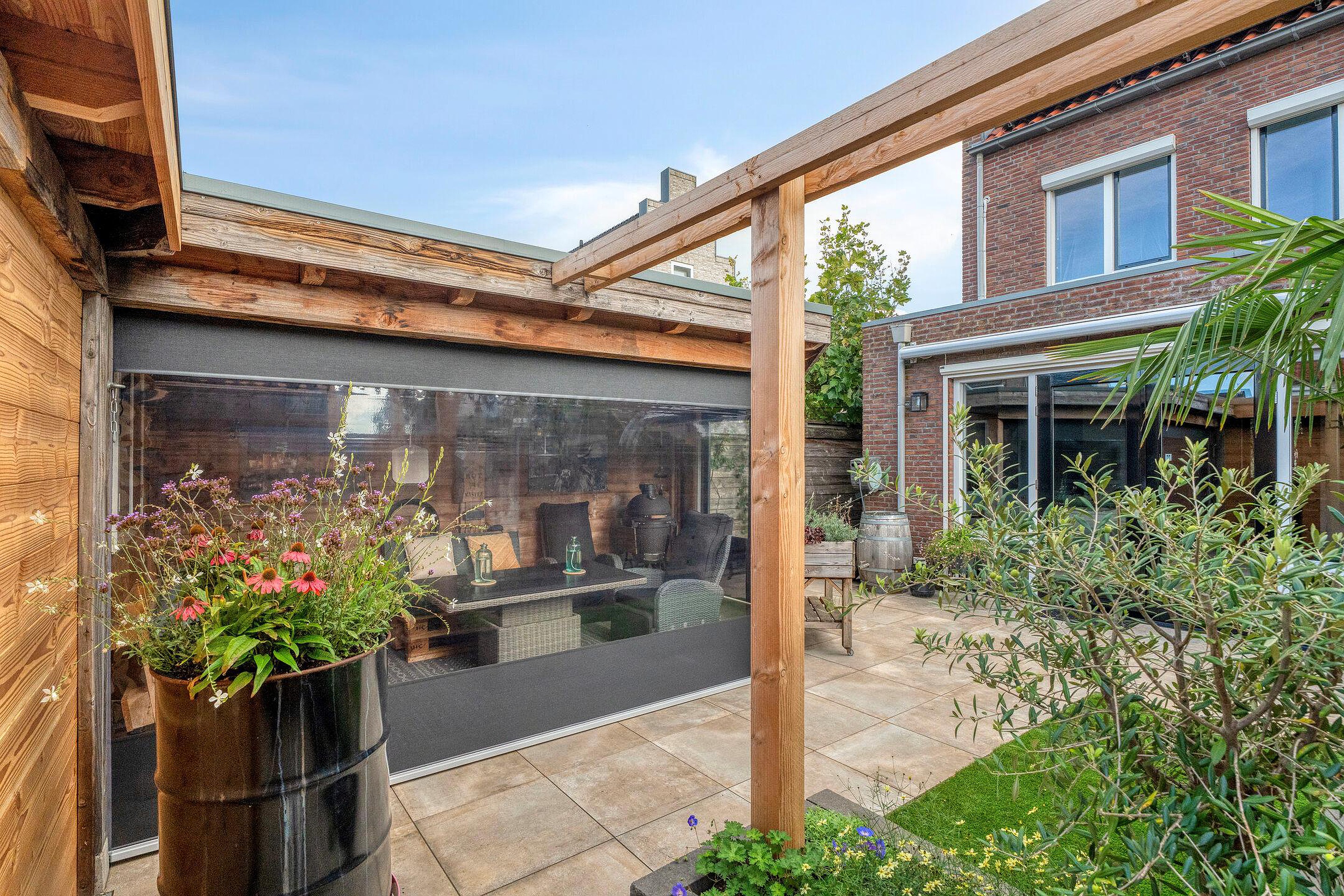 Achter in de tuin staat een royale overkapping met berging. Deze sfeervolle veranda is voorzien van een zitgedeelte en biedt de ideale plek om het hele jaar door te genieten van het buitenleven. Het overdekte terras is perfect geschikt voor gezellige avonden met vrienden of familie, en biedt tevens praktische ruimte voor een barbecue of buitenkeuken.