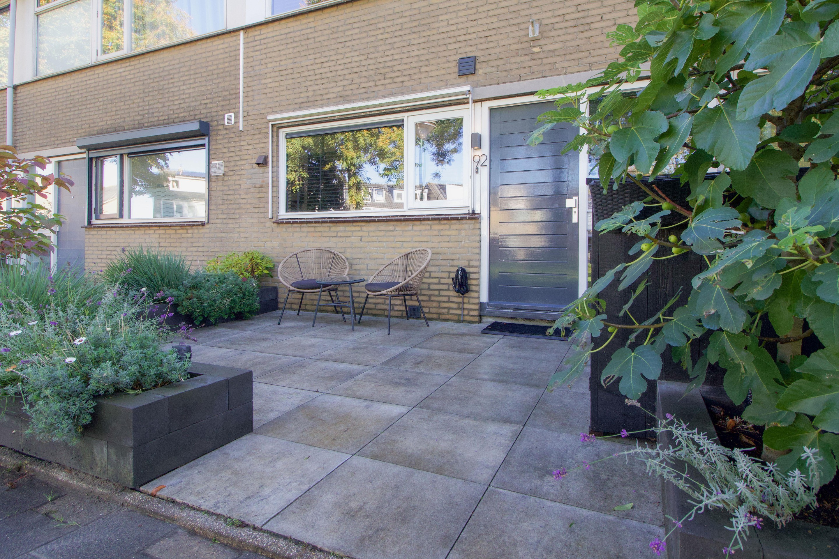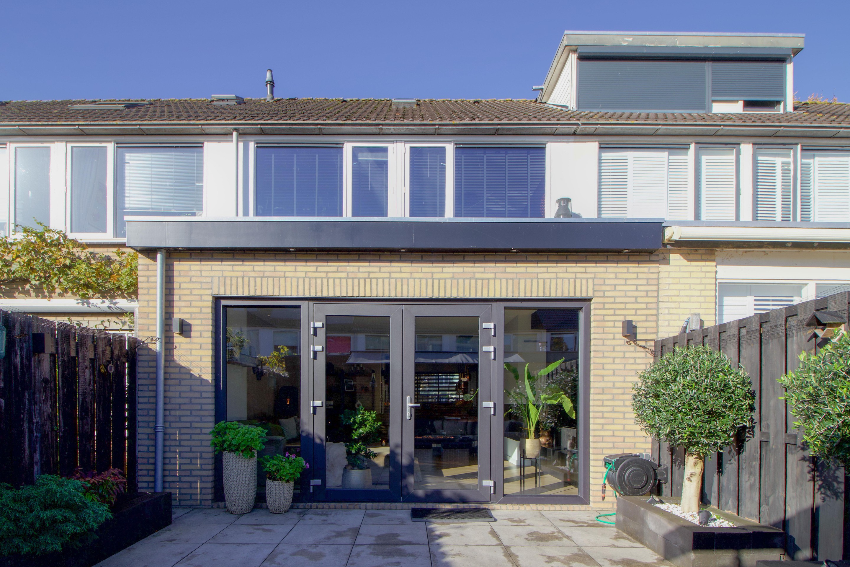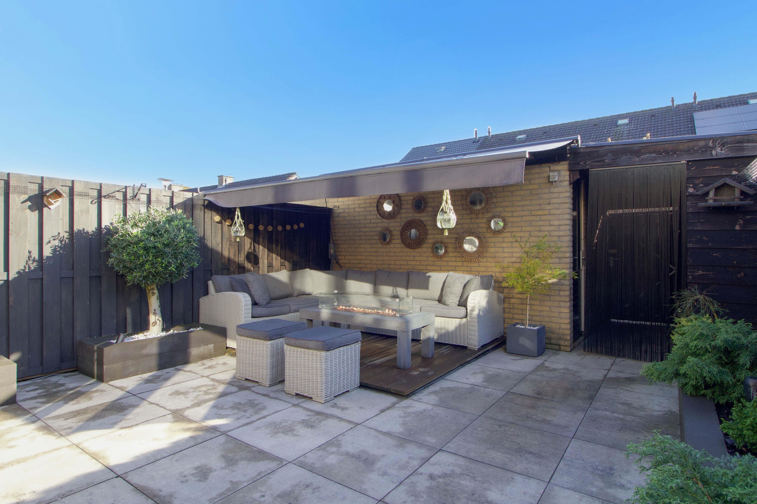De tuin is sfeervol ingericht met strakke plantenbakken, sierlijke beplanting en een vaste zithoek voorzien van een gashaardtafel en zonwering. Hierdoor is het ook op koelere avonden heerlijk vertoeven.
