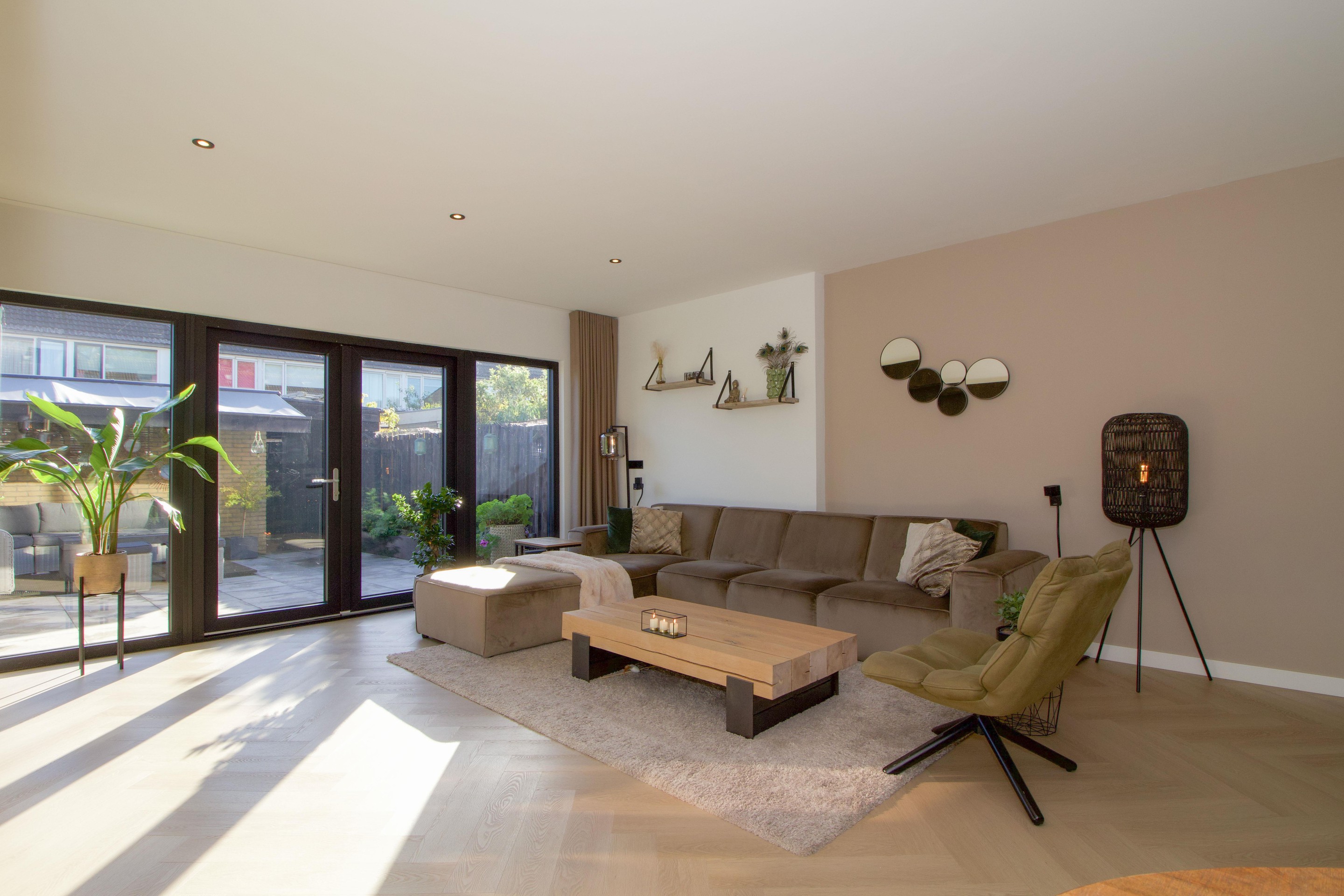 Aan de achterzijde van de woning bevindt zich de ruime woonkamer. De open indeling zorgt voor een aangename verbinding tussen koken, eten en wonen. De woonkamer biedt volop ruimte voor een comfortabele zithoek en heeft dubbele openslaande deuren naar de tuin, waardoor binnen en buiten mooi in elkaar overlopen.
