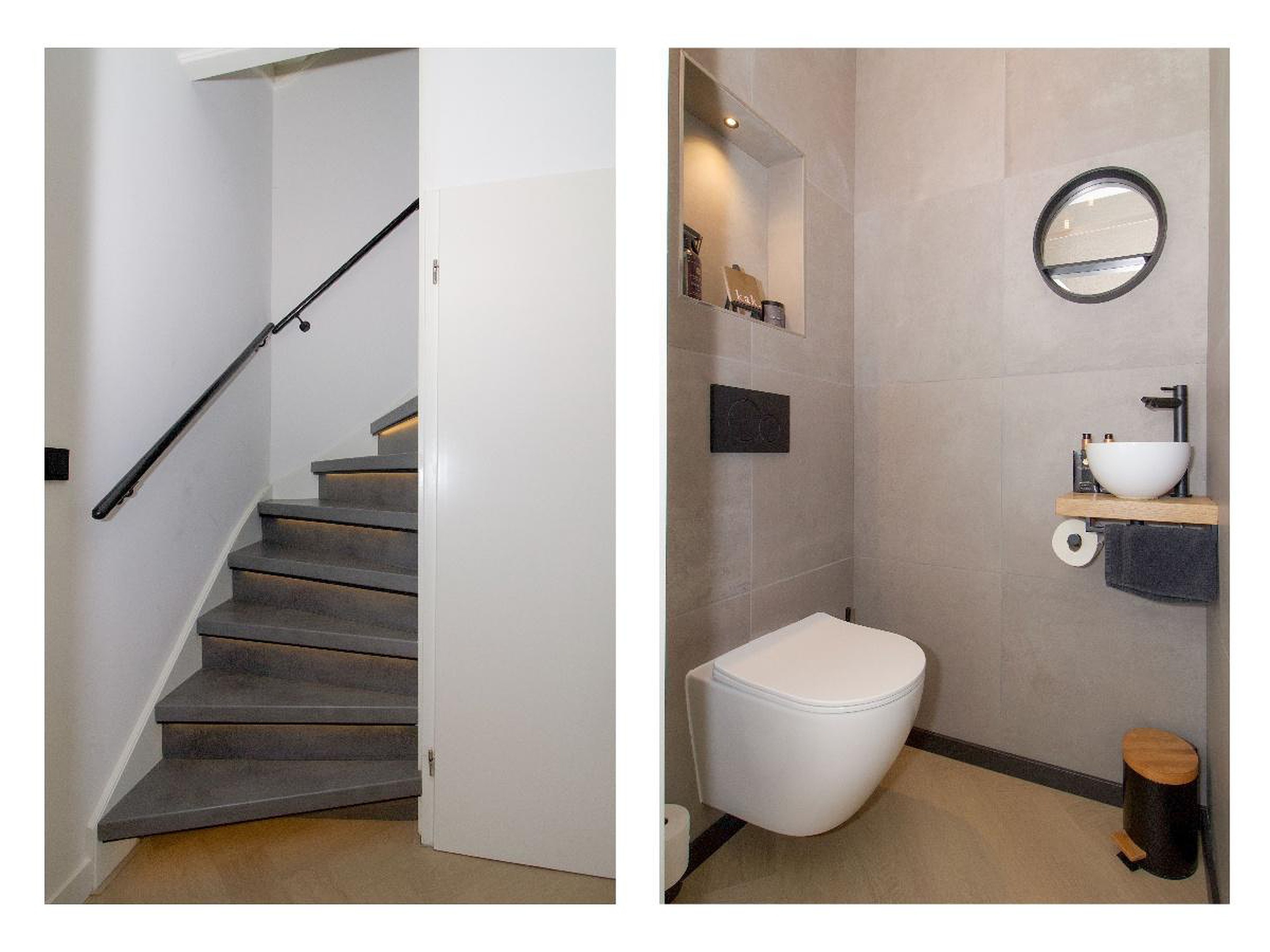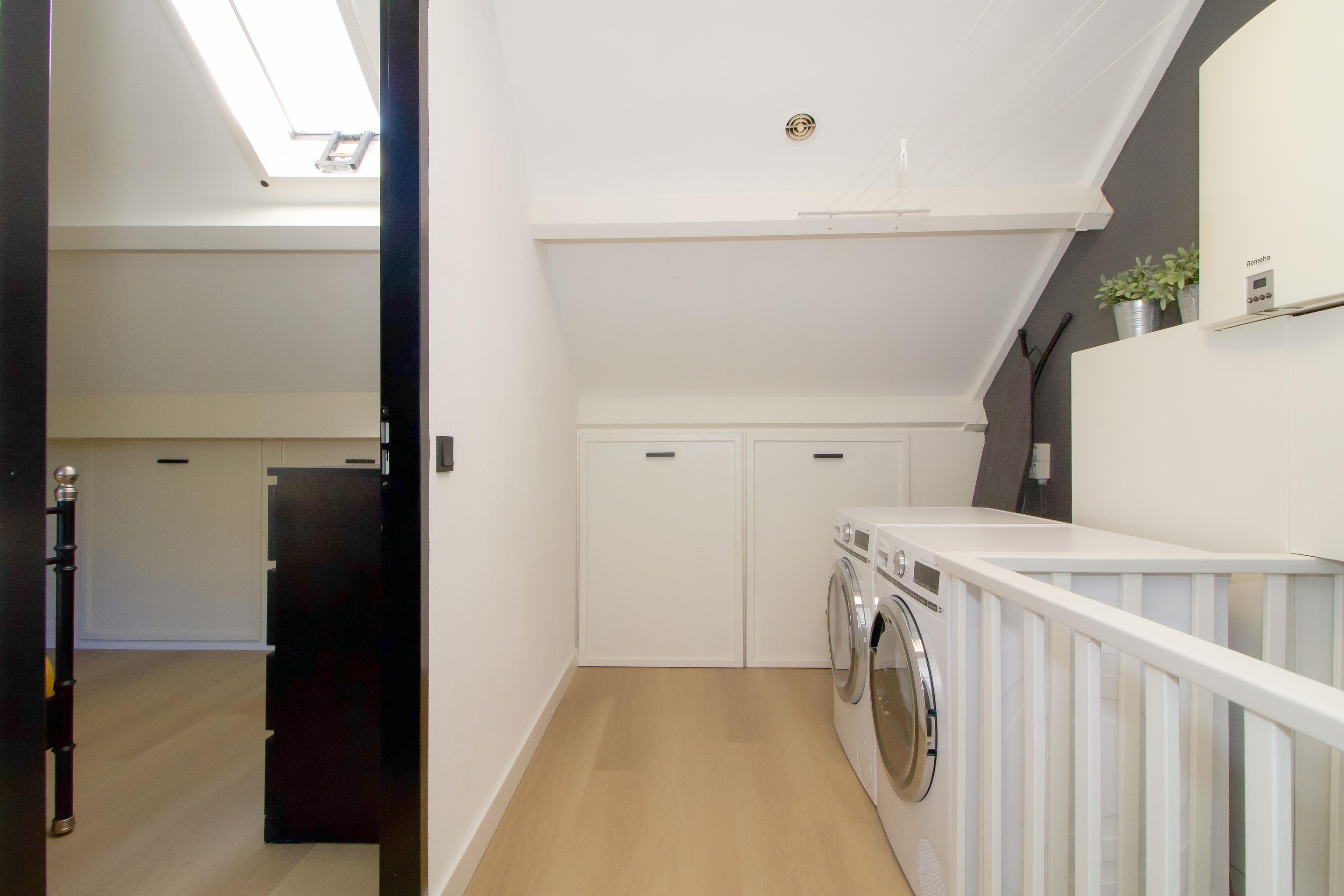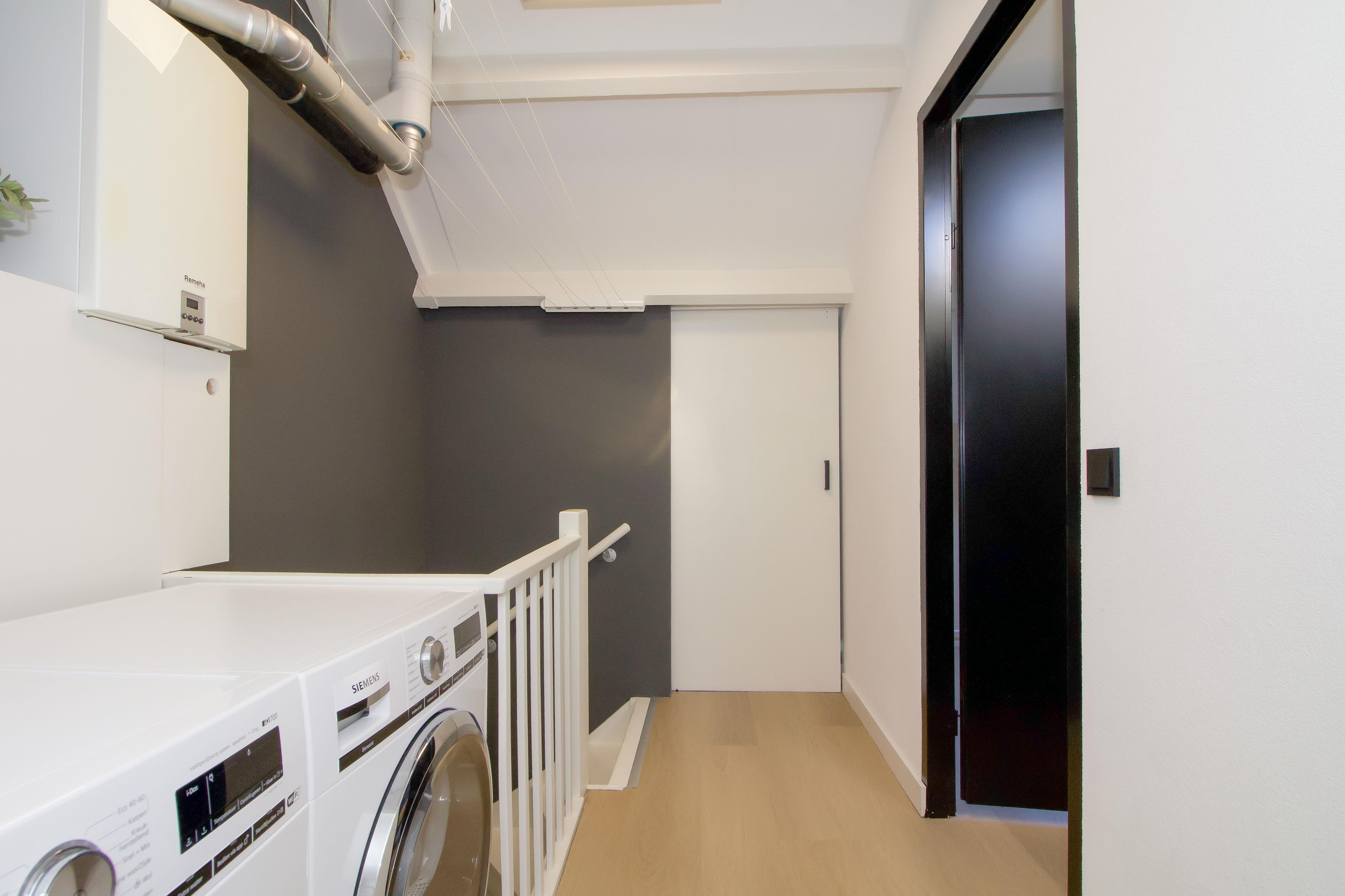 Op de overloop is ruimte voor de wasmachine en droger, keurig weggewerkt in een aparte hoek.