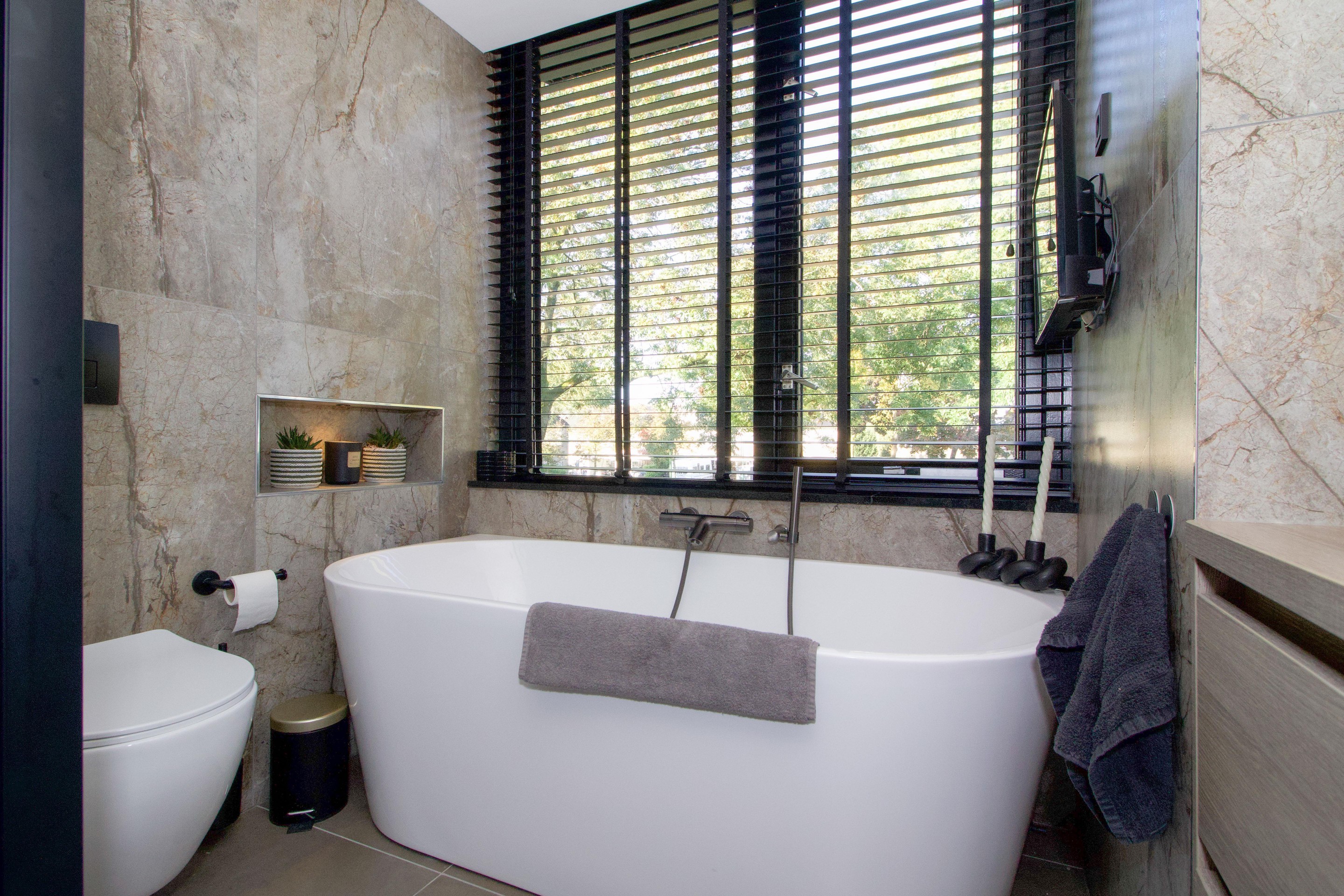 De badkamer is centraal gelegen en voorzien van een moderne inrichting met een wastafelmeubel, toilet, douche en ligbad.