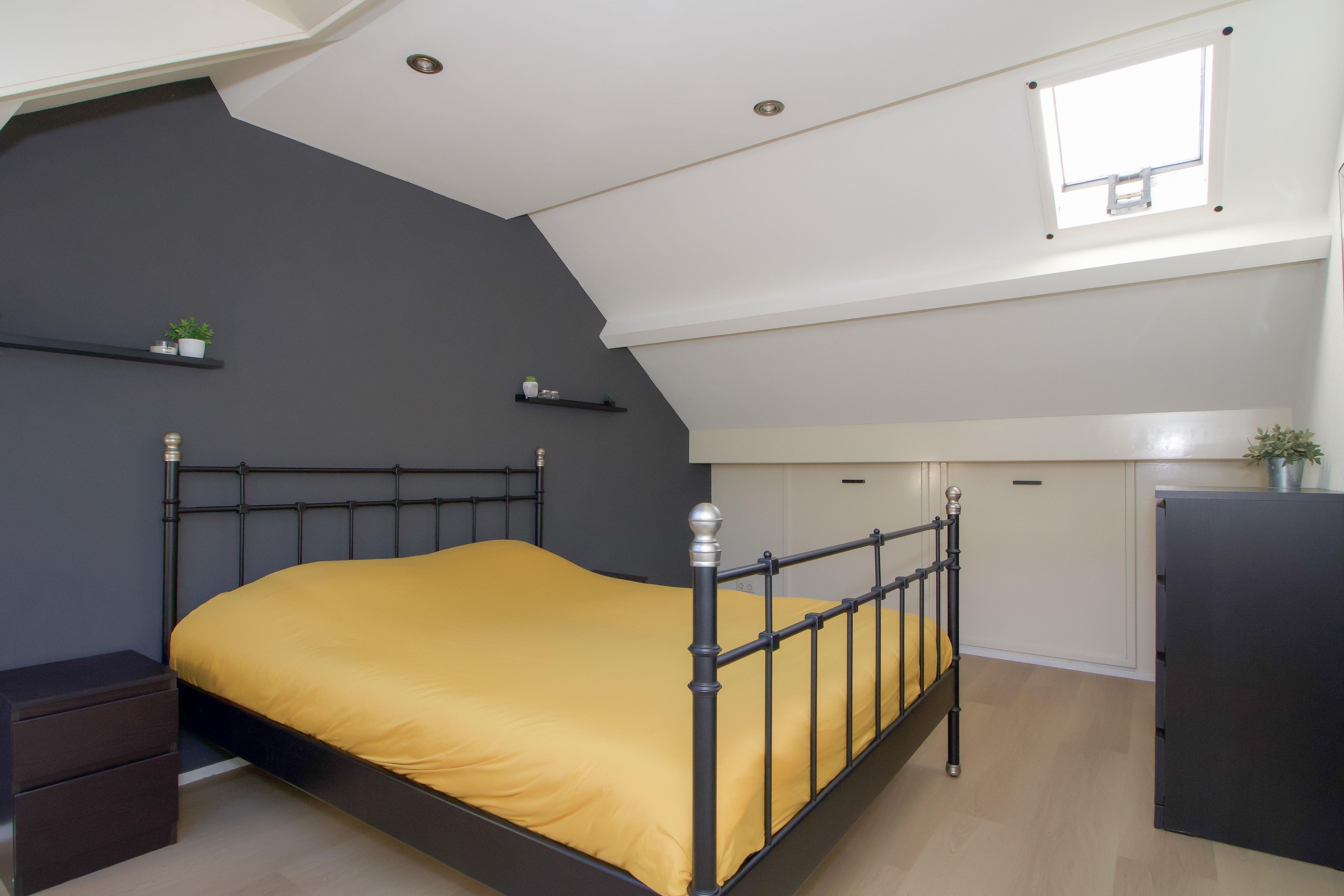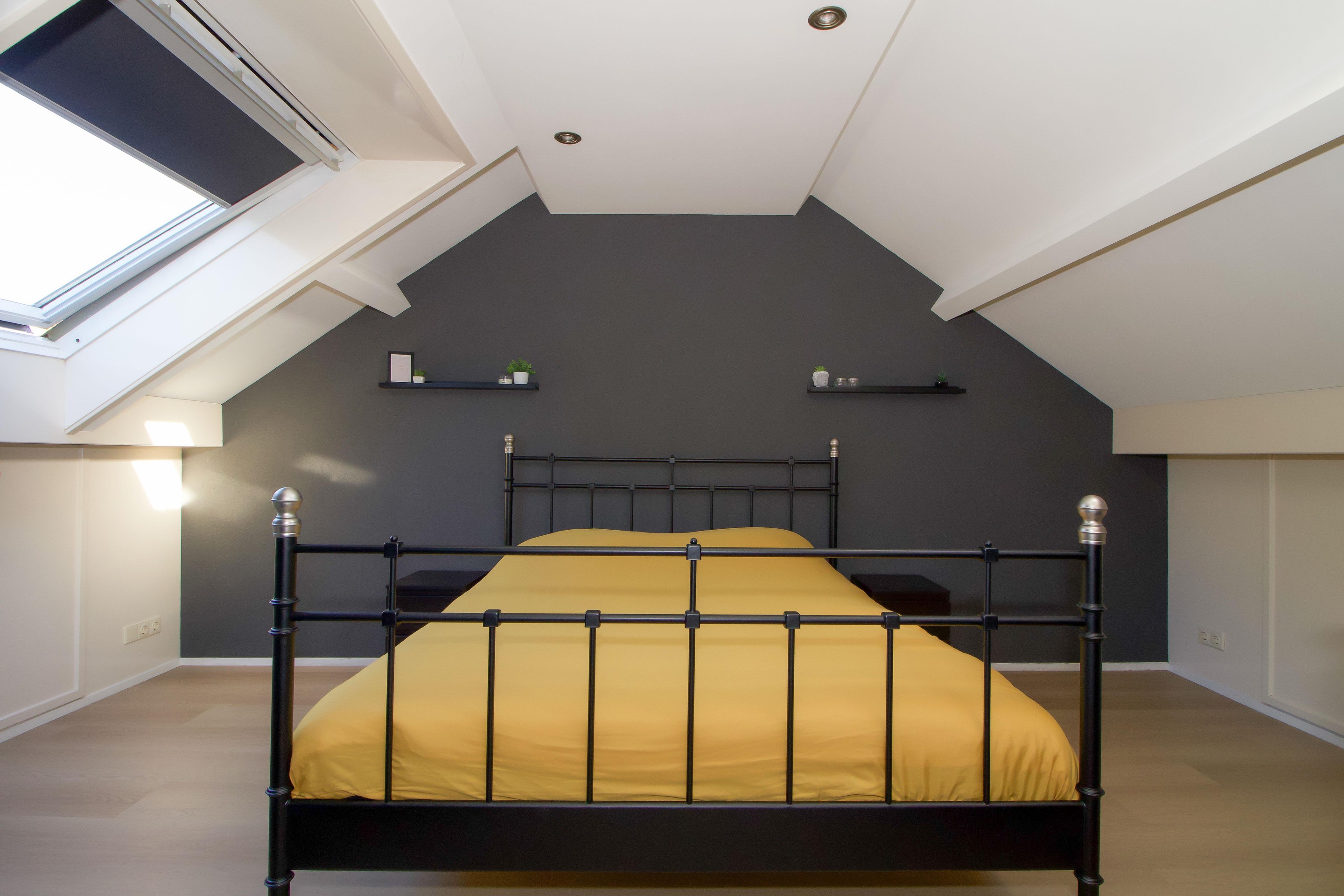 Tweede verdieping Via de vaste trap bereik je de tweede verdieping, die is ingericht als ruime slaapkamer. Dankzij de rechte gevels en de aanwezige dakramen is deze kamer licht en veelzijdig in gebruik welke ideaal is als ouderslaapkamer, werkkamer of hobbyruimte.