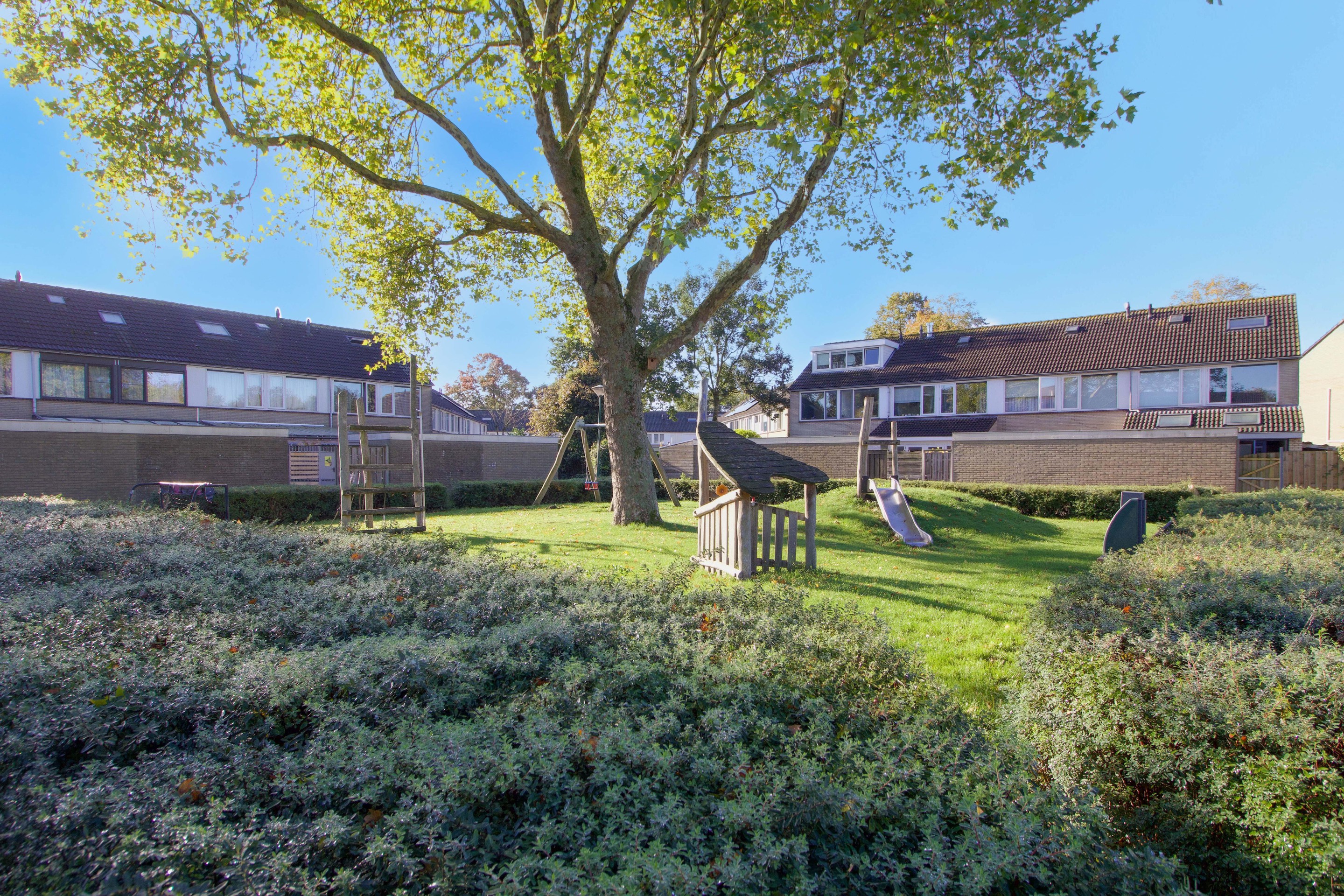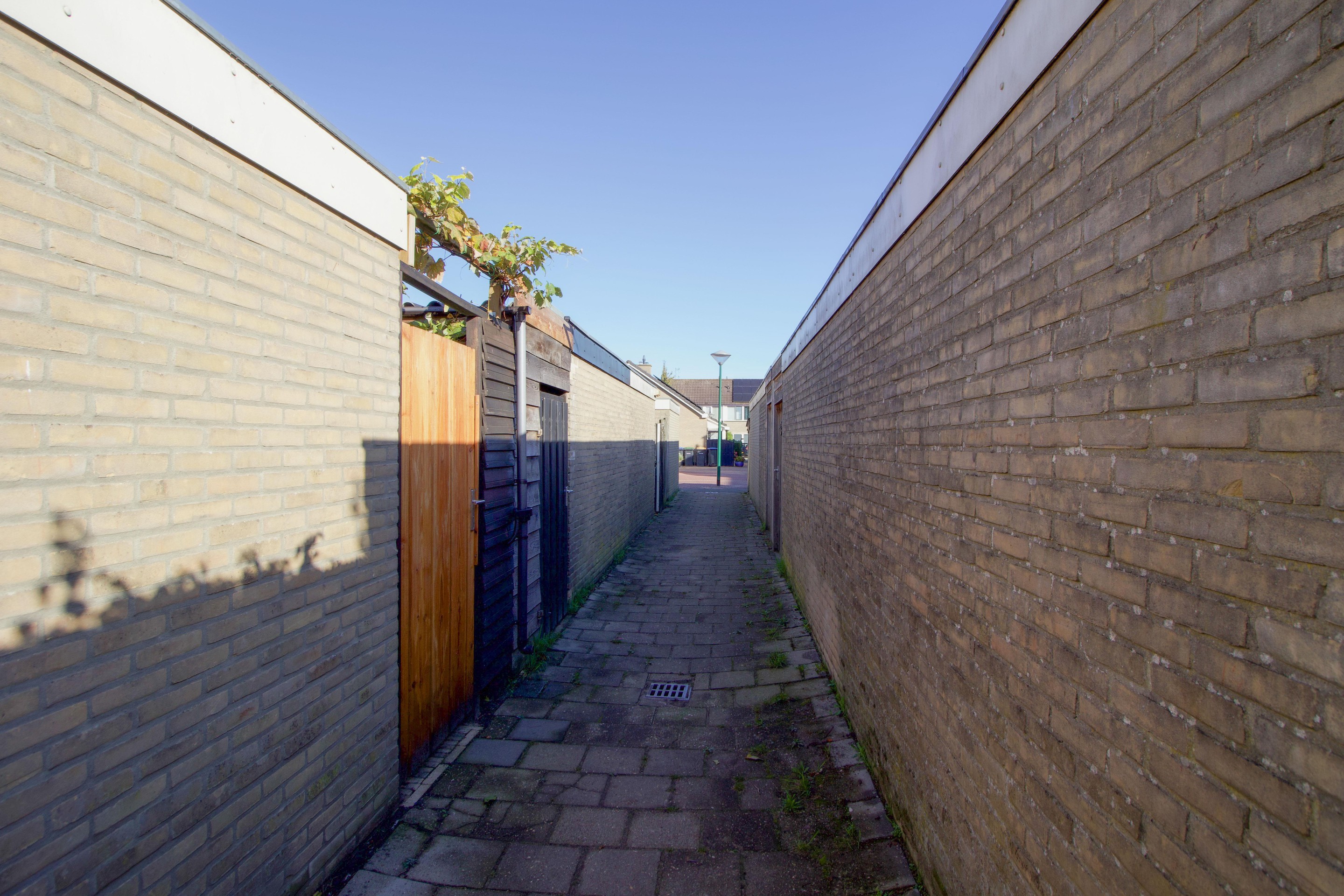 Achterin de tuin bevindt zich een houten berging, ideaal voor het opbergen van fietsen, tuingereedschap of de barbecue. Vanuit de berging is tevens de achterom bereikbaar, die uitkomt op een breed pad met directe toegang tot de straat — praktisch voor het buitenzetten van de afvalcontainers of het stallen van fietsen.