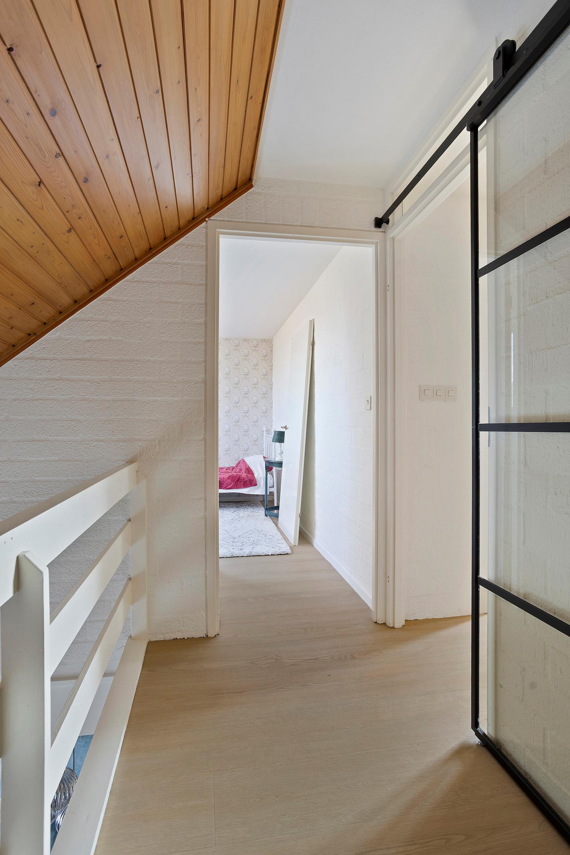 De eerste verdieping beschikt over drie ruime slaapkamers en een complete badkamer met douchecabine, wastafelmeubel en hangend toilet. Via de overloop met vide en zicht op de woonkamer bereikt u de kamers.