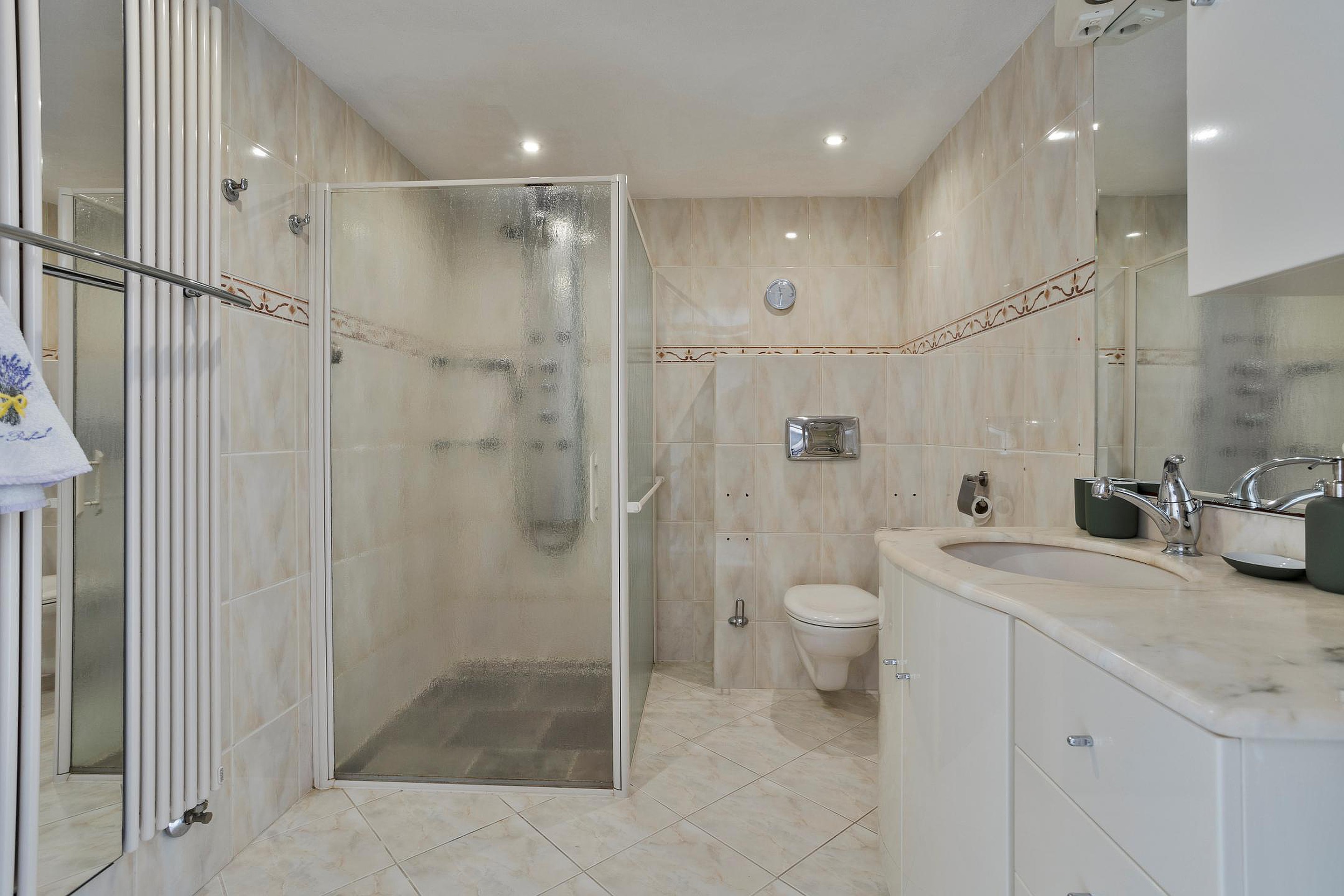 Op de 1e verdieping zijn in totaal 3 slaapkamers aanwezig en een badkamer met douchecabine, hangend toilet en wastafel met meubel, designradiator. Airconditioning aanwezig.