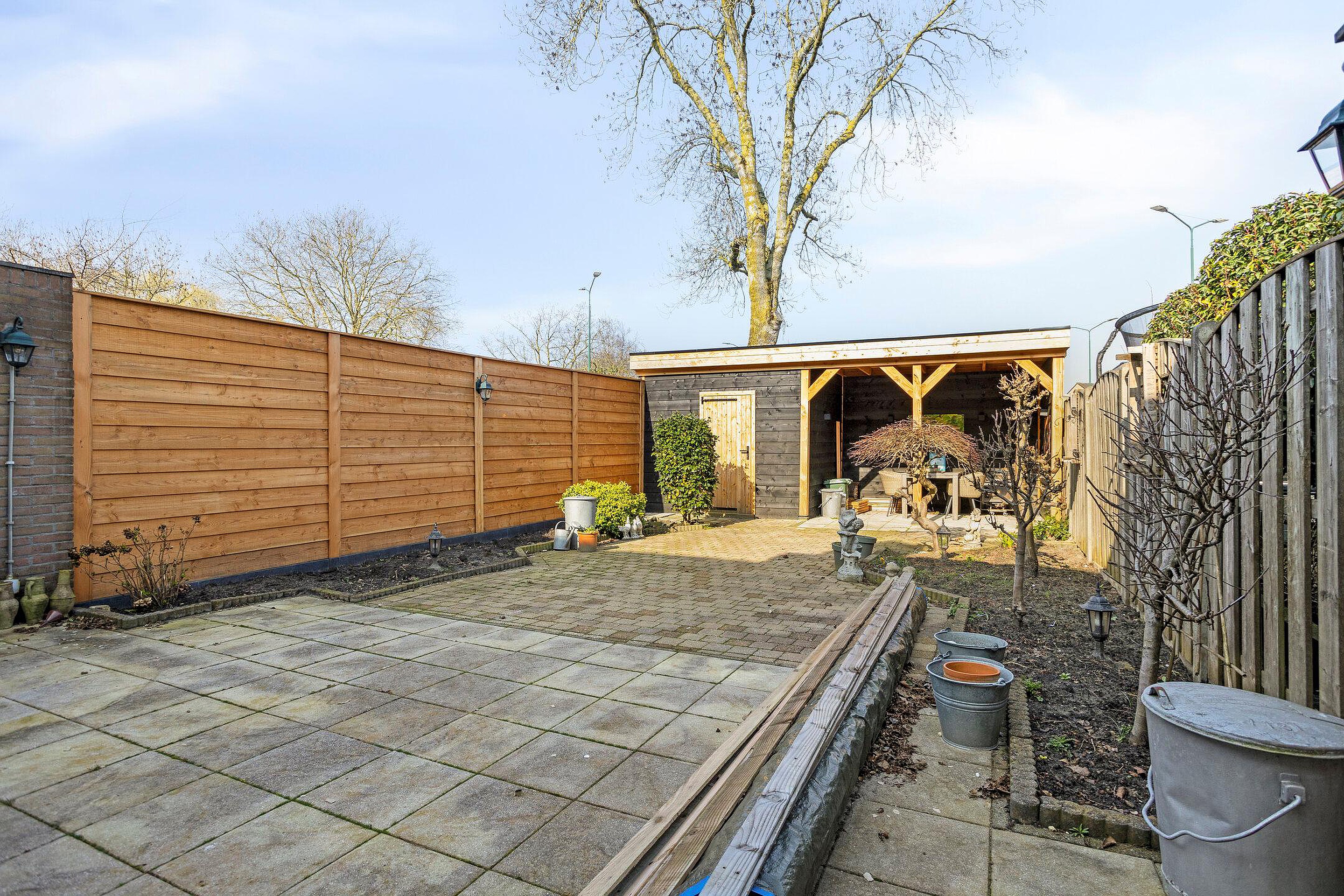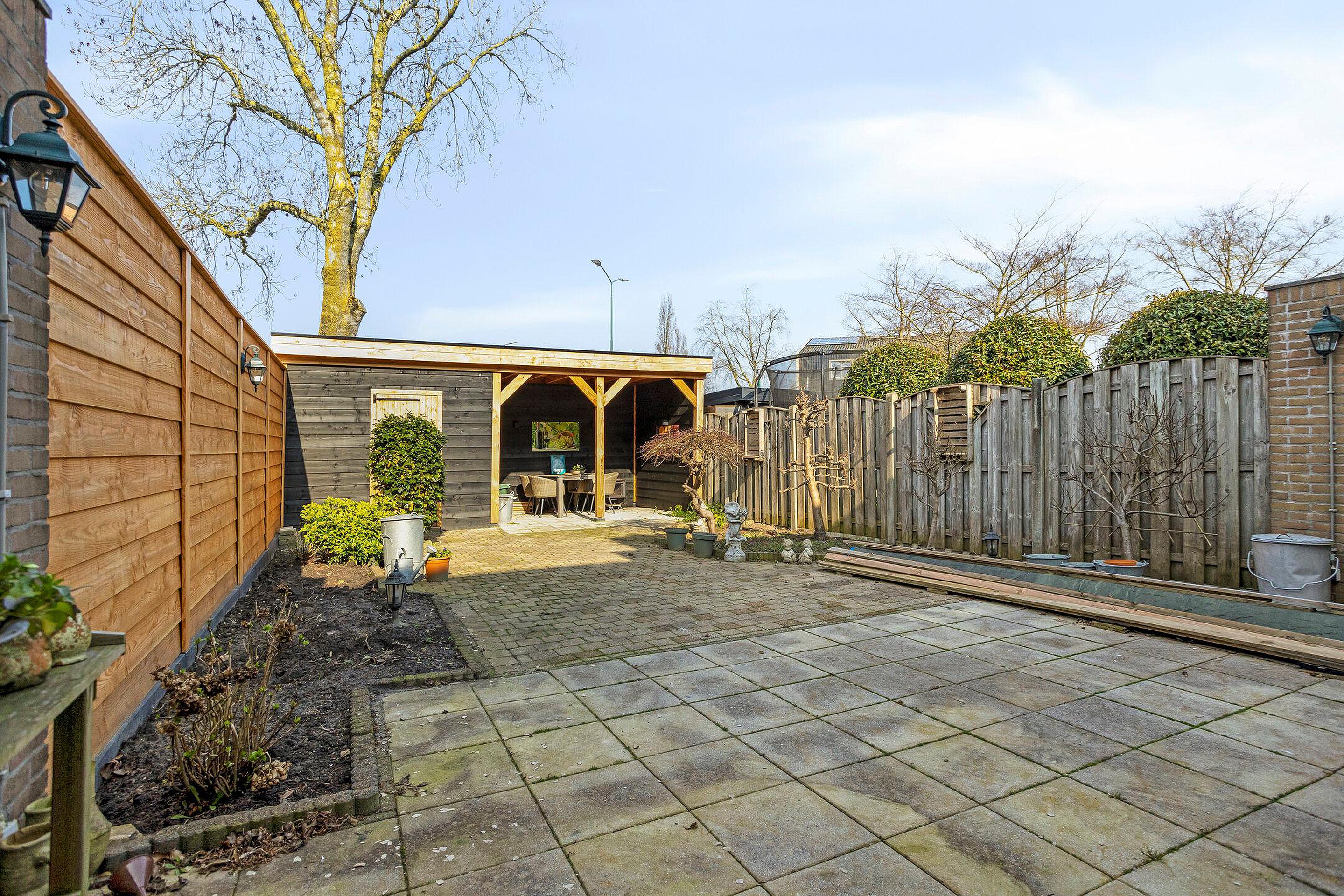 Achterin de tuin bevindt zich een praktische overkapping met aangrenzende schuur, ideaal voor het opbergen van fietsen en tuingereedschap of het creëren van een gezellige zitplek. Daarnaast is er een achterom die toegang biedt tot het achtergelegen voetpad, wat extra gemak geeft voor bijvoorbeeld fietsen.