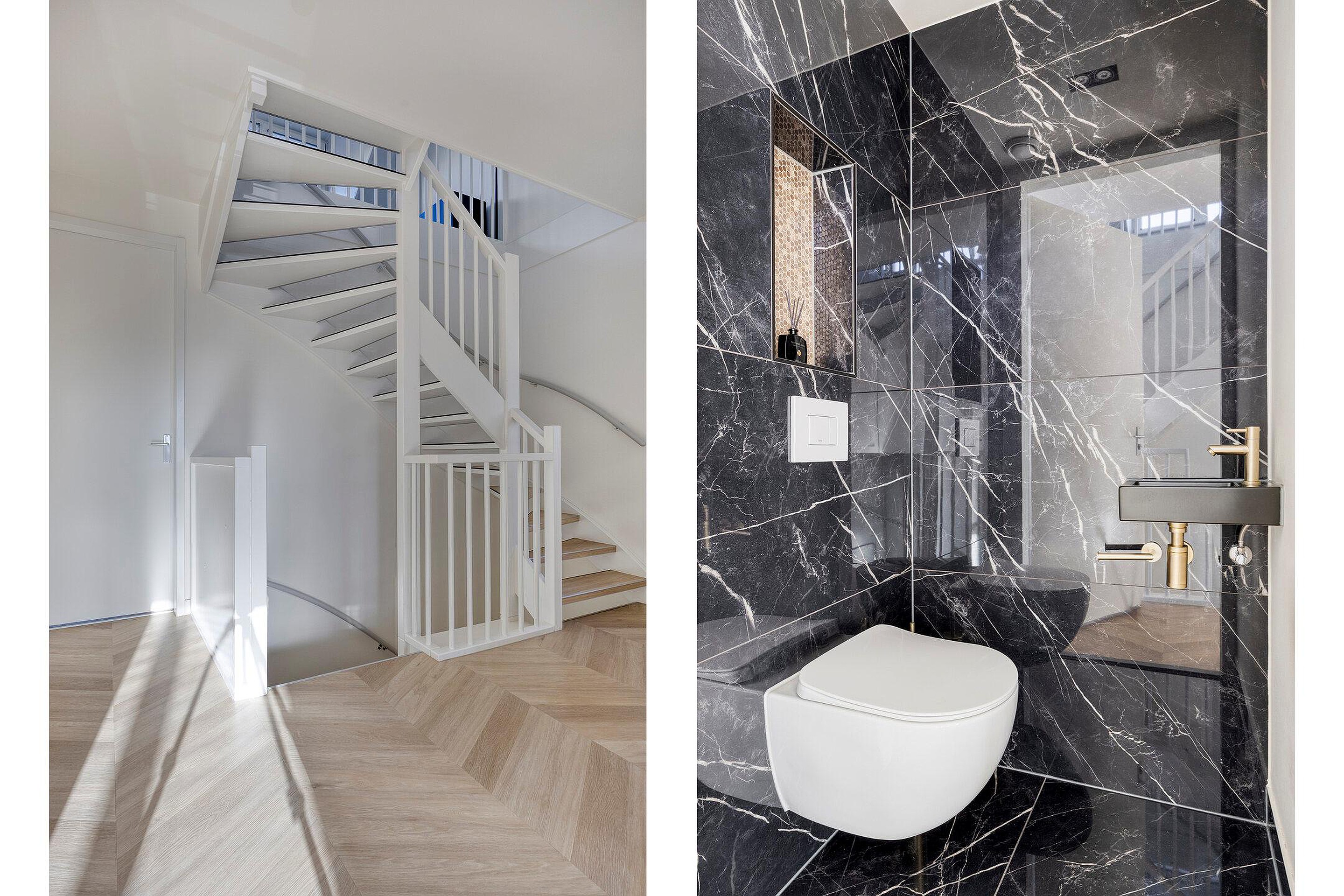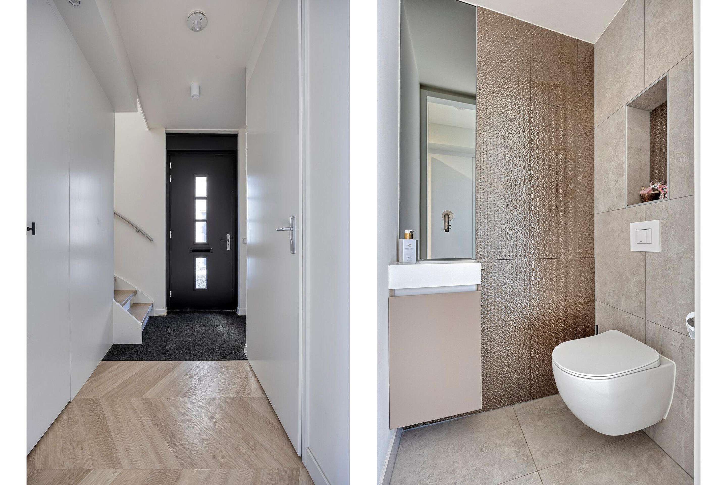 Op de begane grond vindt u tevens een moderne toiletruimte met hangend toilet en fontein. Over de gehele begane grond ligt een warme en stijlvolle PVC-vloer in Hongaarse punt, perfect gecombineerd met vloerverwarming.