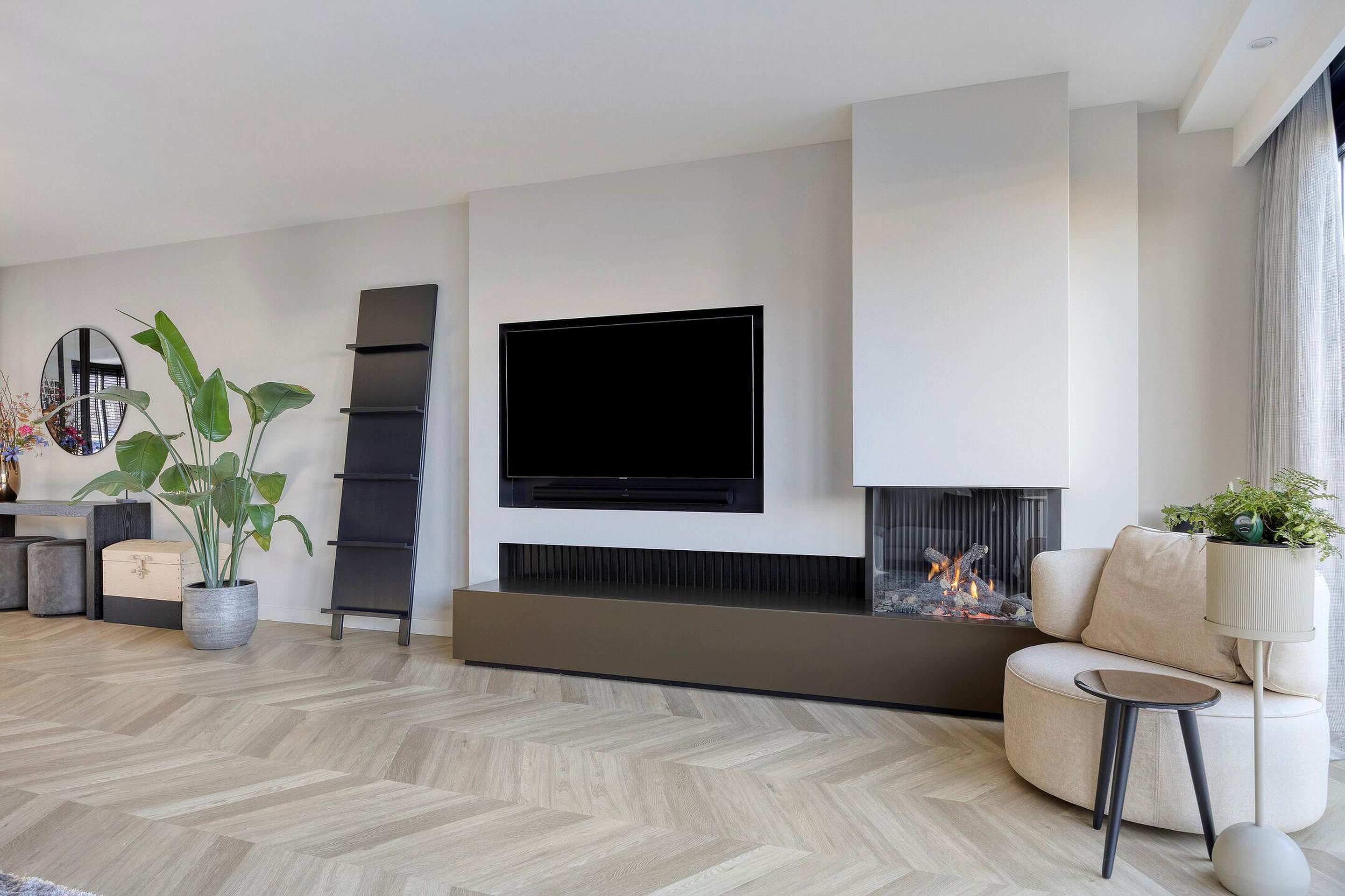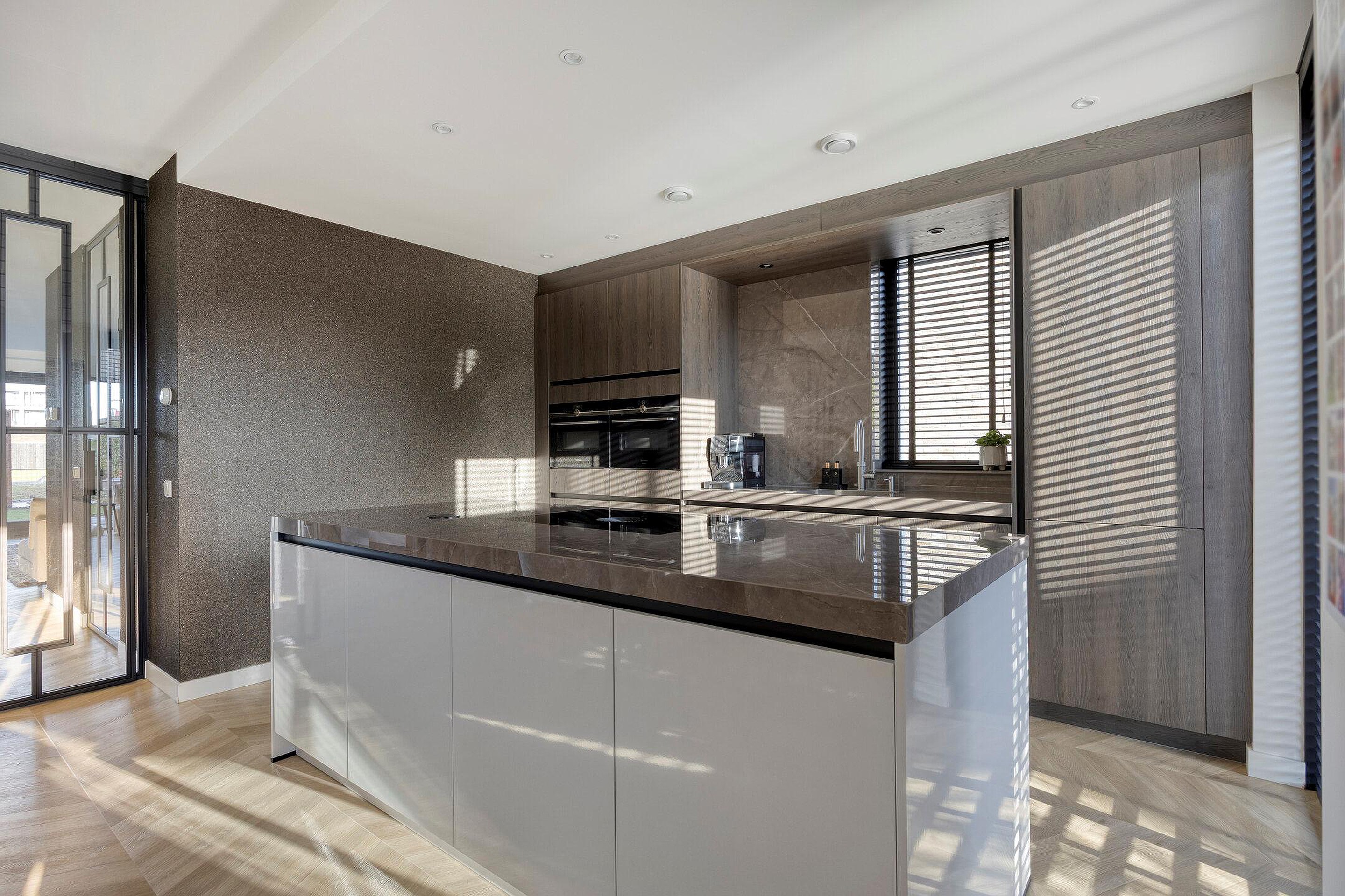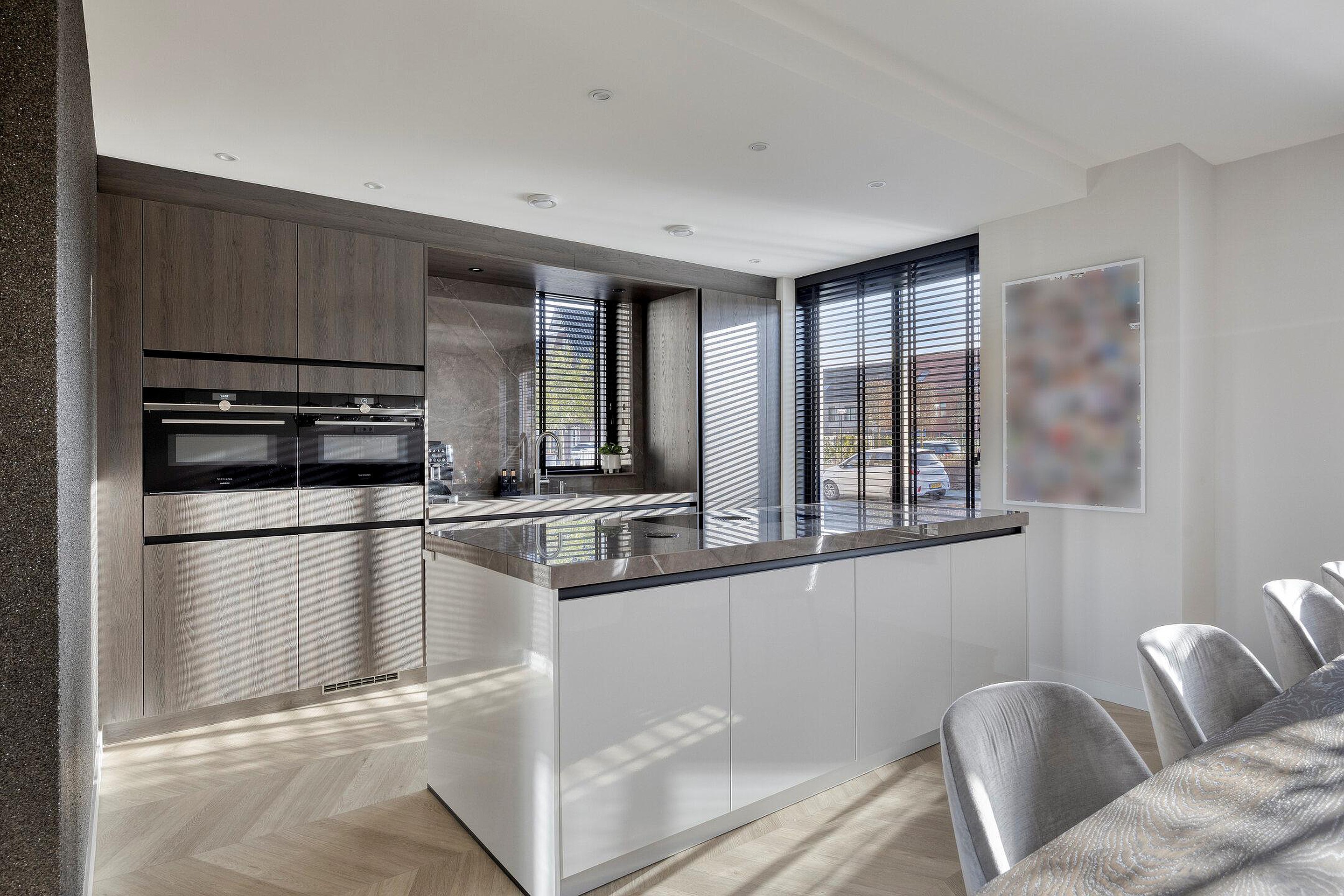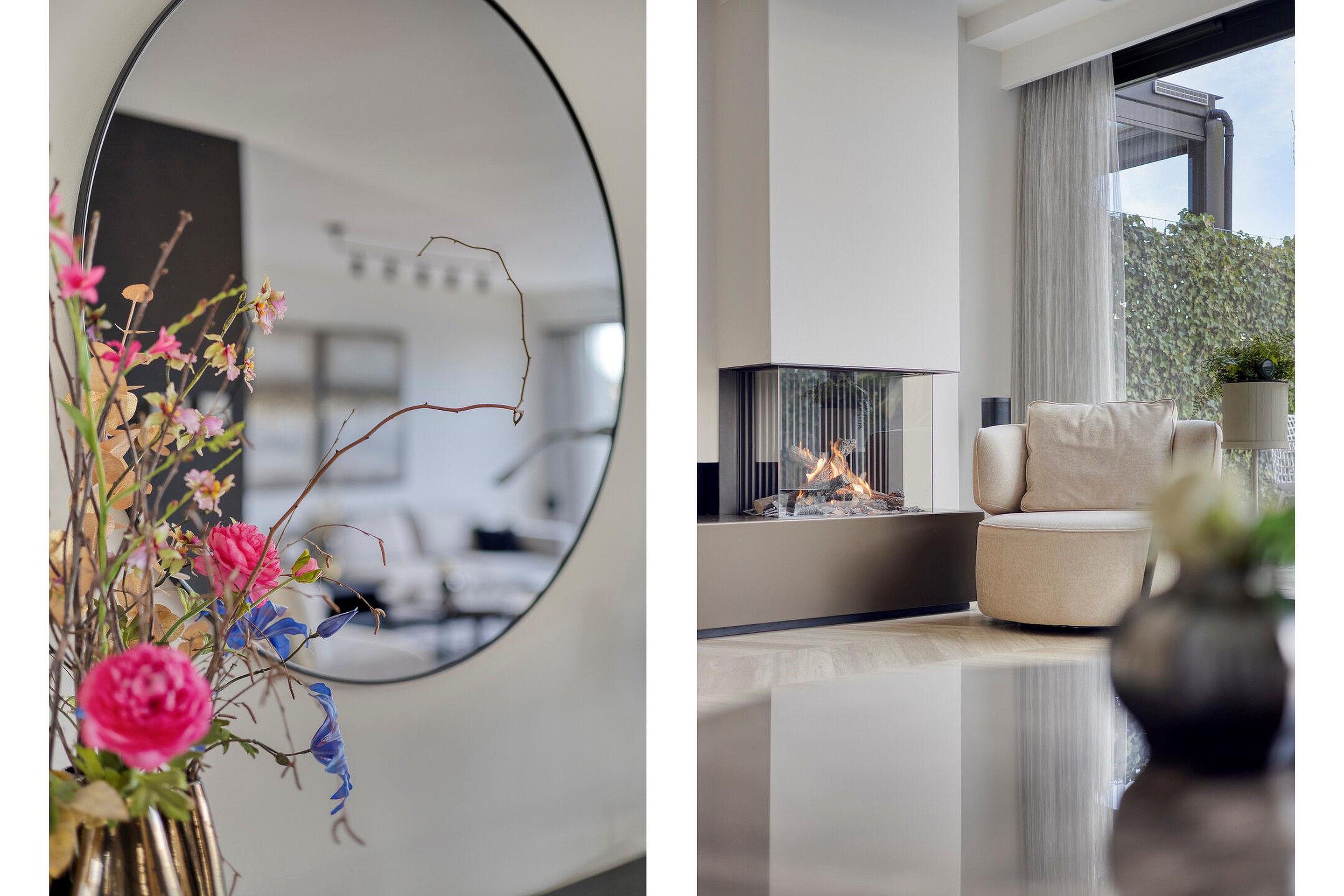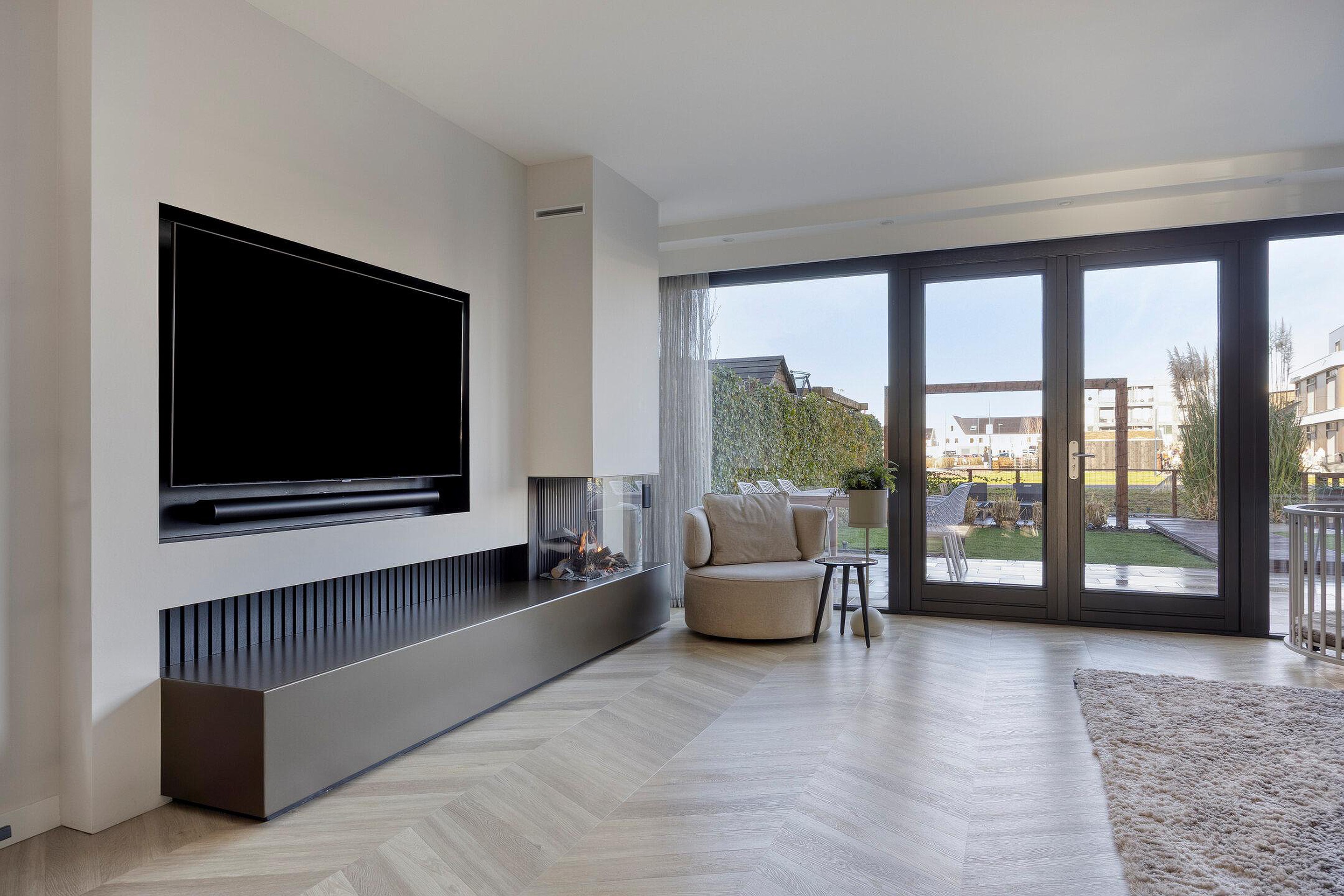 De uitgebouwde en tuingerichte woonkamer is licht en sfeervol en beschikt over een fraaie gashaard (propaangas) en directe toegang tot de fraaie en sfeervolle achtertuin. De woonkamer is door stalen schuifdeuren gescheiden van de royale woon-leefkeuken met modern kookeiland en diverse hoogwaardige Siemens Studioline inbouwapparatuur, ideaal voor kookliefhebbers en gezellige momenten met familie en vrienden.