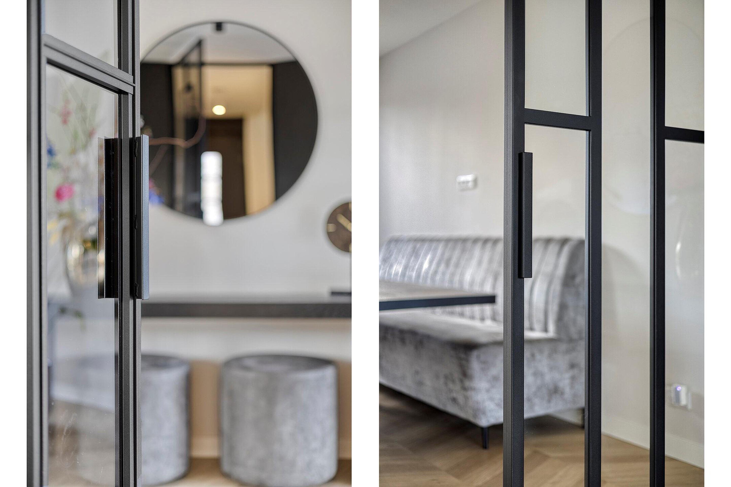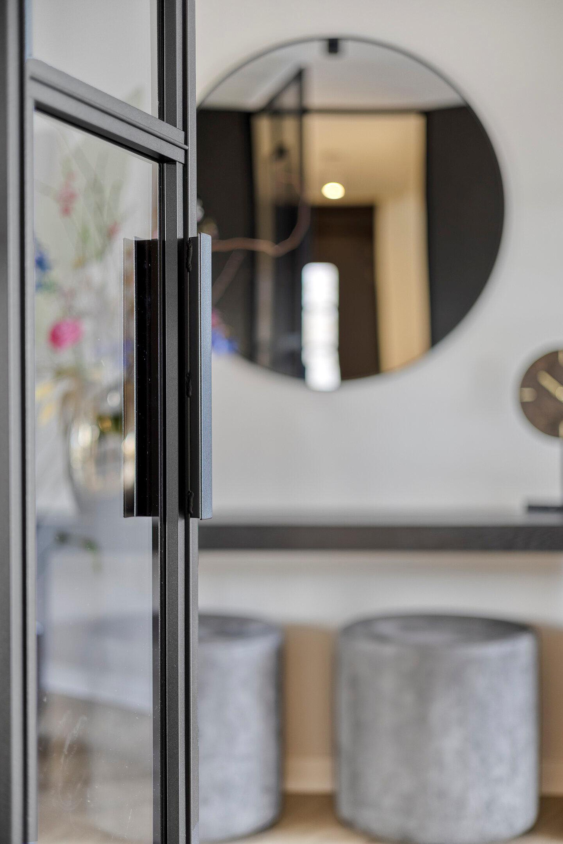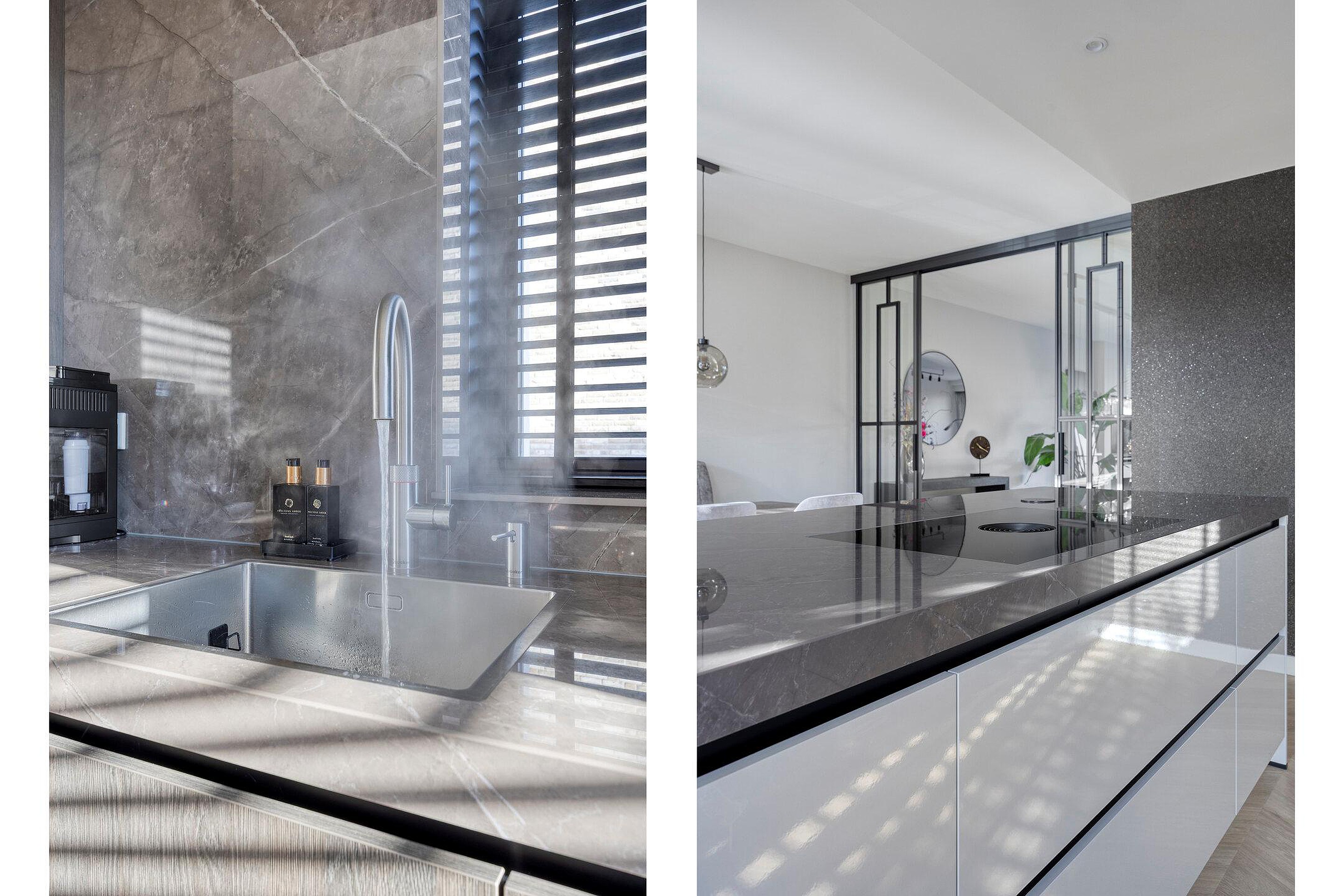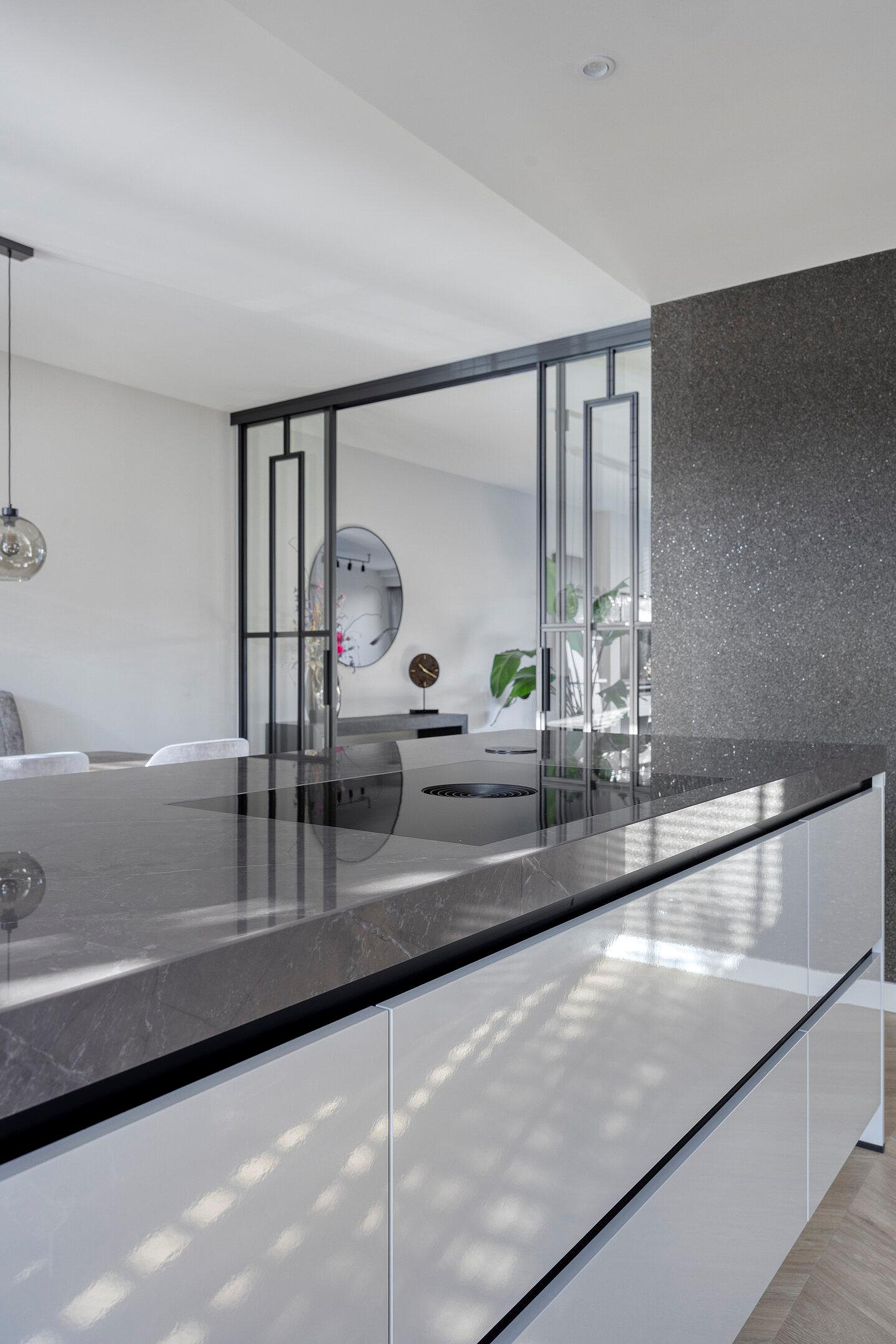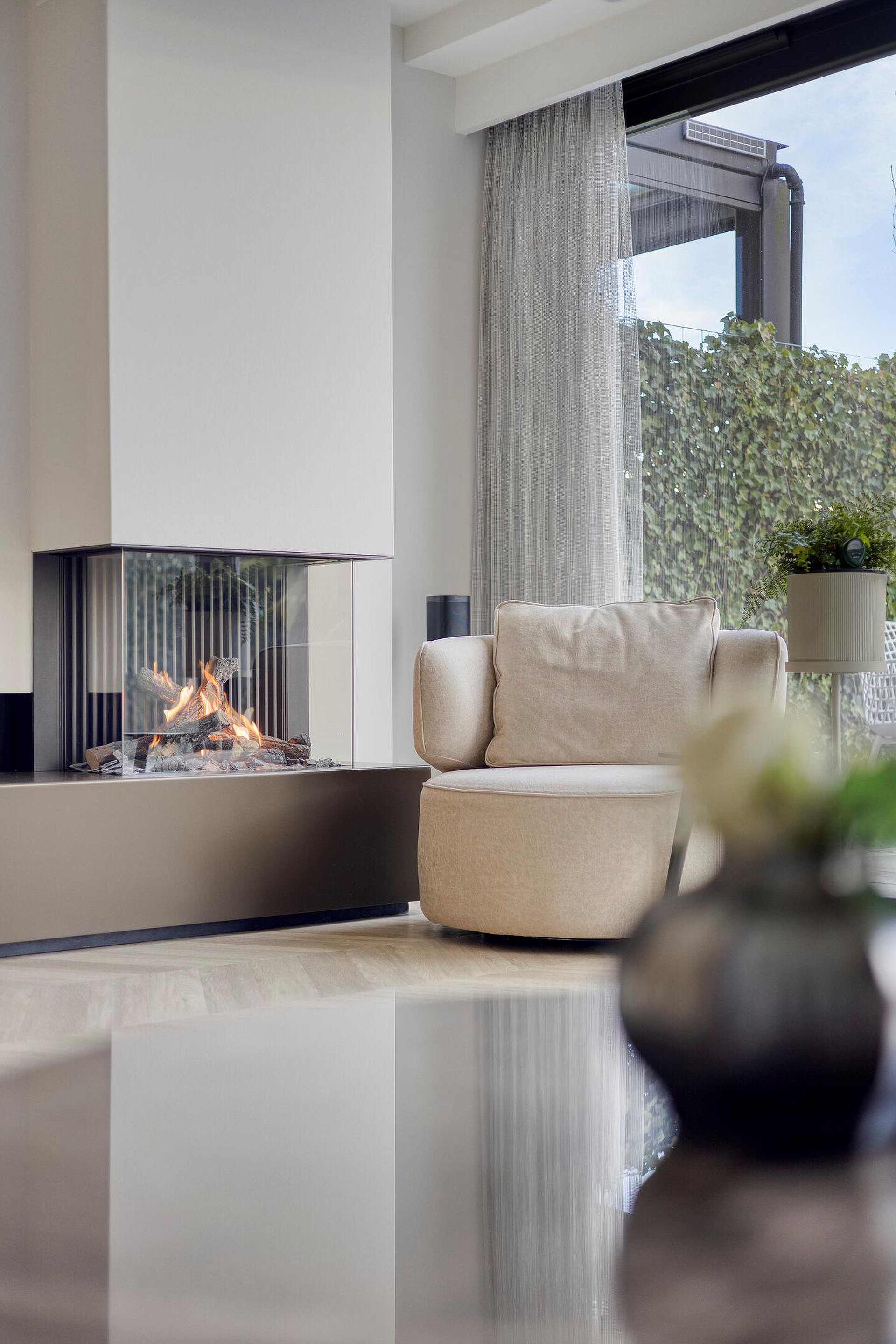 De uitgebouwde en tuingerichte woonkamer is licht en sfeervol en beschikt over een fraaie gashaard (propaangas) en directe toegang tot de fraaie en sfeervolle achtertuin. De woonkamer is door stalen schuifdeuren gescheiden van de royale woon-leefkeuken met modern kookeiland en diverse hoogwaardige Siemens Studioline inbouwapparatuur, ideaal voor kookliefhebbers en gezellige momenten met familie en vrienden.