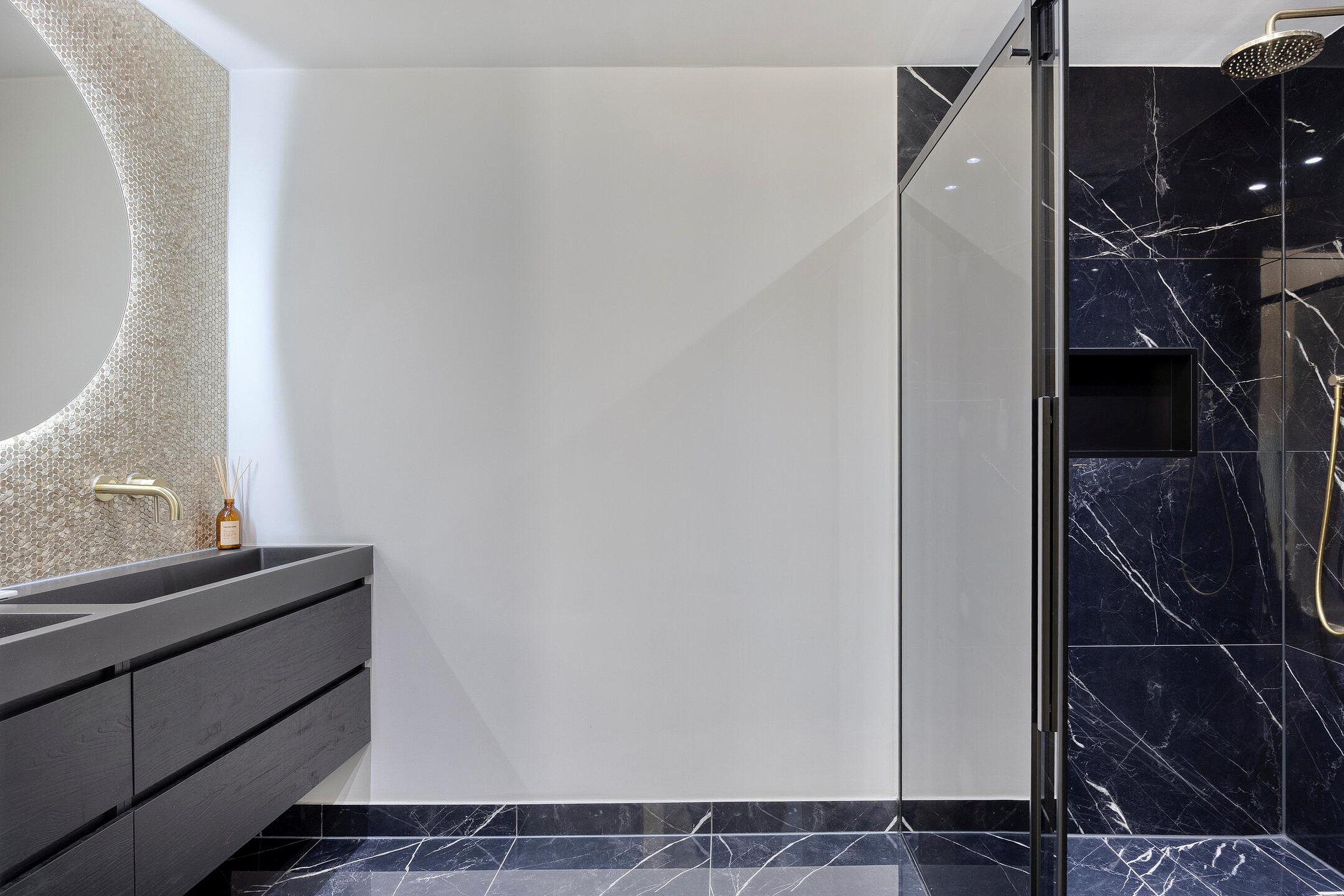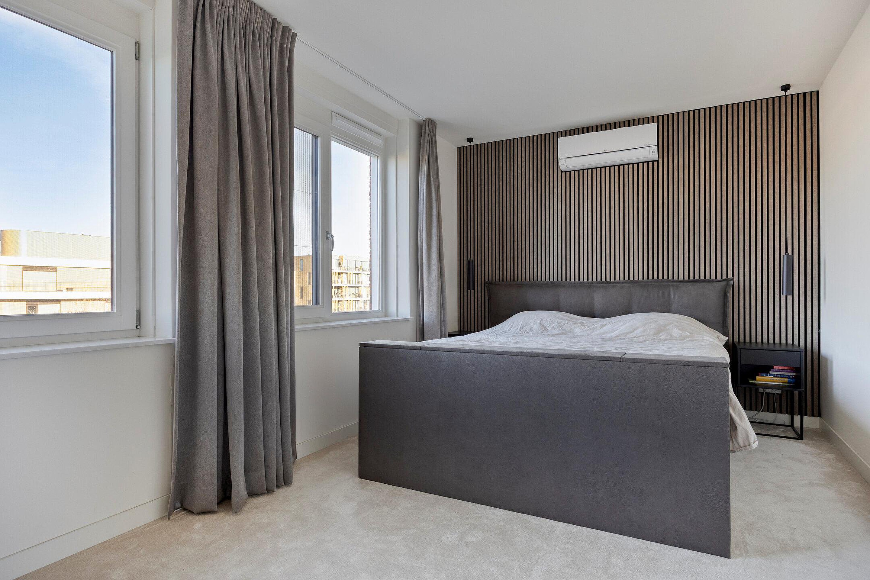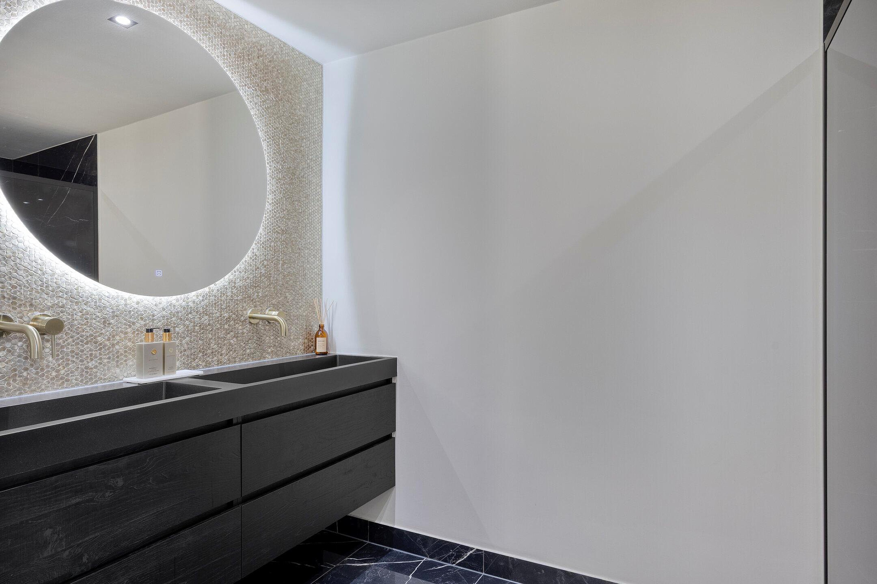 Overloop met separaat toilet. Drie ruime slaapkamers, waarvan de ouderslaapkamer is voorzien van airconditioning. Moderne badkamer met dubbele wastafel en royale inloopdouche met regen- en handdouche. Vloerverwarming op de gehele verdieping.