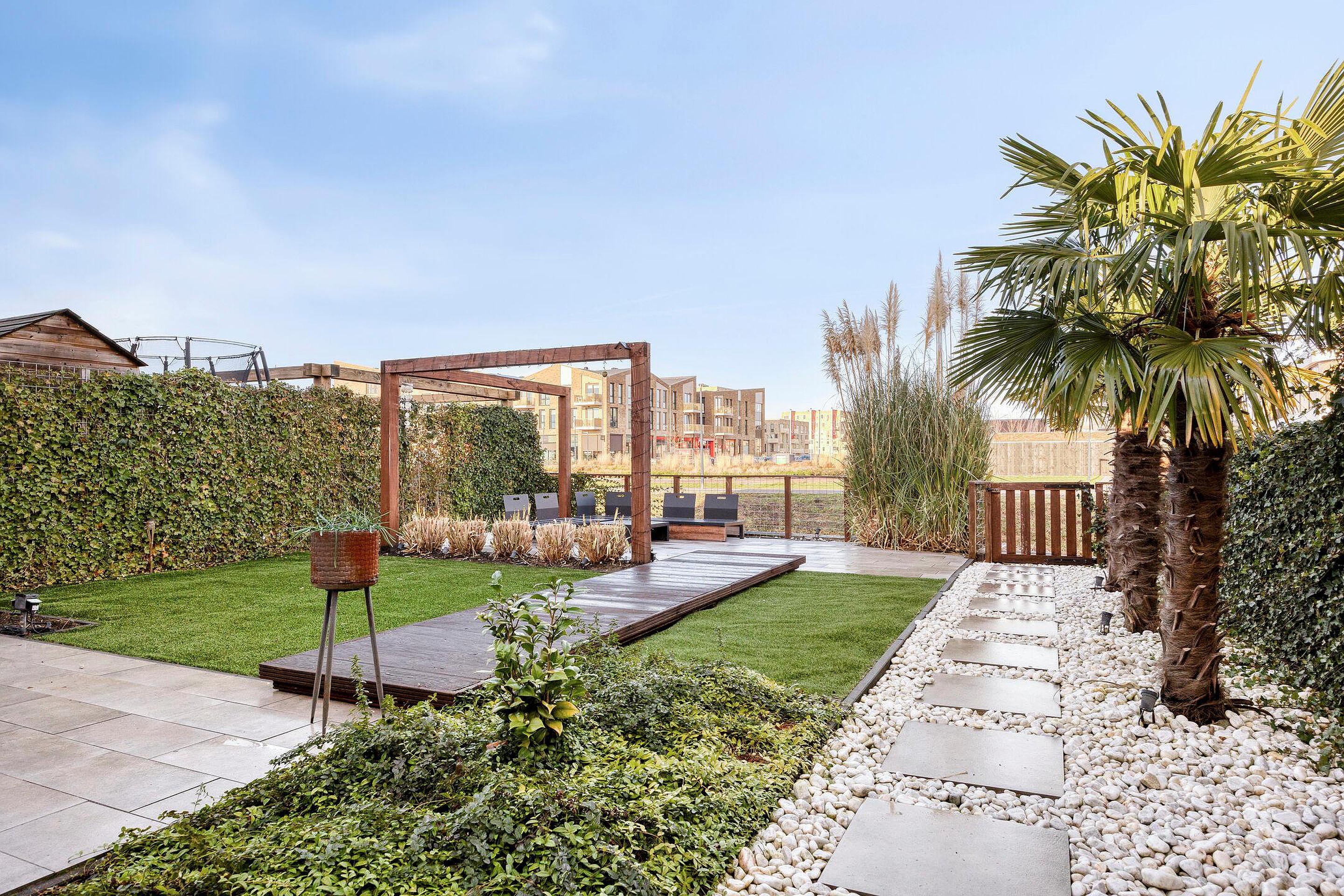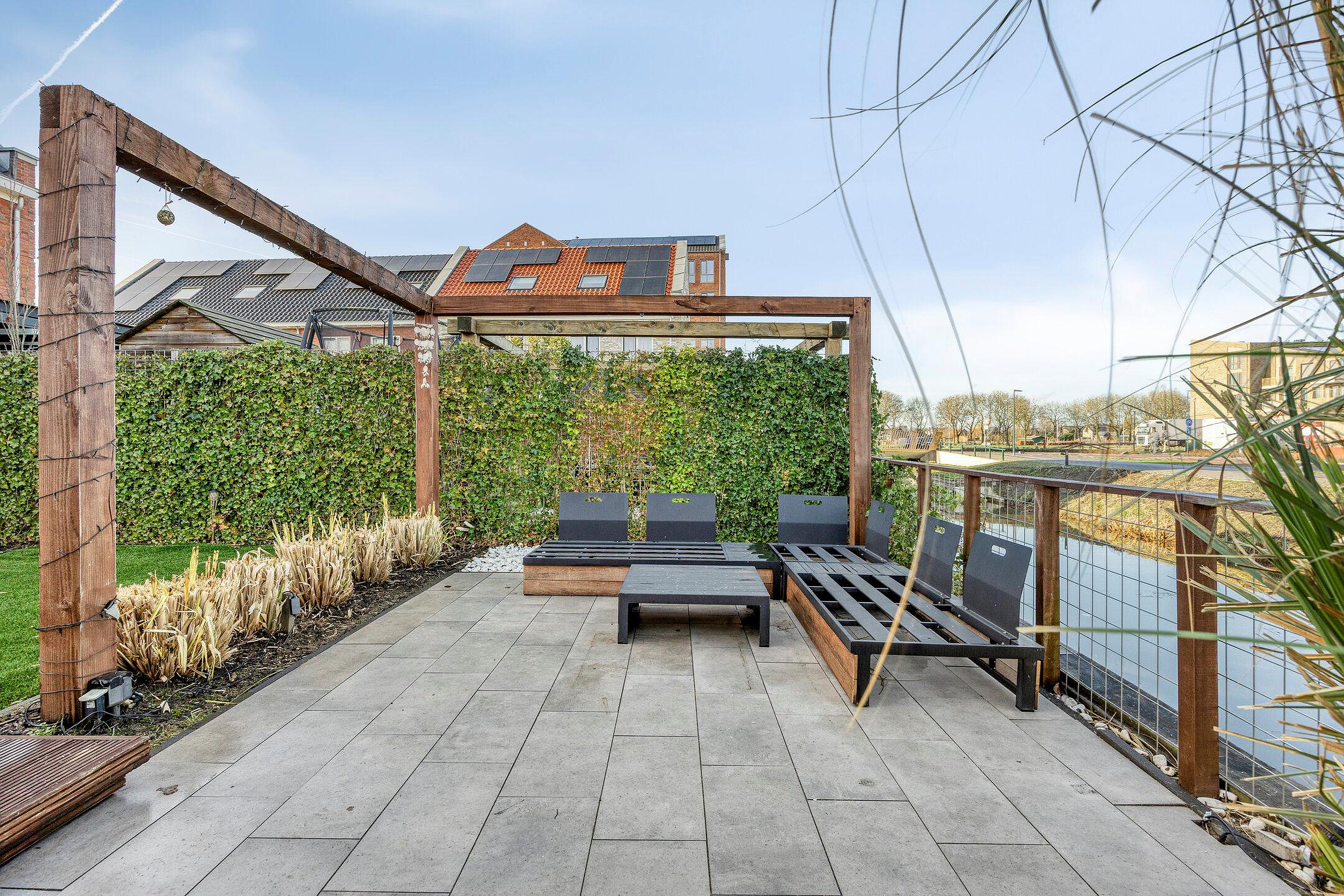 Tuin Strak aangelegde, moderne tuin met een ruim terras, tuinverlichting, gazon en een houten vlonderpad. Achterin een sfeervolle loungehoek onder een pergola, omgeven door groen en met veel privacy. De tuin grenst aan water en biedt een vrij en rustgevend uitzicht.
