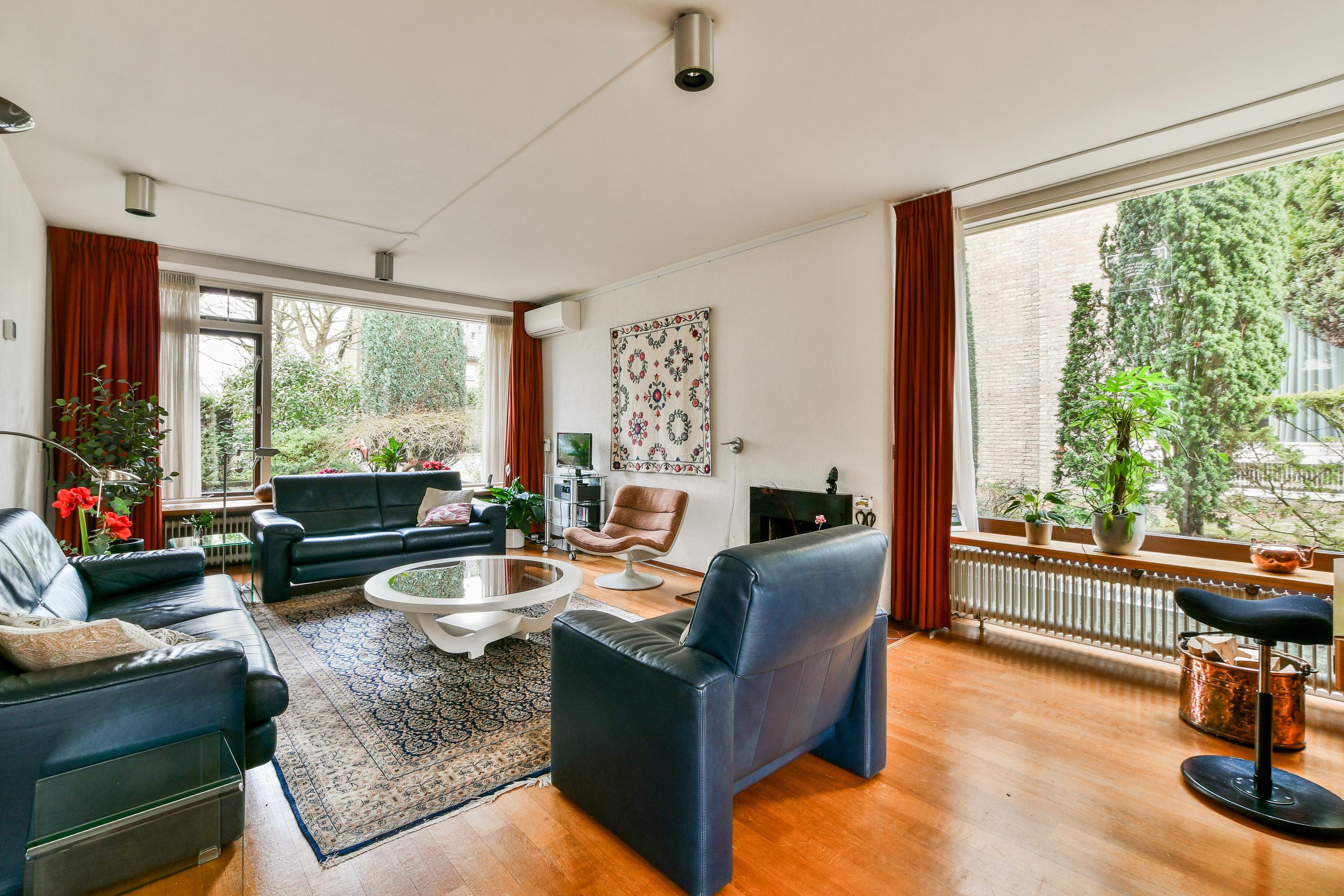 De woonkamer strekt zich uit over de woonlaag en is ingedeeld met een zitgedeelte aan de voorzijde en ruimte voor een royale eettafel richting de achtertuin. Het zitgedeelte is ruim opgezet en biedt volop plaats voor verschillende meubelopstellingen, waardoor de ruimte een open en luchtig karakter behoudt en letterlijk ruimte ademt. De parketvloer verbindt de verschillende delen van de ruimte en draagt bij aan de samenhang van het geheel. In het zitgedeelte is een open haard aanwezig, die een natuurlijk middelpunt vormt van de woonkamer. Daarnaast is de woonkamer voorzien van airconditioning, wat zorgt voor extra comfort en een aangenaam binnenklimaat gedurende alle seizoenen. Grote raampartijen zorgen voor een open verbinding met buiten. Via een deur aan de achterzijde is er directe toegang tot de tuin.