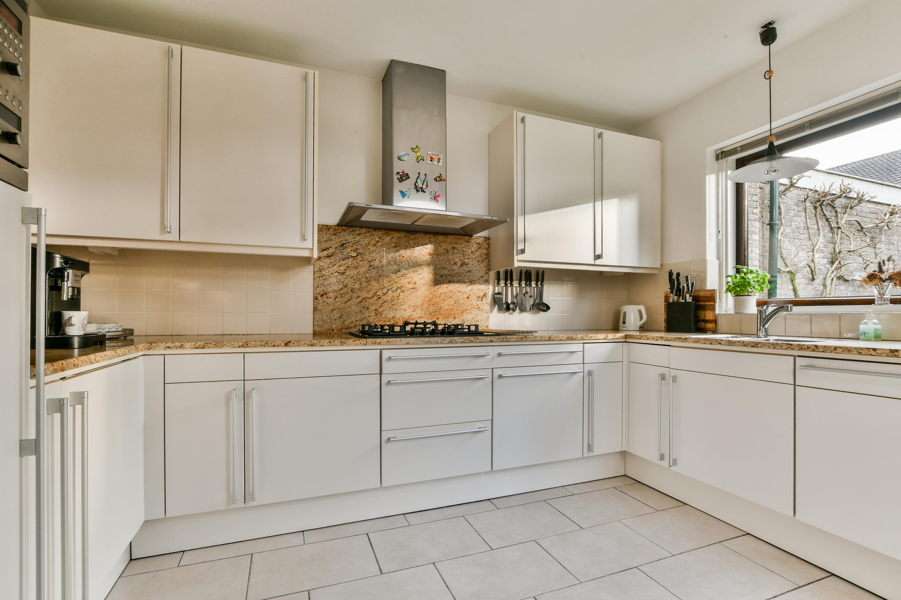 Aansluitend aan de woonkamer bevindt zich de keuken, die op prettige wijze is afgescheiden van de leefruimte. Deze is praktisch ingericht en voorzien van diverse inbouwapparatuur, waaronder een combi-oven, koelkast, vriezer, vaatwasser, gasfornuis en afzuigkap. De keuken biedt ruimte voor dagelijks gebruik en heeft eveneens de doorgang naar de achtertuin, waardoor koken en buiten eenvoudig met elkaar te combineren zijn.