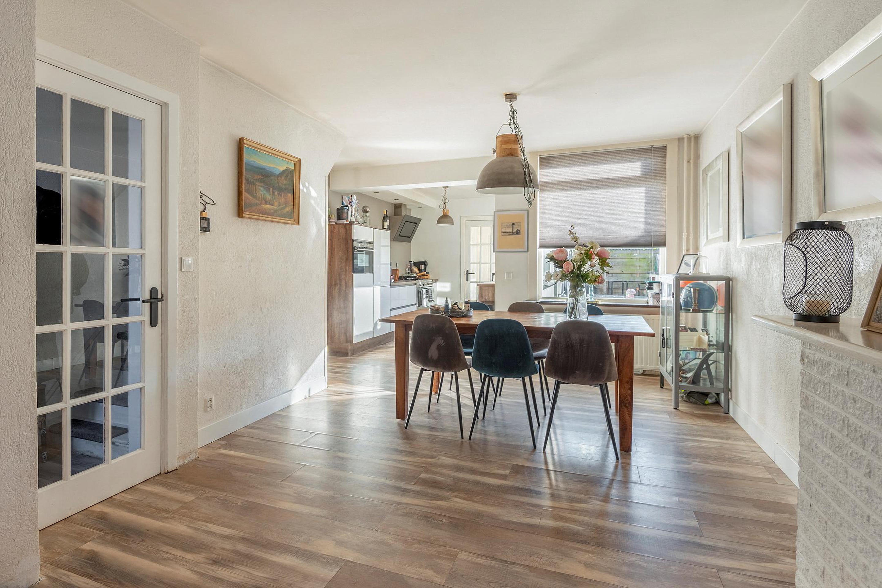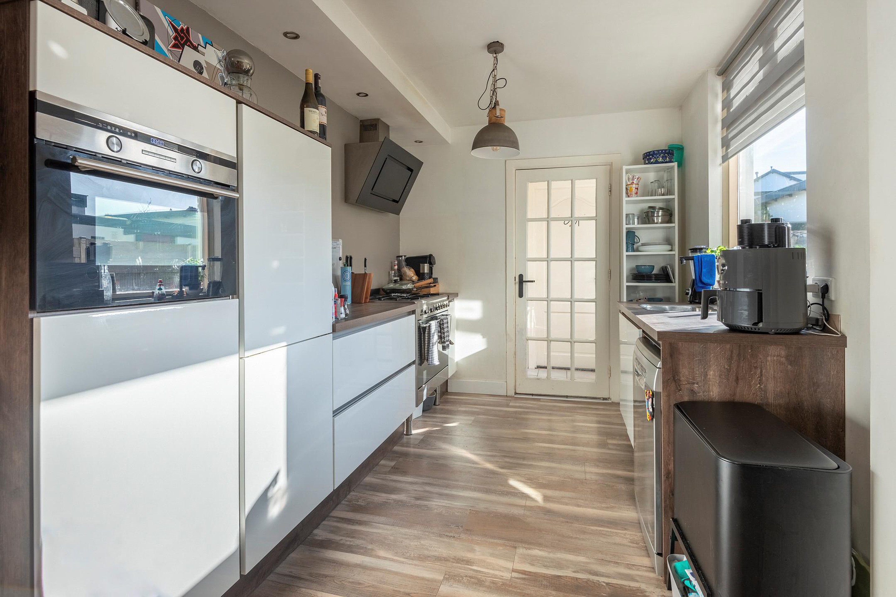 Begane grond De overdekte entree mondt uit in de verwarmde gang met trap naar de eerste verdieping en toegang tot de woonkamer met een erker, een leuk bij deze bouwstijl behorend detail, dat de ruimte net even wat speelser maakt. De achter- /eetkamer is voorzien van een groot raam wat zorgt voor een natuurlijke lichtinval. De woonkamer loopt naadloos over in de open moderne keuken ( 2018) met wandopstelling voorzien van o.a. een combi-oven/magnetron, koel-/vries combinatie, een 5 pits gastoestel inclusief een fornuis, afzuigkap en een losse vaatwasser. Het werkblad is van kunststof. De keuken heeft een goede natuurlijke lichtinval vanwege een zijraam met zicht op de achtertuin.