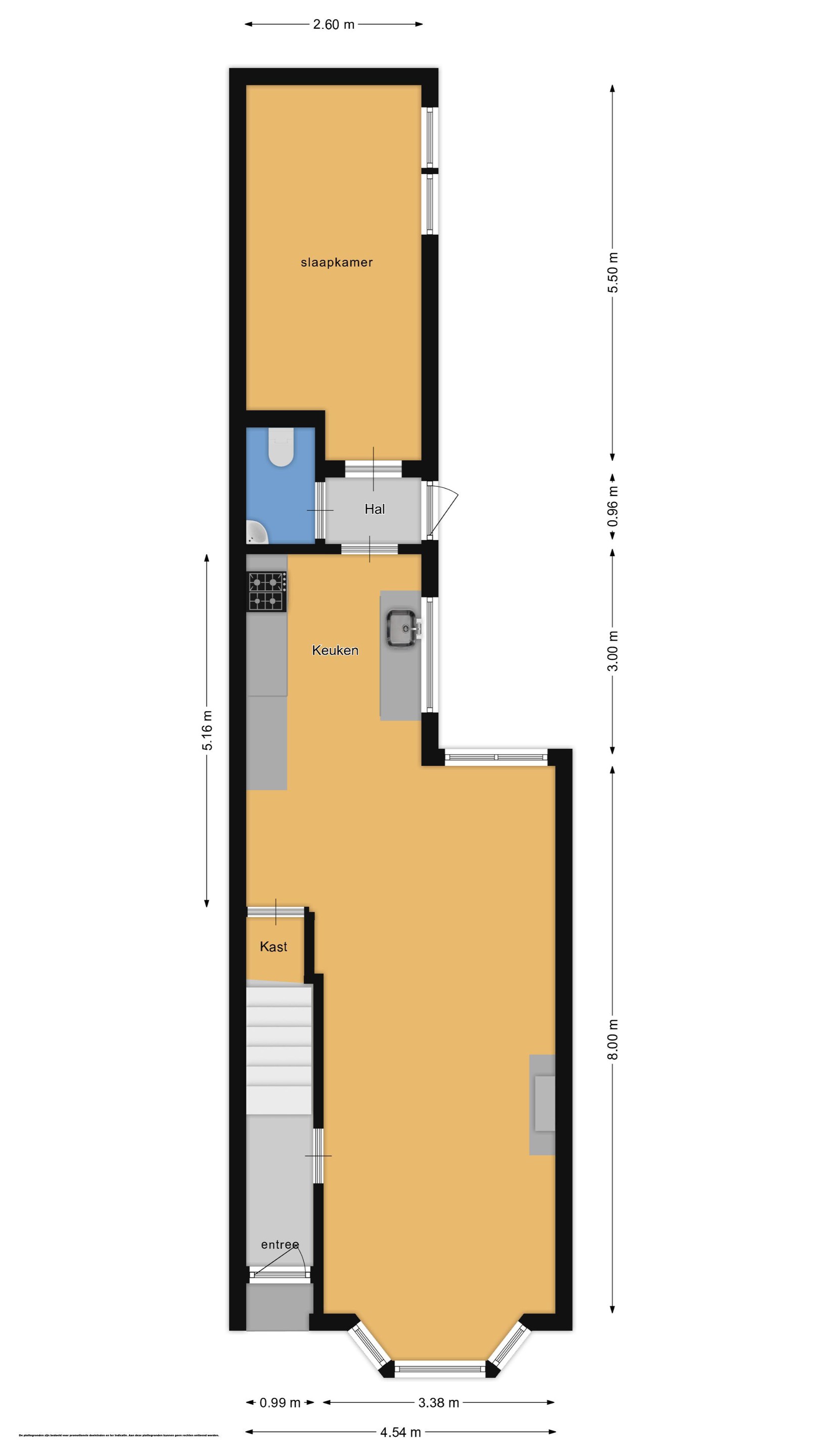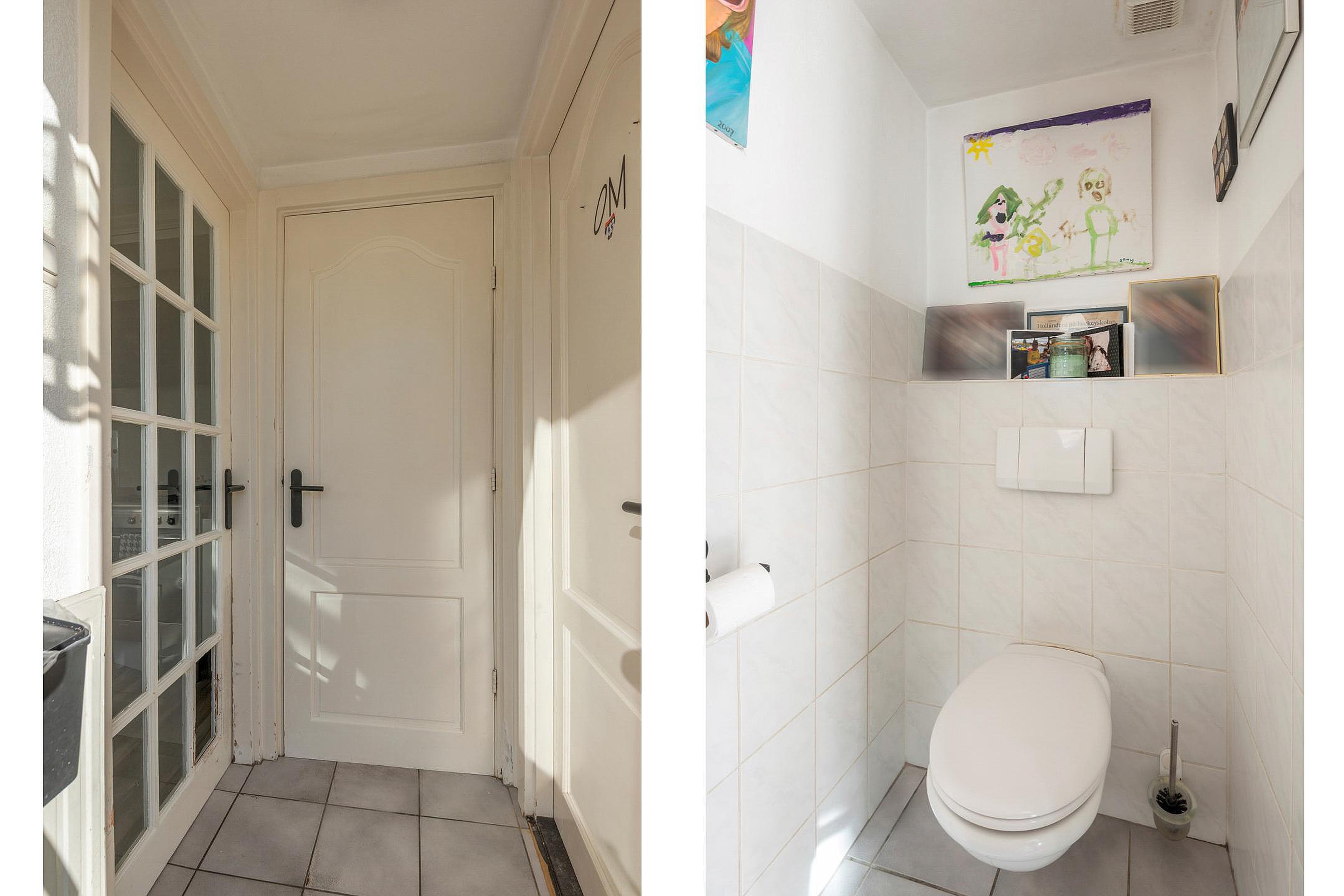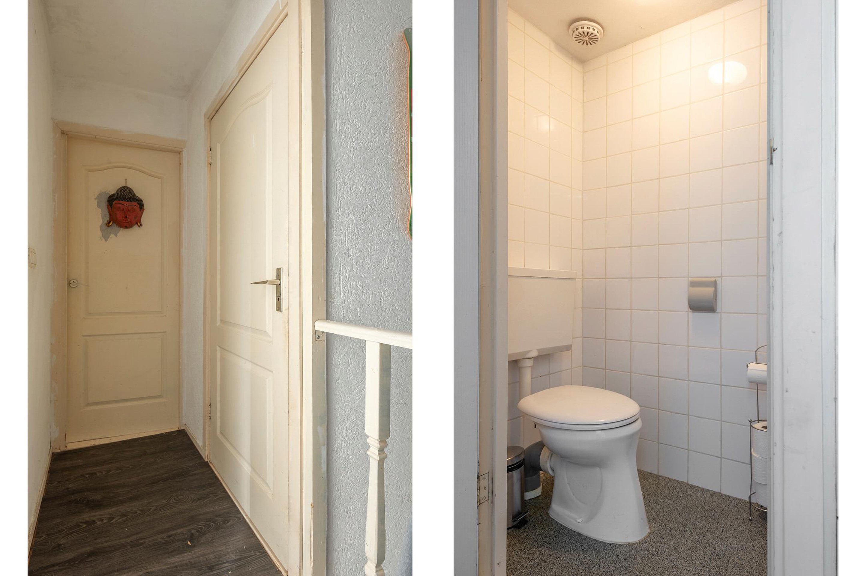 Na de keuken is een tussenhal met separate toiletruimte met een vrij hangend toilet en fonteintje. Vanuit deze tussenhal loopt u zo -via een enkele deur- de tuin in maar heeft u ook toegang tot een aangebouwde slaapkamer / werkkamer met twee openslaande ramen. Onder een deel van de eetkamer is er nog een sta-hoge kelderaanwezig van ca. 8,5m2. De kelder is bereikbaar vanuit de tuin.