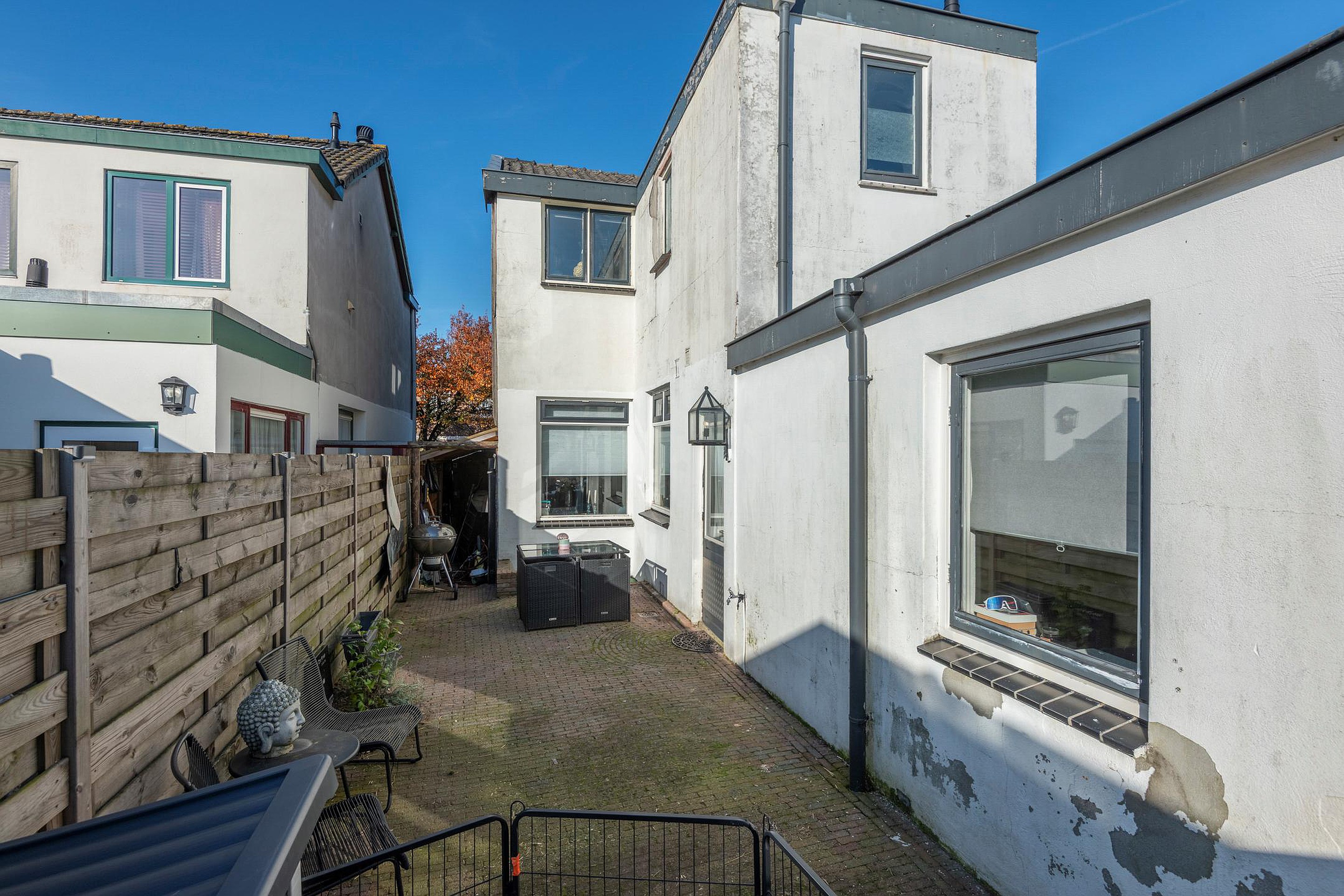 Tuin De achtertuin is gesitueerd op het zuidwesten met altijd wel een plekje in de zon of juist in de schaduw te vinden. De tuin is volledig bestraat (onderhoudsvriendelijk) maar voor de mensen met groene vingers nog voldoende mogelijkheden om leuk te beplanten. De tuin wordt begrensd door houten schuttingen en een poort naar de entree aan de zijkant met een overkapping voor stalling van fietsen, kliko’s en dergelijke.