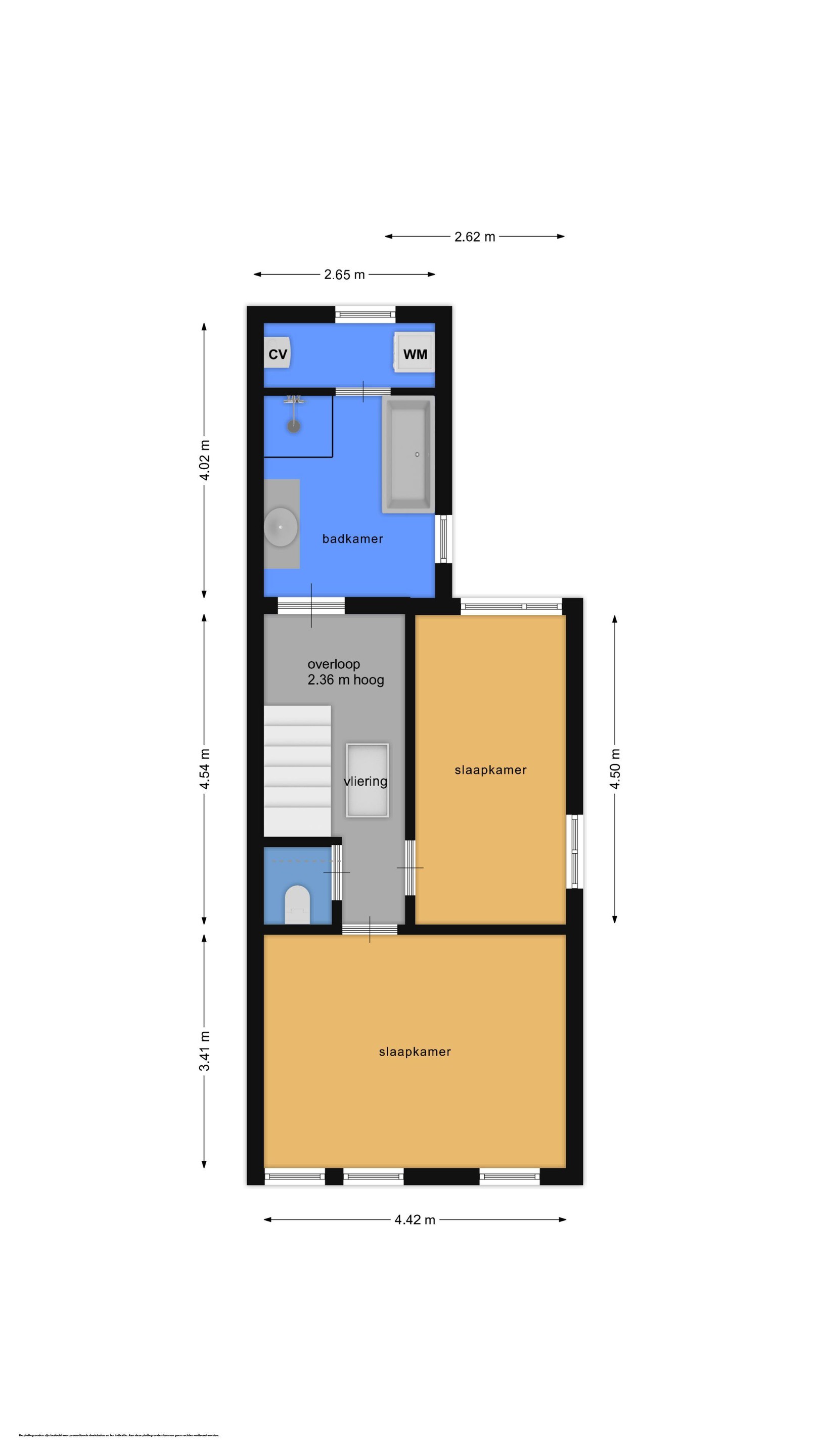 Aan de voorzijde bevindt zich de huidige ouderslaapkamer over de volle breedte van de woning en ca. 18 m2 groot. De twee slaapkamer bevindt zich aan zij zijkant van het huis en is ruim 11m2 groot. De badkamer is aan de achterzijde en heeft vloerverwarming, een ligbad, een douchecabine en een vaste wastafel in een meubel met spiegel. Vanuit de badkamer toegang tot een bergruimte met de wasmachine-/droger opstelling en de C.V.-ketel. Voorts is er vanuit de overloop nog toegang tot een 2e separate toiletruimte en via een steektrap toegang tot de bergvliering.