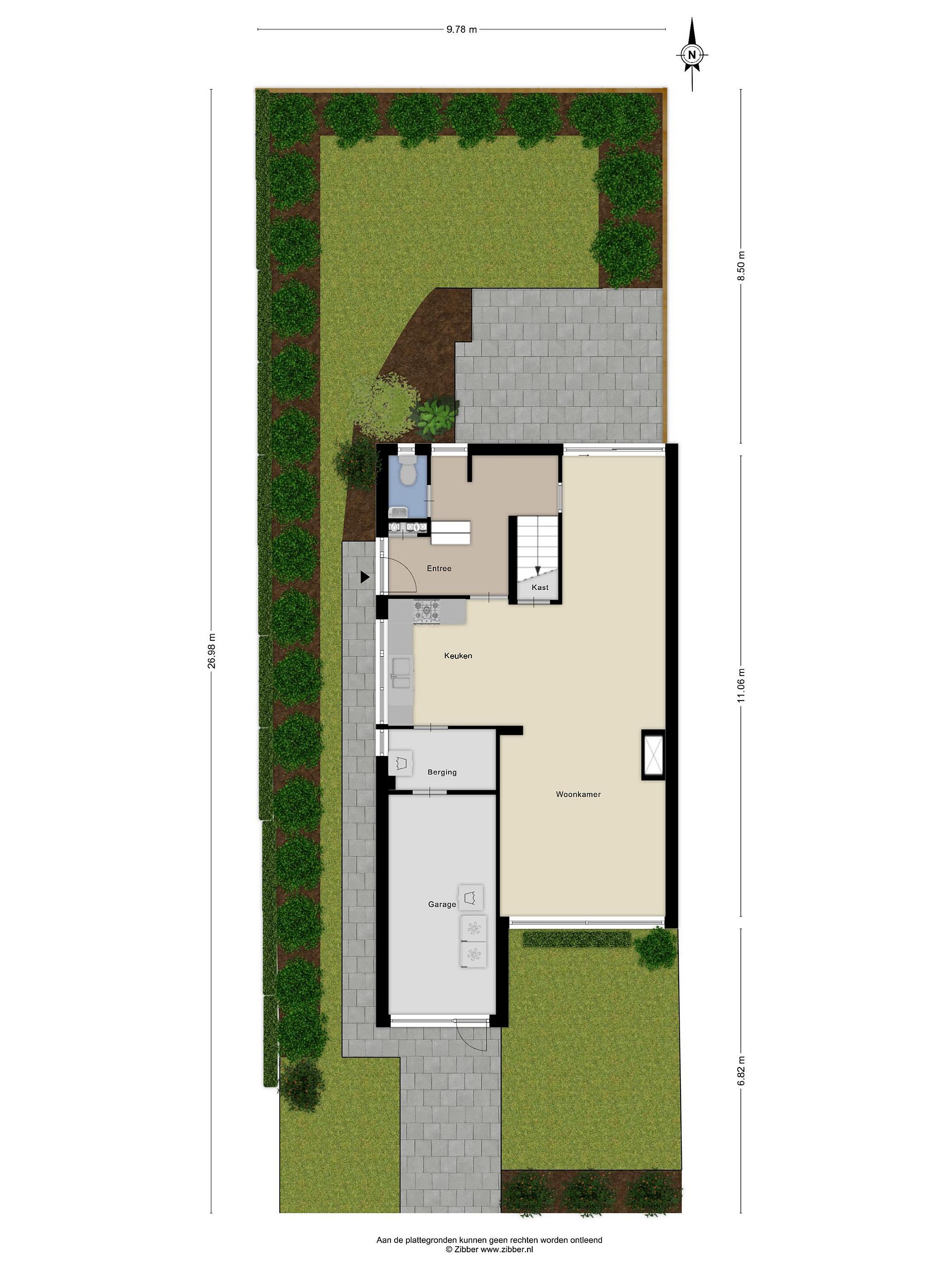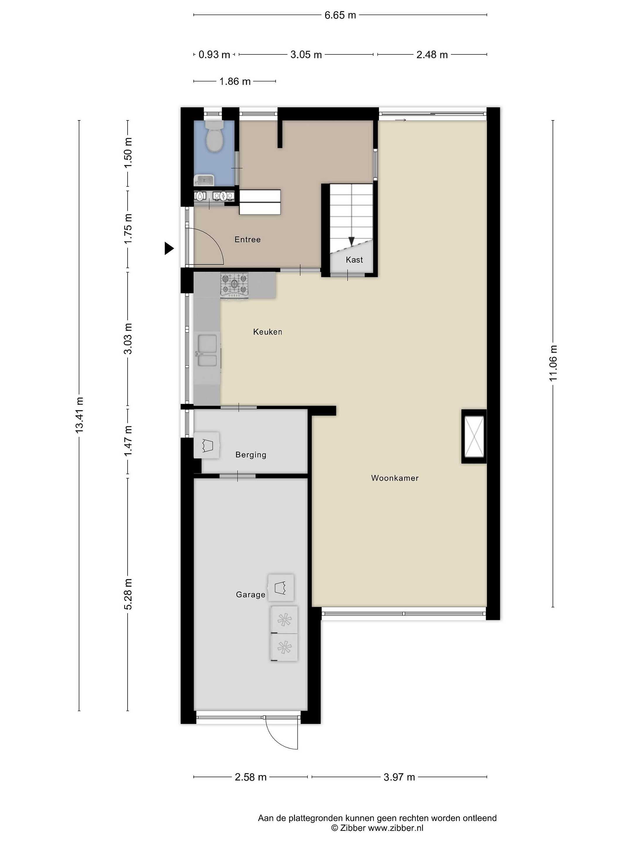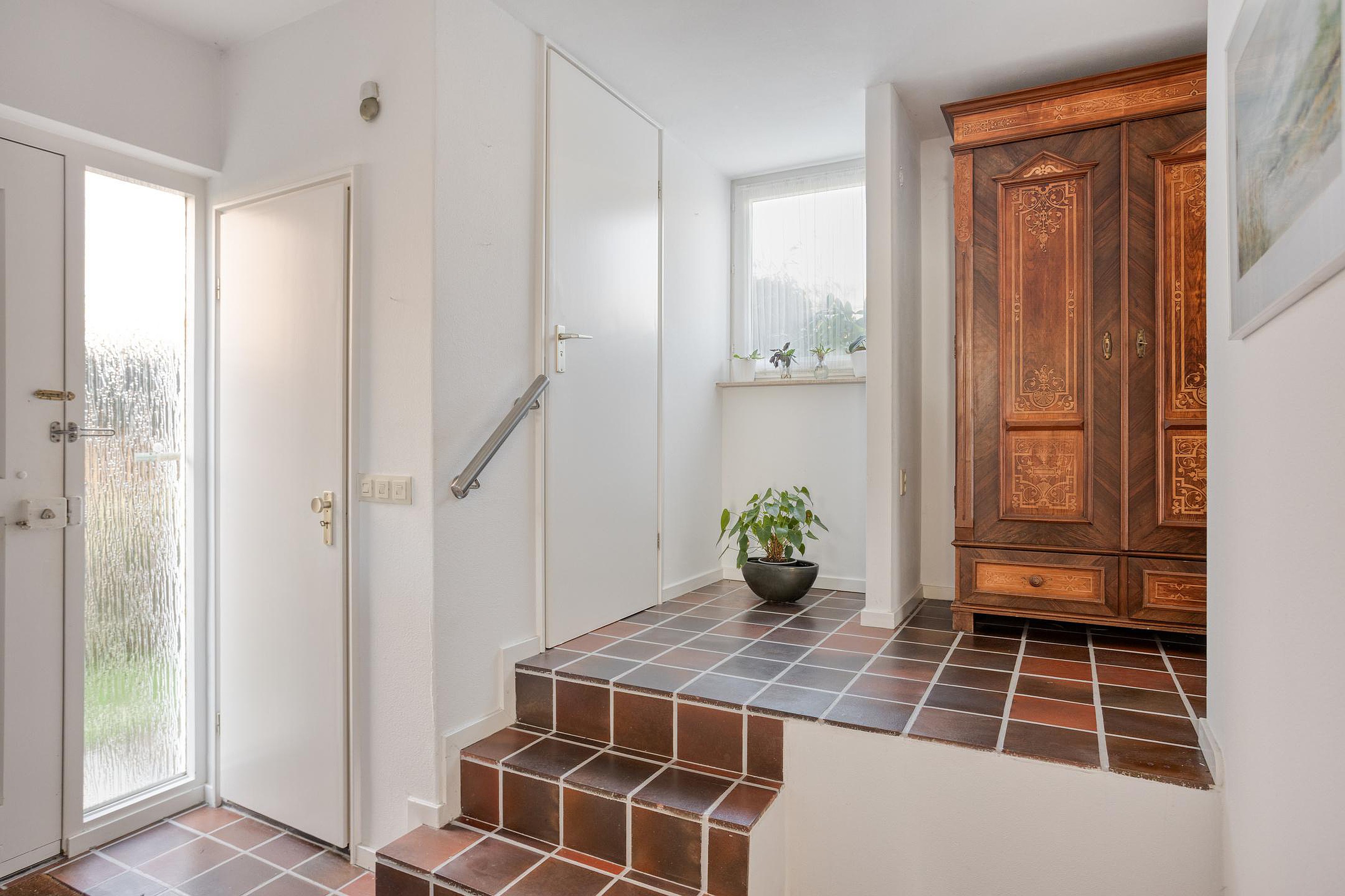 Bij binnenkomst in de woning betreedt u de entree (ca.12m2), die toegang biedt tot de keuken, de meterkast, de garderobe, het toilet en de trapopgang naar de eerste verdieping. Het geheel betegelde toilet is voorzien van een duoblok en een fonteintje. Zowel entree als het toilet zijn afgewerkt met plavuizen. De ruime woonkamer (ca.39m2) beschikt over een schuifpui met toegang tot zowel de voor- als de achtertuin, wat zorgt voor veel lichtinval en een fijne verbinding met buiten. Extra bergruimte in de trappenkast en de toegang naar de kruipruimte. De open keuken (ca.8m2) is ingericht met een praktische hoekopstelling met boven- en onderkasten en is voorzien van diverse inbouwapparatuur, waaronder een 4-pits gaskookplaat, afzuigkap, vaatwasser, combi-oven en een dubbele spoelbak. De keuken en woonkamer zijn afgewerkt met een lichte parketvloer, wat het geheel een warme en verzorgde uitstraling geeft. Vanuit de keuken bereikt u de bijkeuken (ca.4m2), waar zich de aansluitingen voor het witgoed bevinden. Inpandige garage voorzien van elektra en water (ca.14m2) bereikbaar vanuit de bijkeuken, voorzien van kantelpoort met loopdeur en brievenbus.