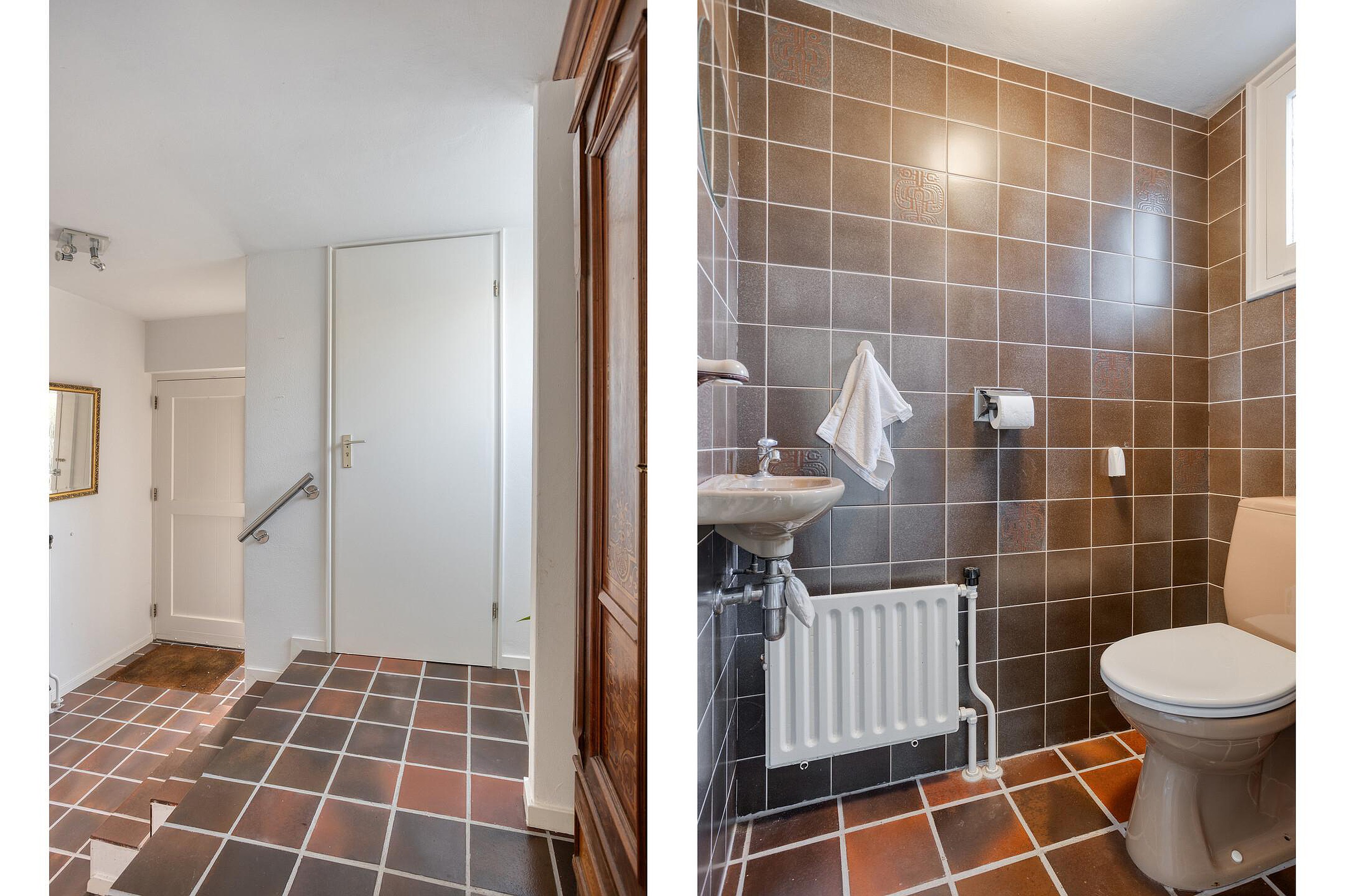 - Voordeur en toiletraampje van Meranti houten kozijnen met gehard sierglas;