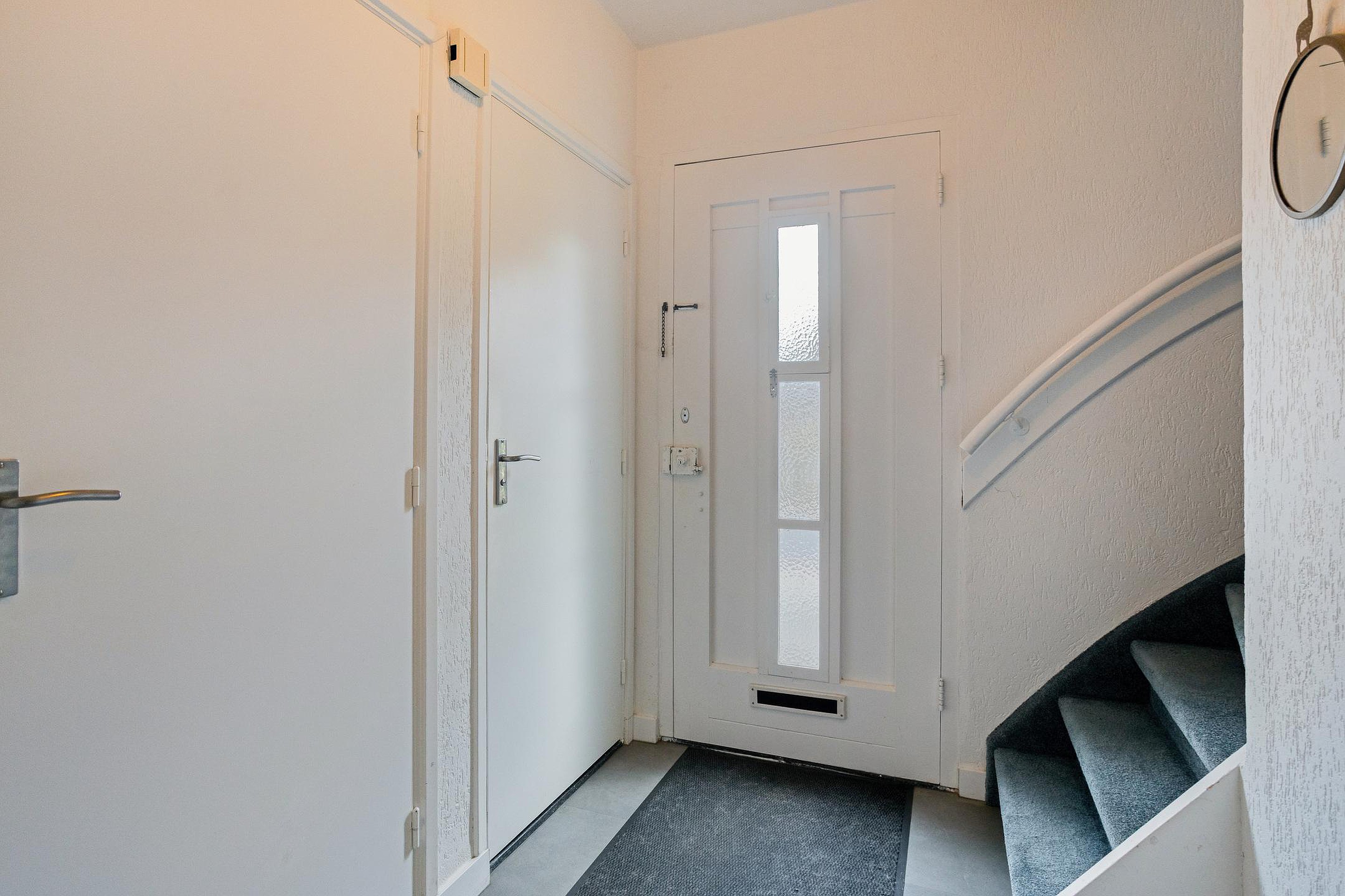 Entree/hal (ca.4m2) die toegang biedt tot trapopgang naar de eerste verdieping, toilet en de living. Het deels betegelde toilet is voorzien van een duoblok. Naastgelegen bevindt zich de voormalige wasruimte, die nu in gebruik is als garderobekast. Living (ca.28m2) in z-vorm met openslaande deuren naar de tuin. Aansluitend de gesloten keuken (ca.9m2) met aanrechtcombinatie in hoekopstelling, voorzien van de volgende inbouwapparatuur: spoelbak,4-pits gaskookplaat, afzuigkap, magnetron, vaatwasser en koelkast. Living, keuken en hal met grijze pvc tegels.