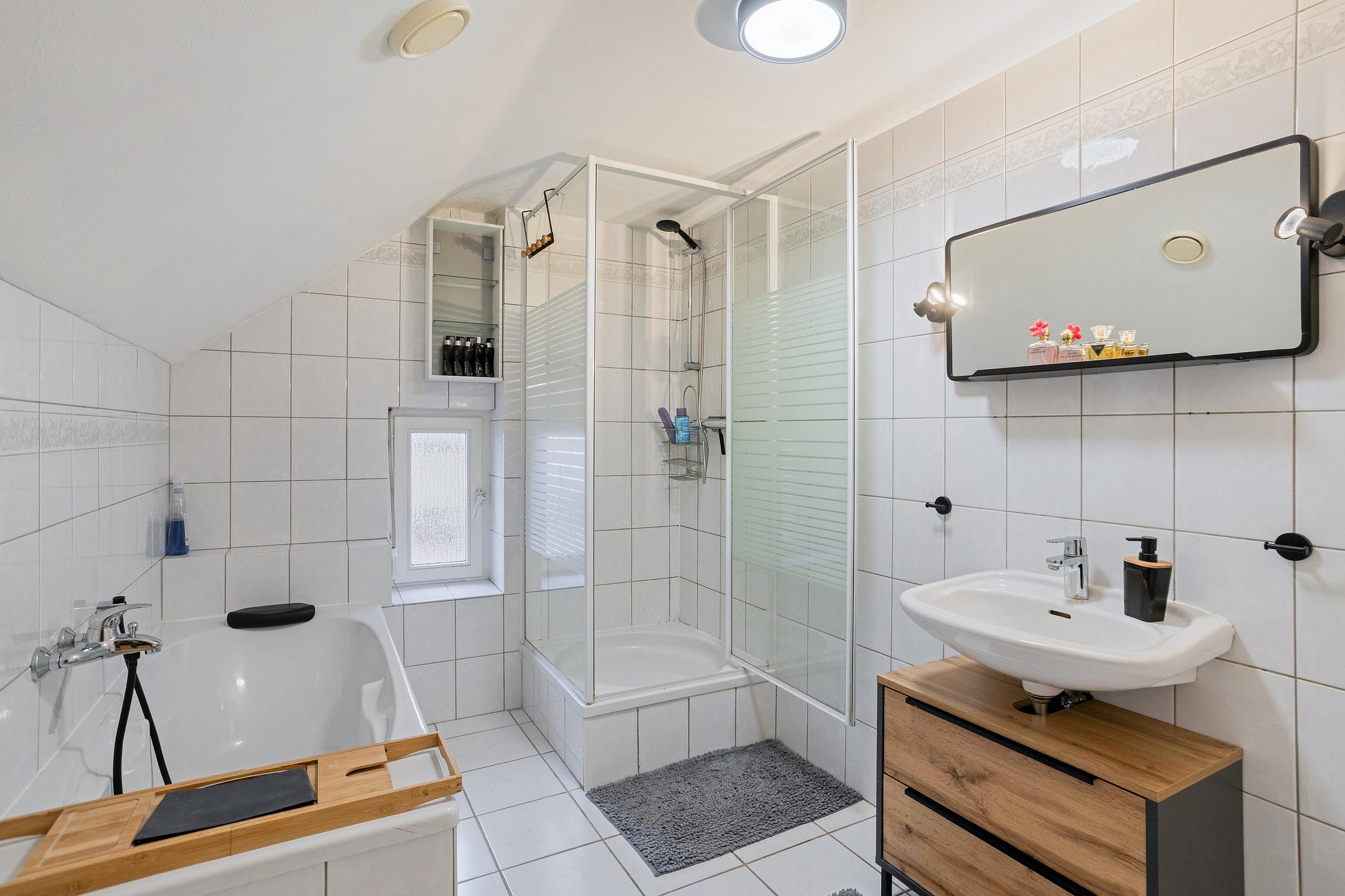 Overloop van waaruit men toegang heeft tot drie slaapkamers en de badkamer. Slaapkamer I (ca.11m2) en slaapkamer III (ca.10m2) bevinden zich aan de voorzijde van de woning. Slaapkamer II (ca.6m2) aan de achterzijde gelegen met uitzicht op de tuin. De geheel betegelde badkamer met ligbad, separate douche en wastafel en meubel.