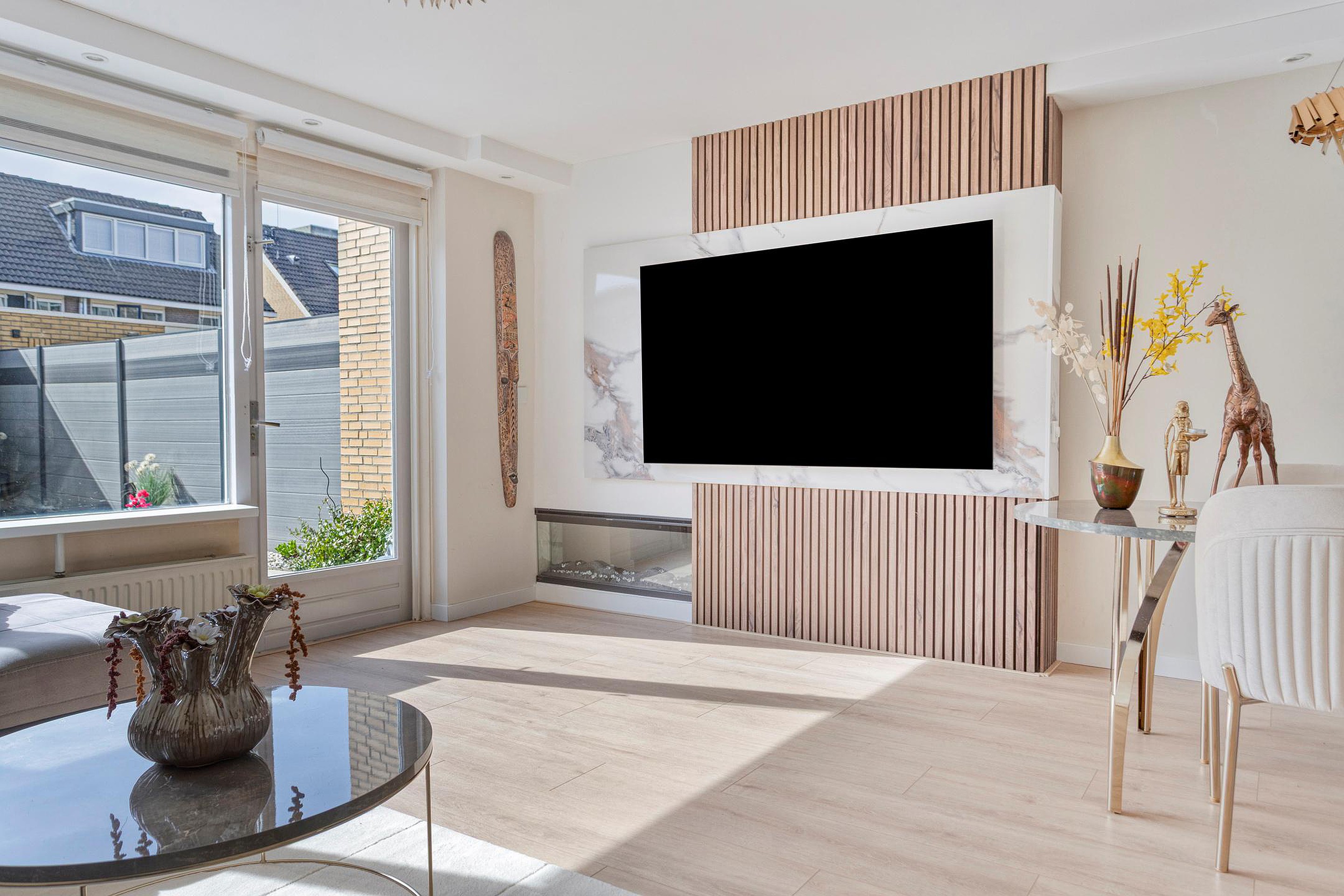 Woonkamer, een lichte tuingerichte woonkamer, voorzien van een fraaie cinema wall met elektrische sfeerhaard, airconditioning (verwarmen/koelen) en toegang tot de open keuken, kast (onder de trap) en de achtertuin.