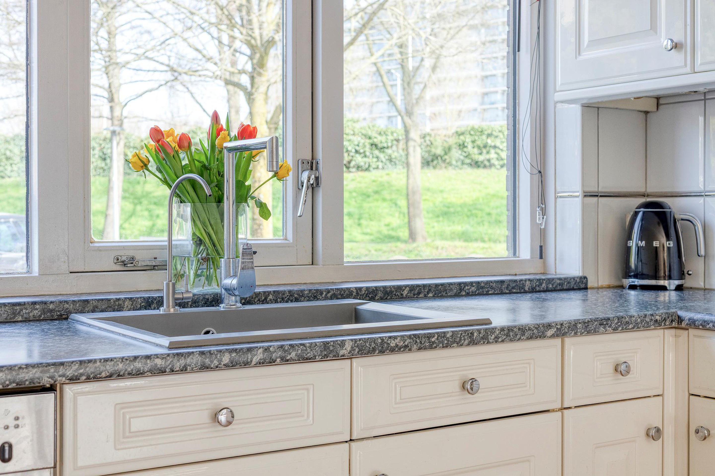 Keuken, een open keuken gelegen aan de voorzijde van de woning met uitzicht op een groenstrook. Een keukenblok in L-vormige opstelling met een inductiekookplaat met afzuigkap, oven, vaatwasser, koel/vriescombinatie en close-in boiler.