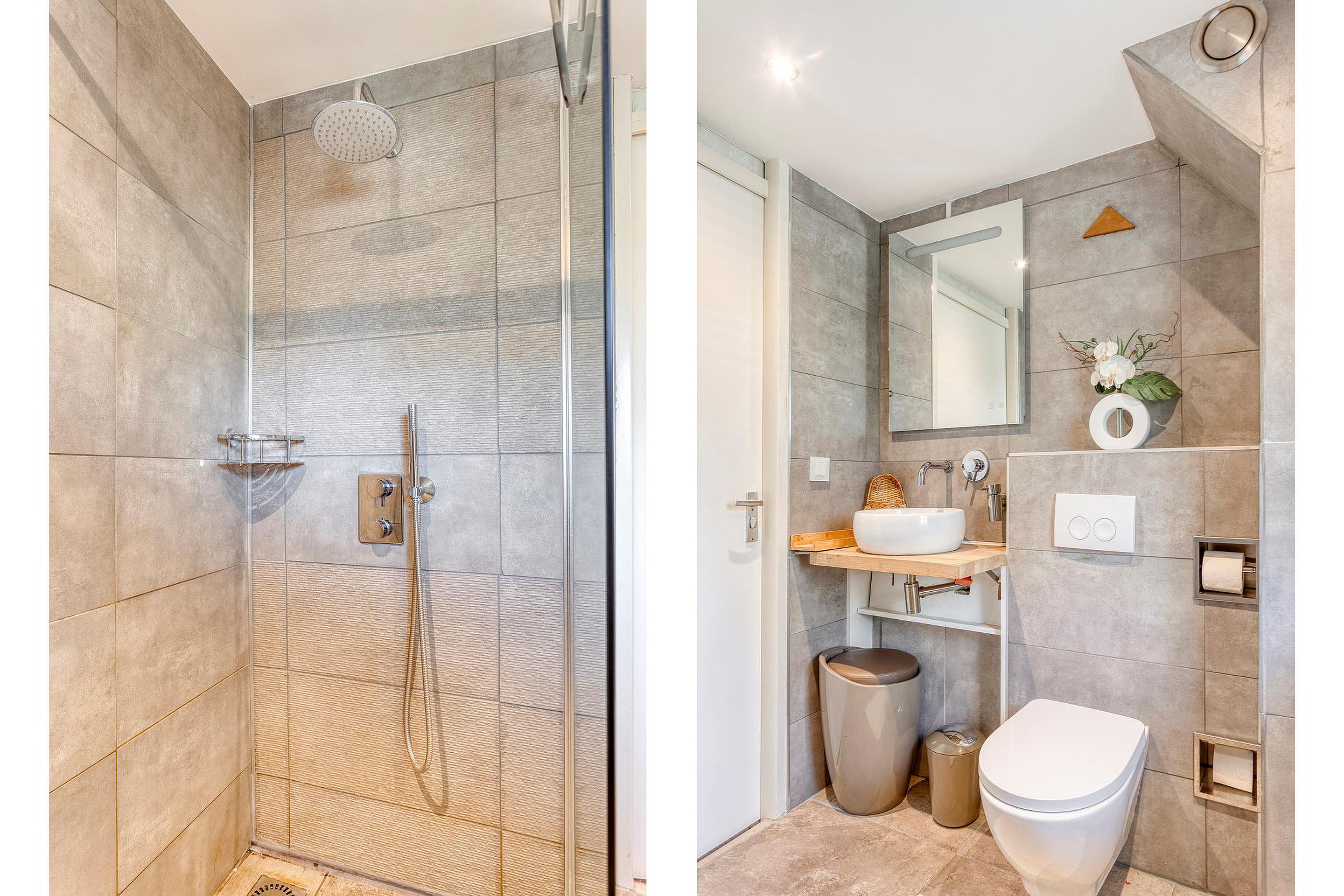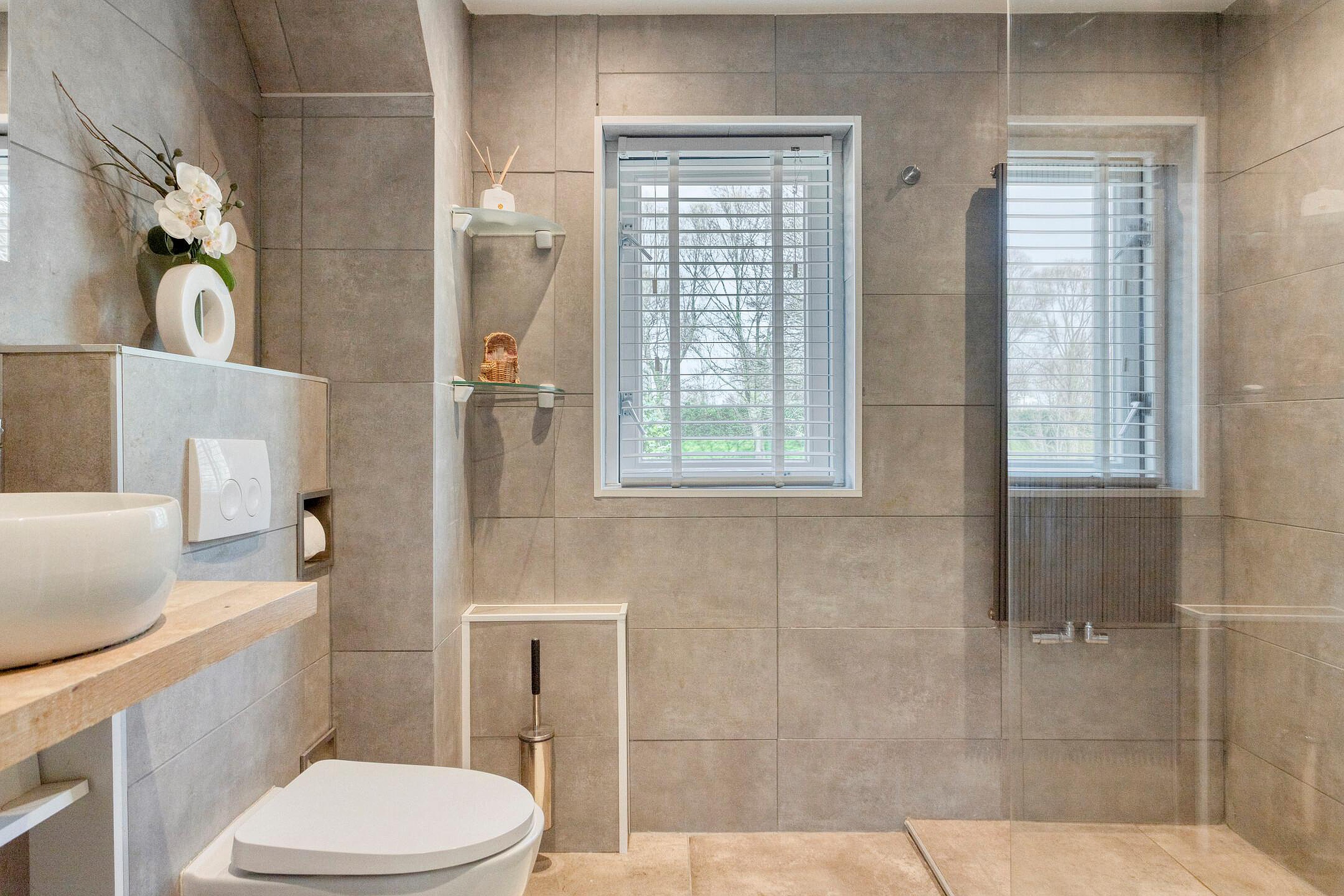 Badkamer (2022), modern en geheel betegeld, voorzien van een inloopdouche met inbouwkraan, rainshower en handdouche, waskom, spiegel met verlichting, tweede toilet (hangend closet), badkamerradiator, mechanische ventilatie en een te openen raam.