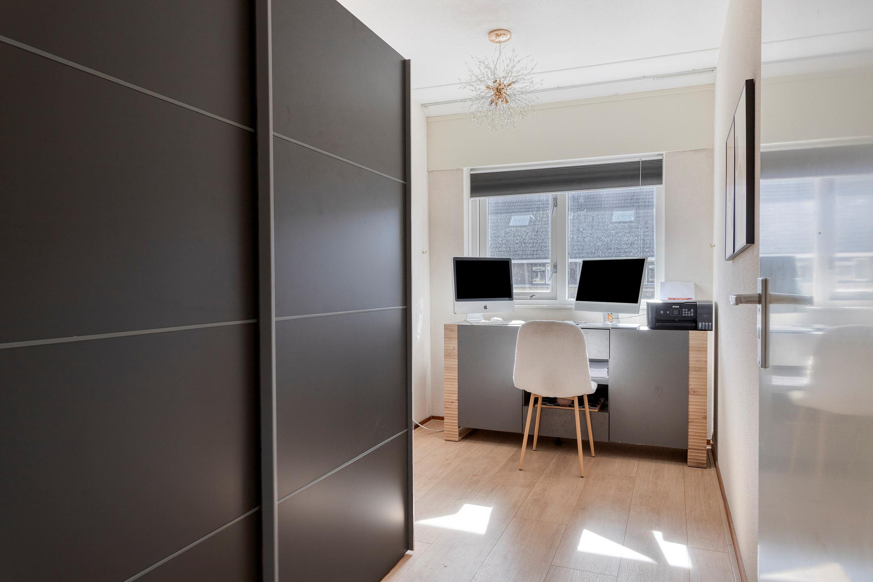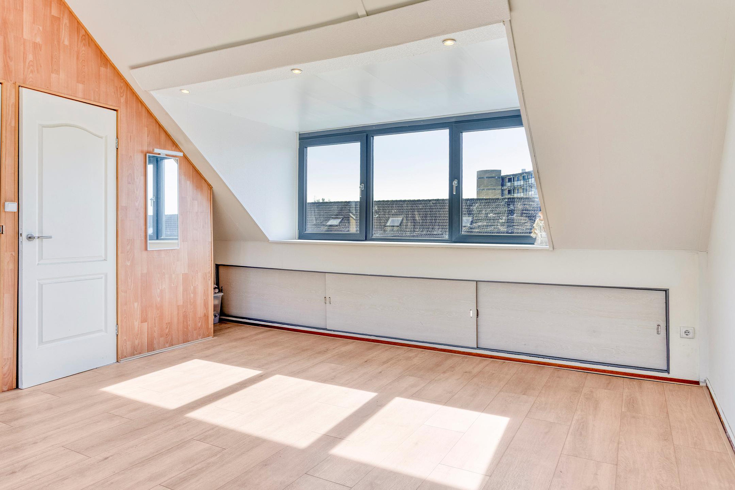 Een royale zolderkamer (2 kamers mogelijk!) met 2 grote kunststof dakkapellen (2022), laminaat vloerafwerking en bergruimte achter de knieschotten aan de voor- en achterkant. De kamer biedt toegang tot een kast met de opstelling van de cv-ketel en mechanische ventilatie-unit, omvormer voor de PV zonnepanelen en de wasmachineaansluiting.