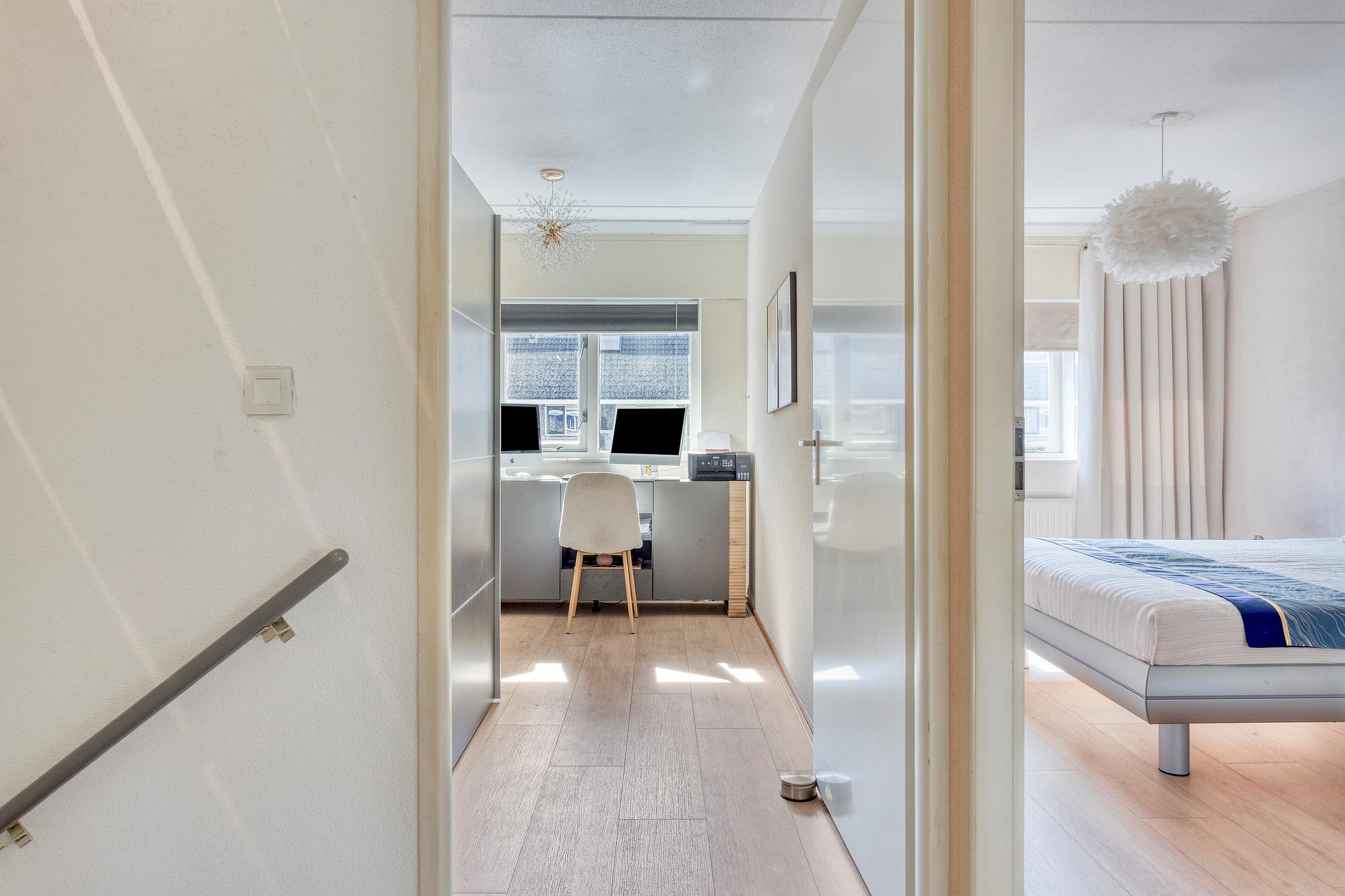 De eerste verdieping is voorzien van een laminaat vloerafwerking. Beide trappen zijn gestoffeerd.