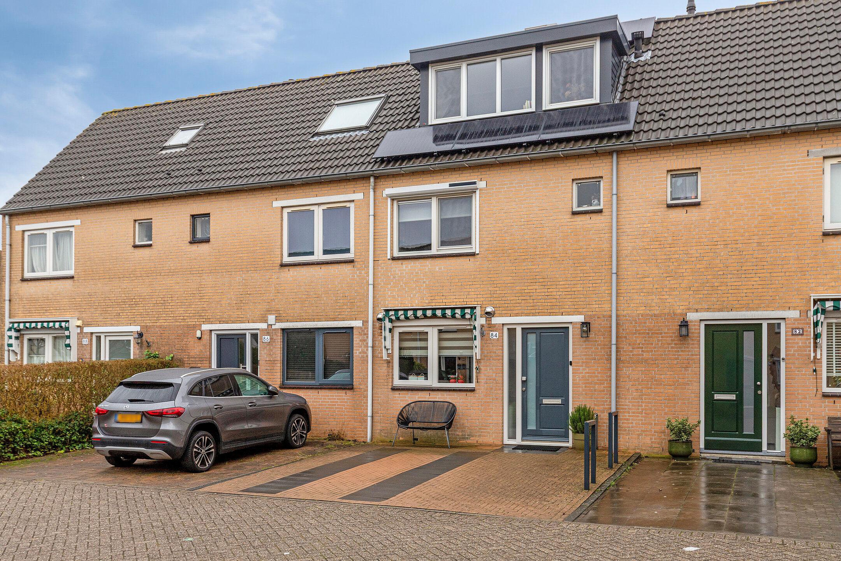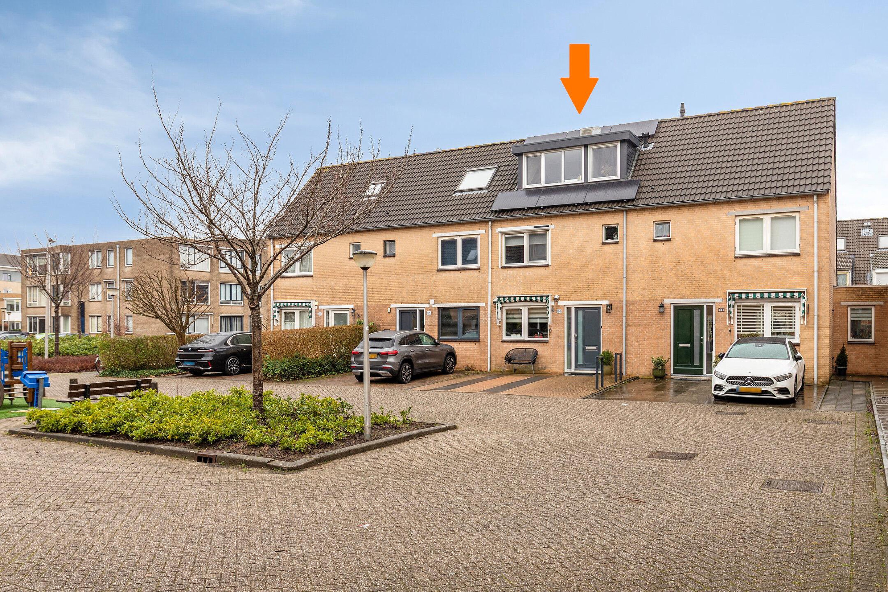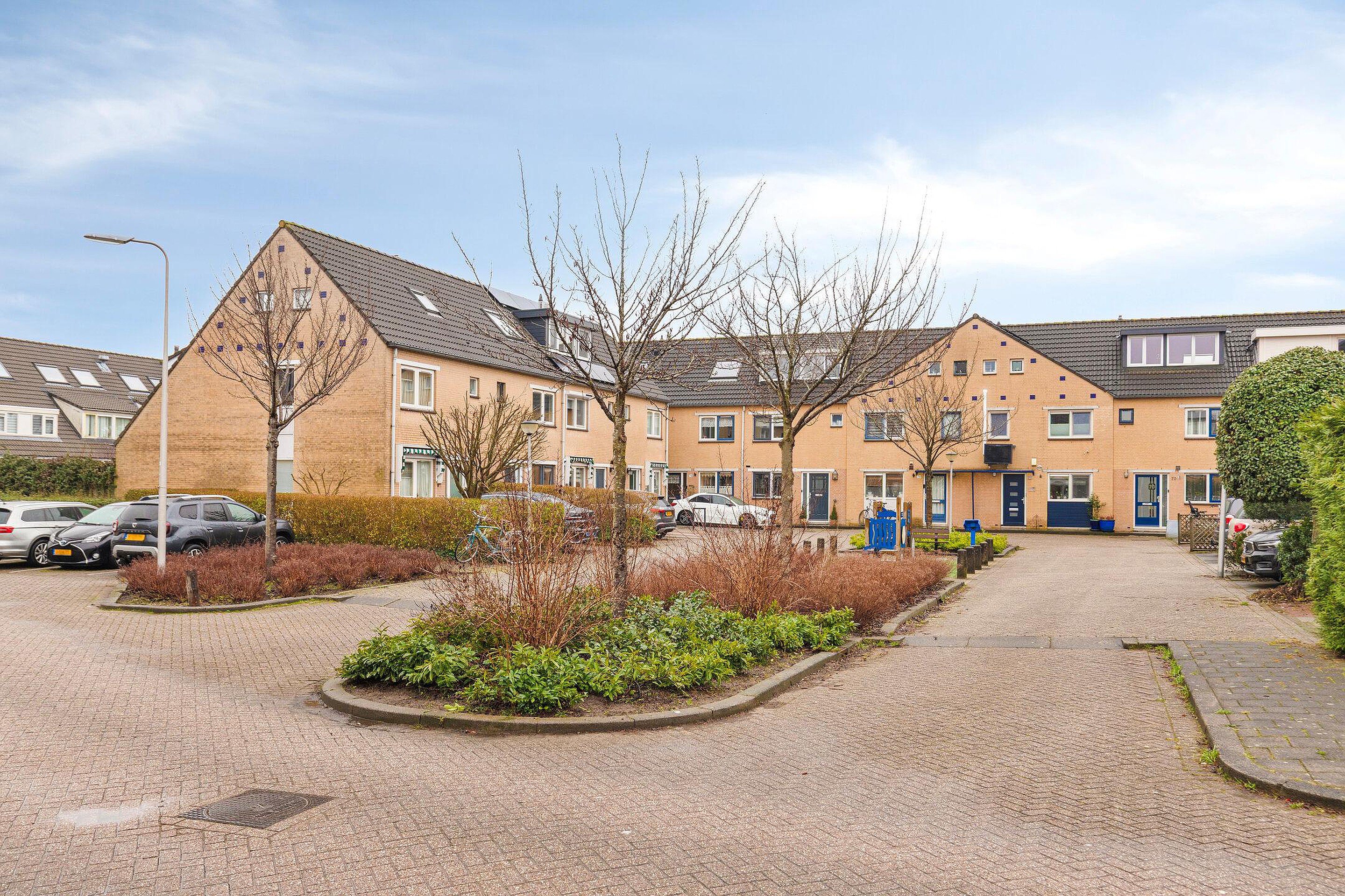 Voortuin, grenzend aan een gezellig en kindvriendelijk (speel)pleintje, voorzien van sierbestrating, zonwering voor keukenraam (markies), buitenkraan en parkeergelegenheid.
