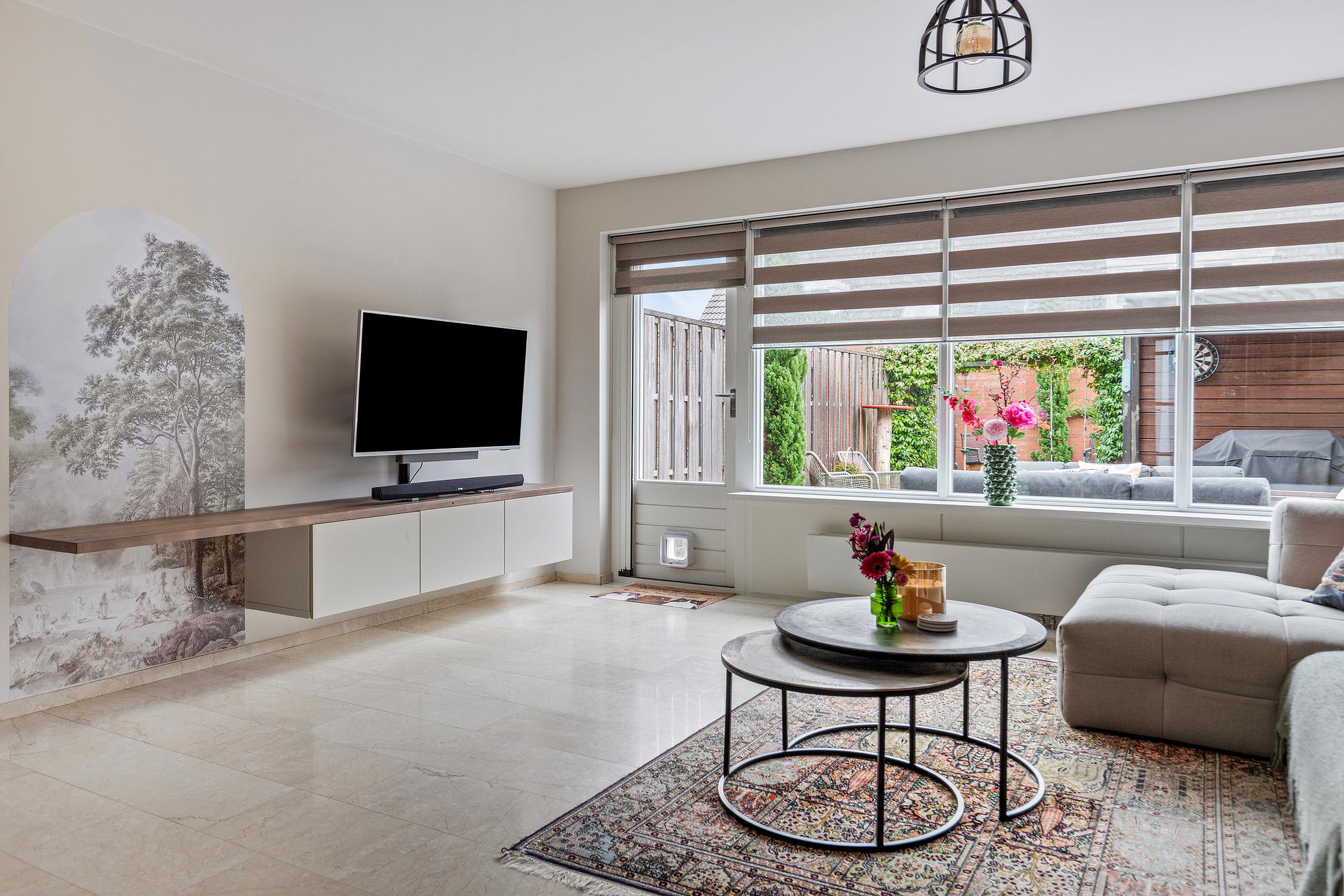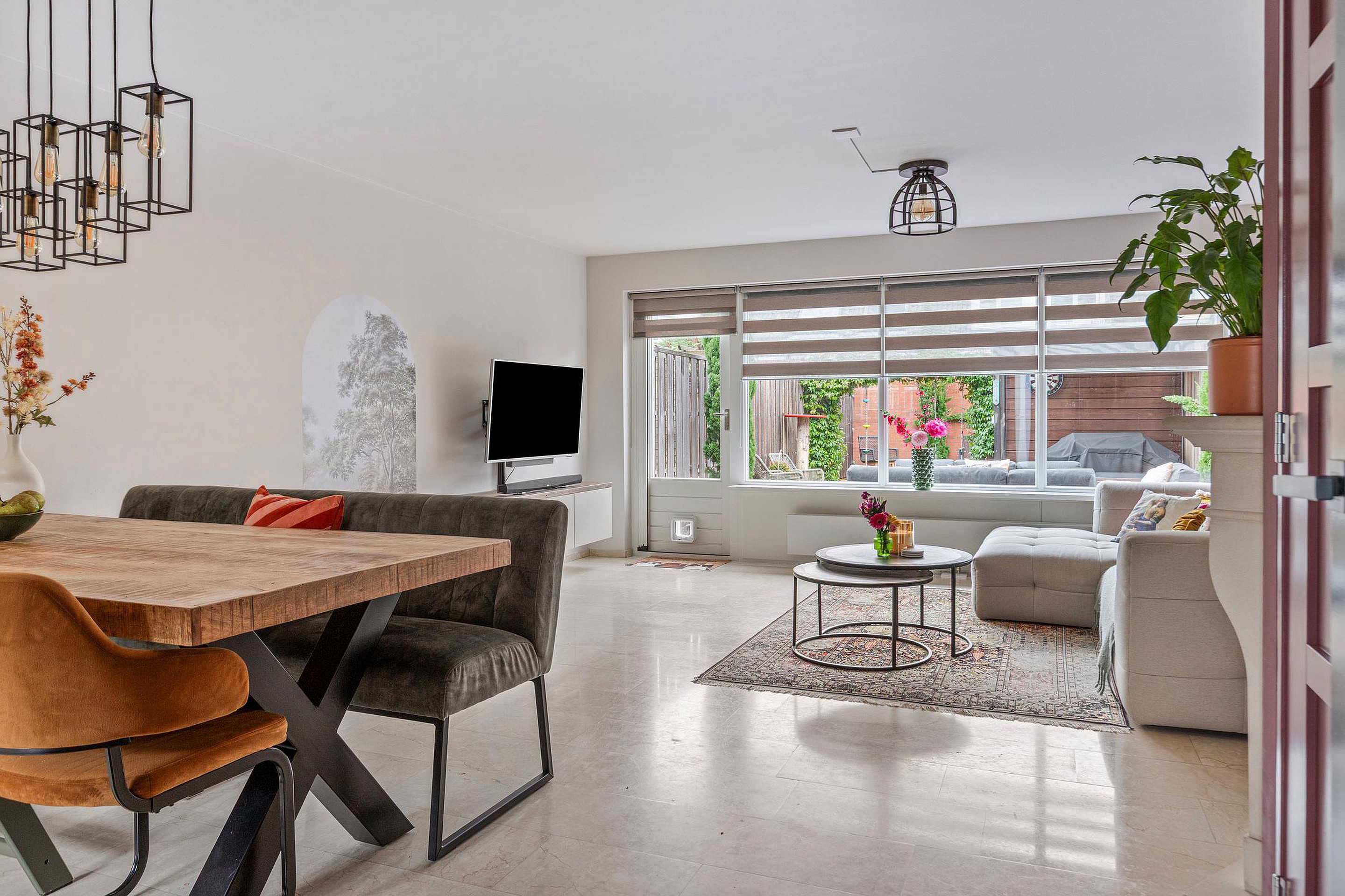 Woonkamer, een ruime en lichte woonkamer, met een sfeervolle gashaard, kast onder de trap, elektrische zonwering (screens) en toegang tot de keuken en achtertuin.