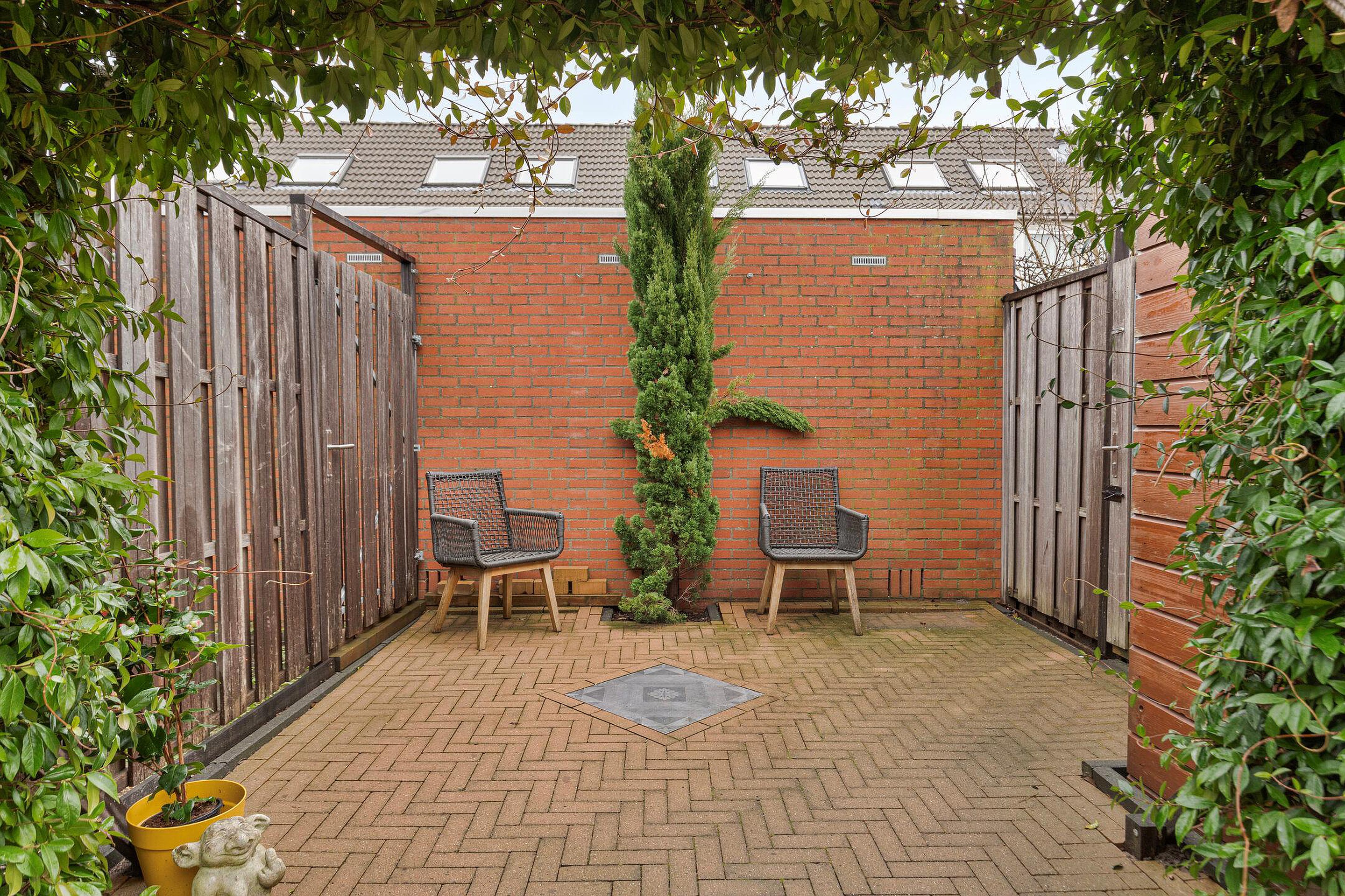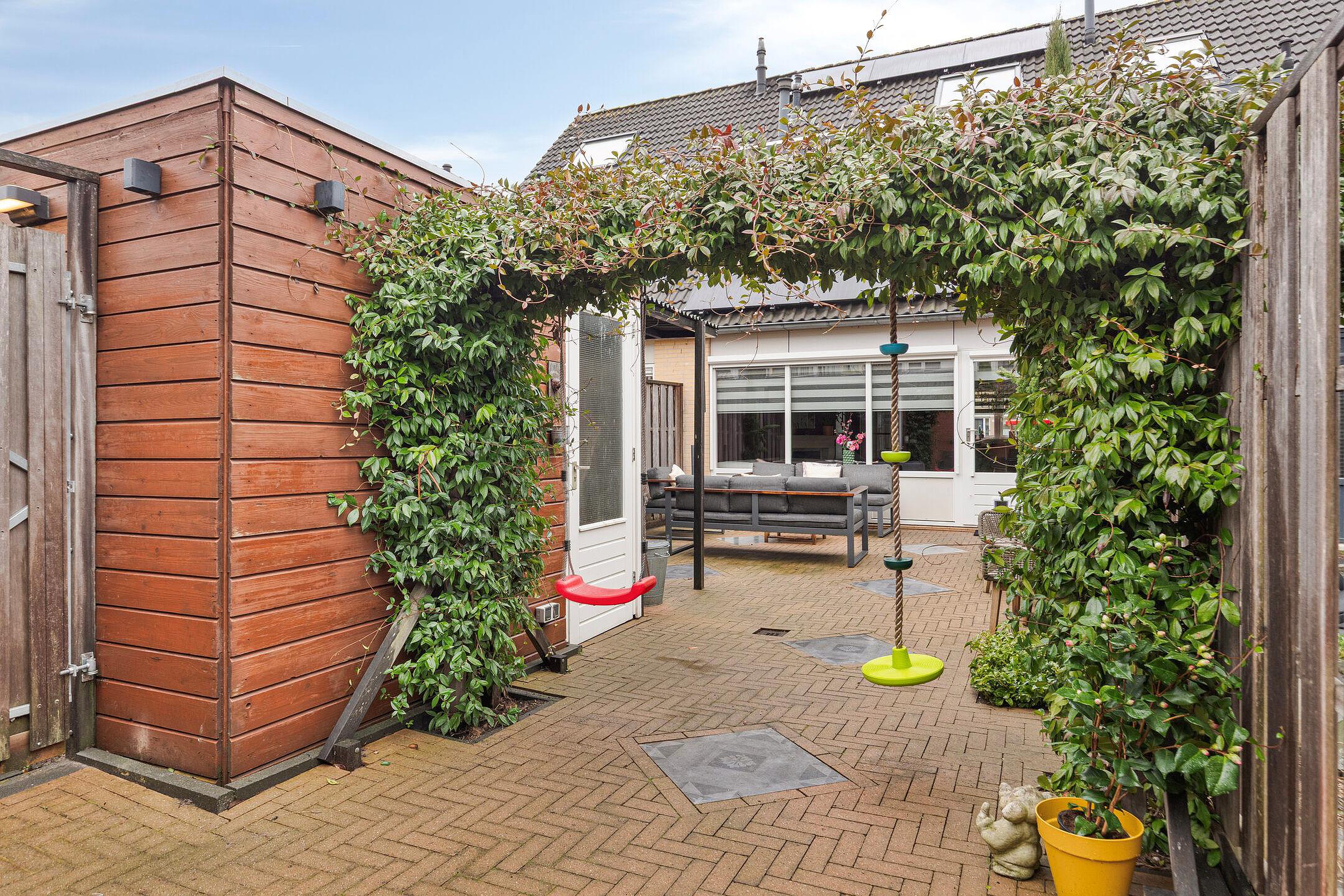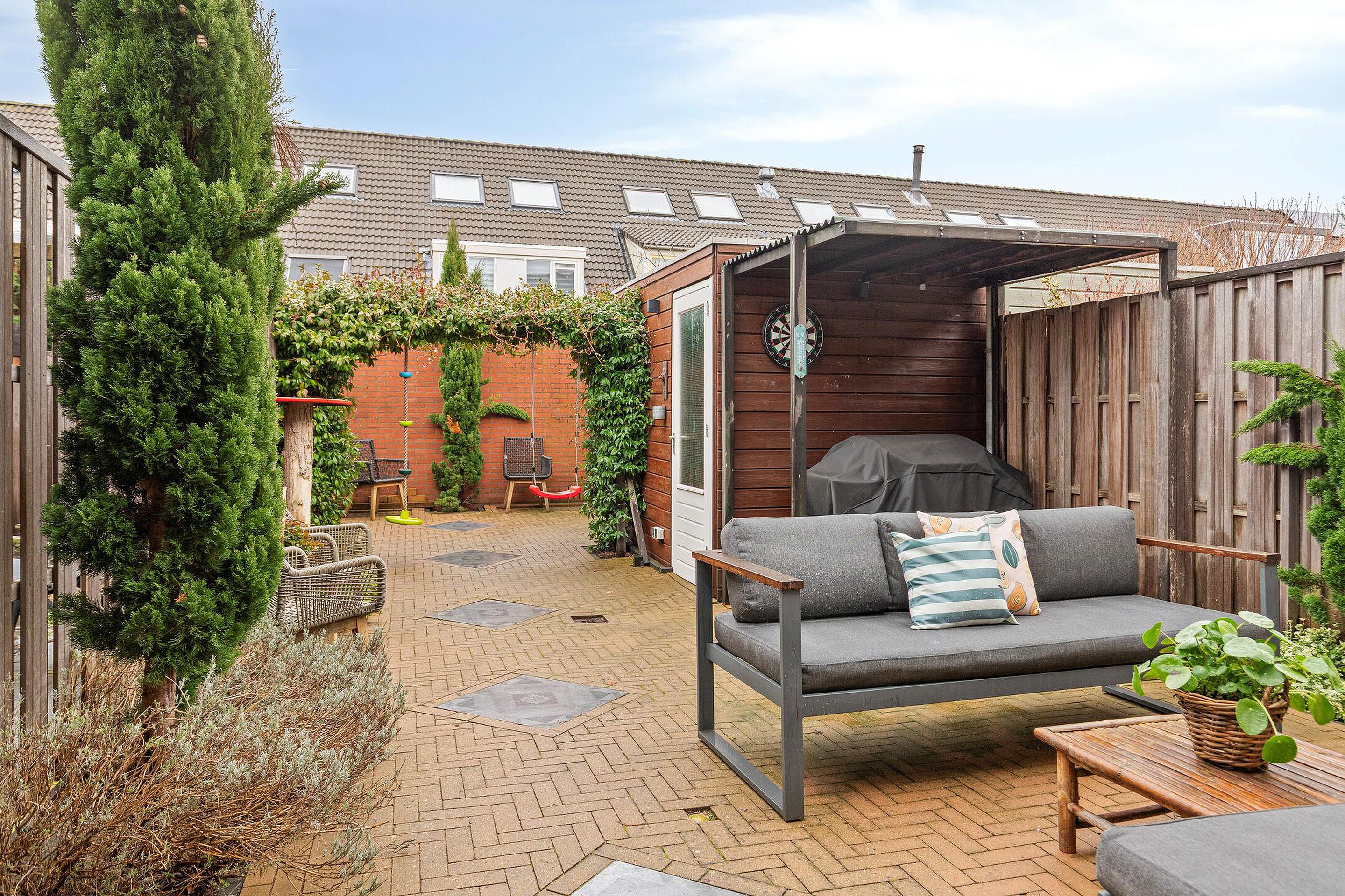 Achtertuin, gelegen op het oosten en voorzien van zowel sierbestrating als groen, bevat een houten berging met overkapping, elektra en een achterom.