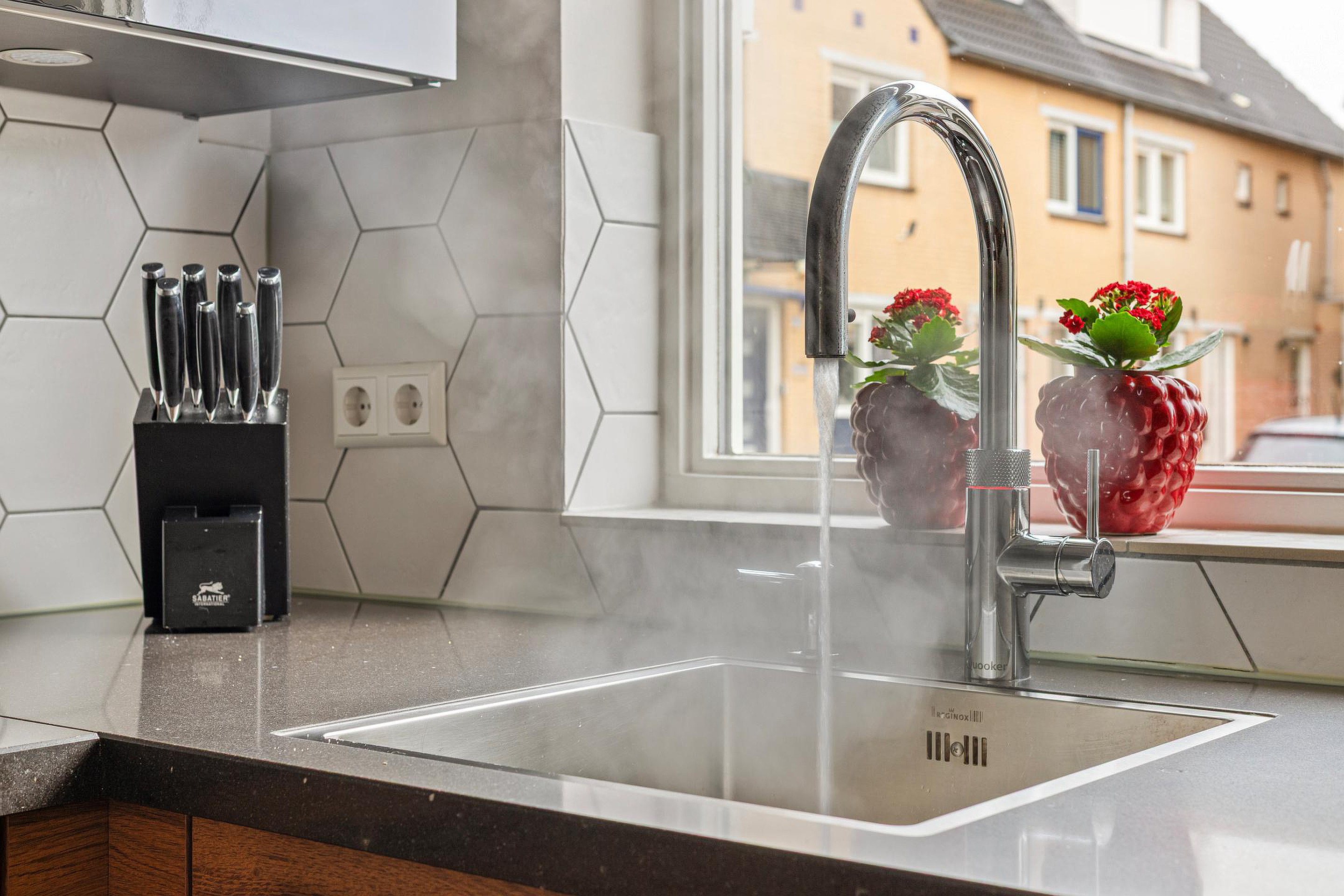 Keuken, gelegen aan de voorzijde met leuk uitzicht op het pleintje. De keuken is voorzien van een keukenblok in U-vormige opstelling, welke beschikt over een inductiekookplaat, afzuigkap, heteluchtoven, vaatwasser, grote koelkast, vriezer met 4 lades, kokend waterkraan Quooker, hoekcarrousel en brede laden.