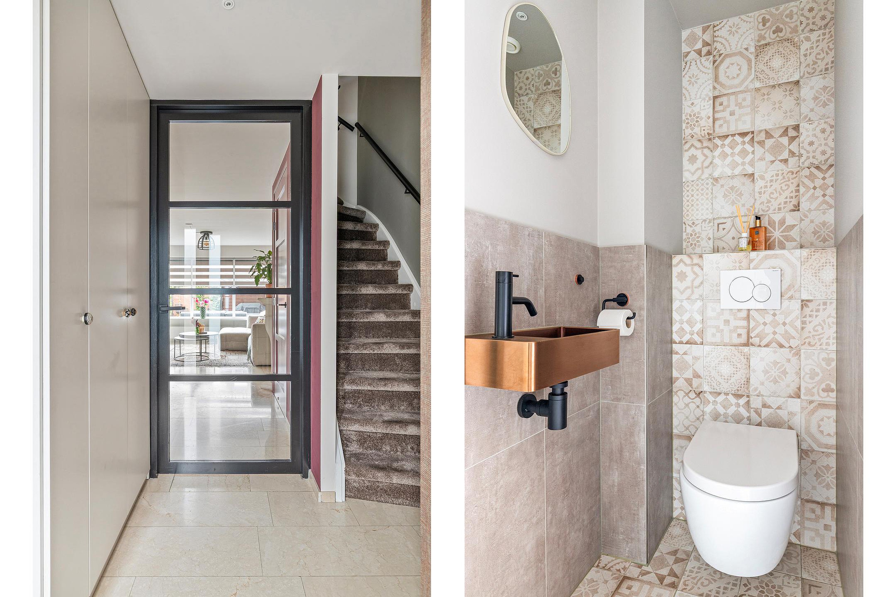 Toilet, modern en grotendeels betegeld, voorzien van een hangend closet, fonteintje en mechanische ventilatie.