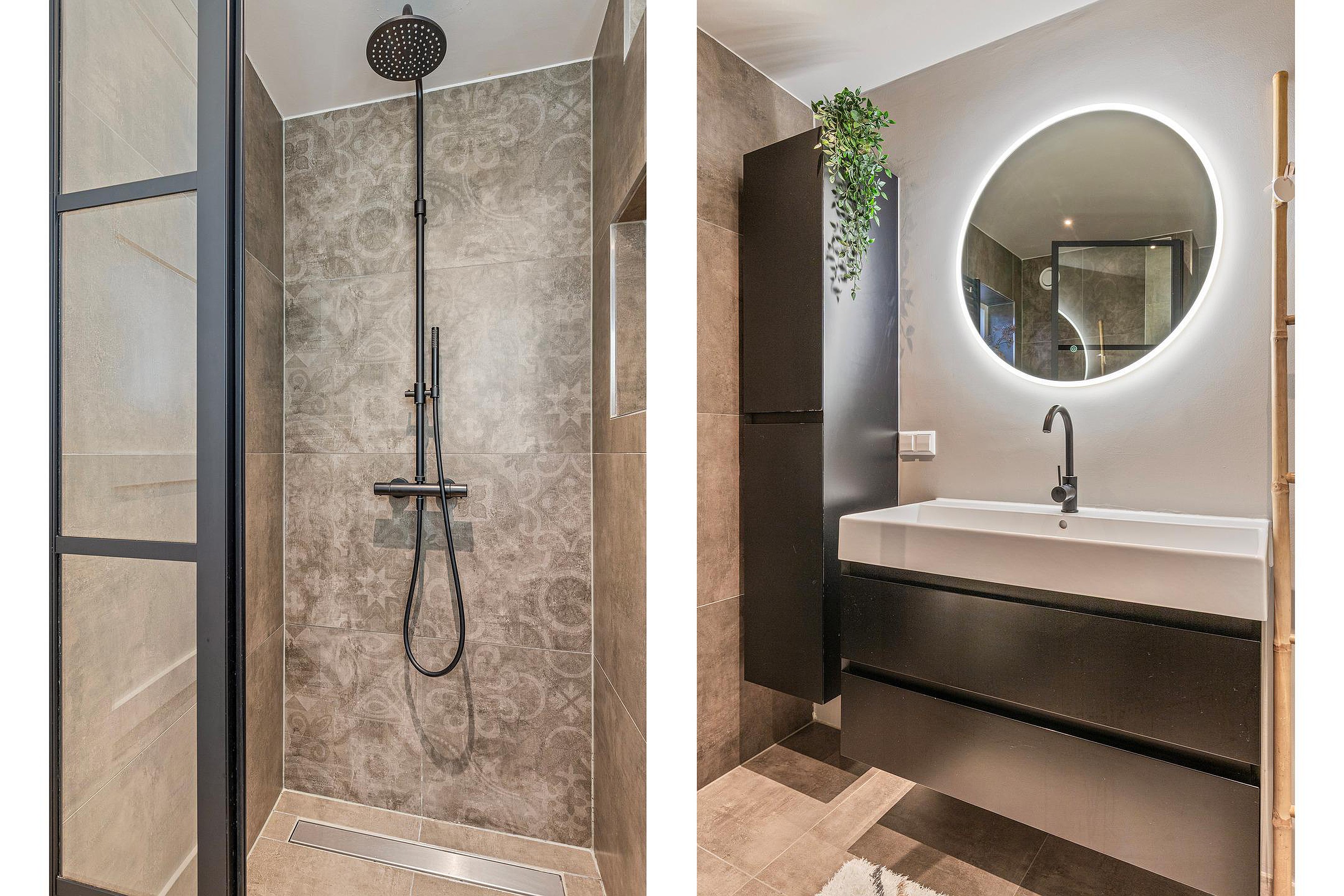 Badkamer, een moderne en geheel betegelde badkamer, voorzien van een grote inloopdouche met thermostaatkraan, handdouche en rainshower, wastafel met onderladen, ronde spiegel met verlichting, kolomkast, badkamerradiator, tweede toilet (hangend closet), mechanische ventilatie en een te openen raam.