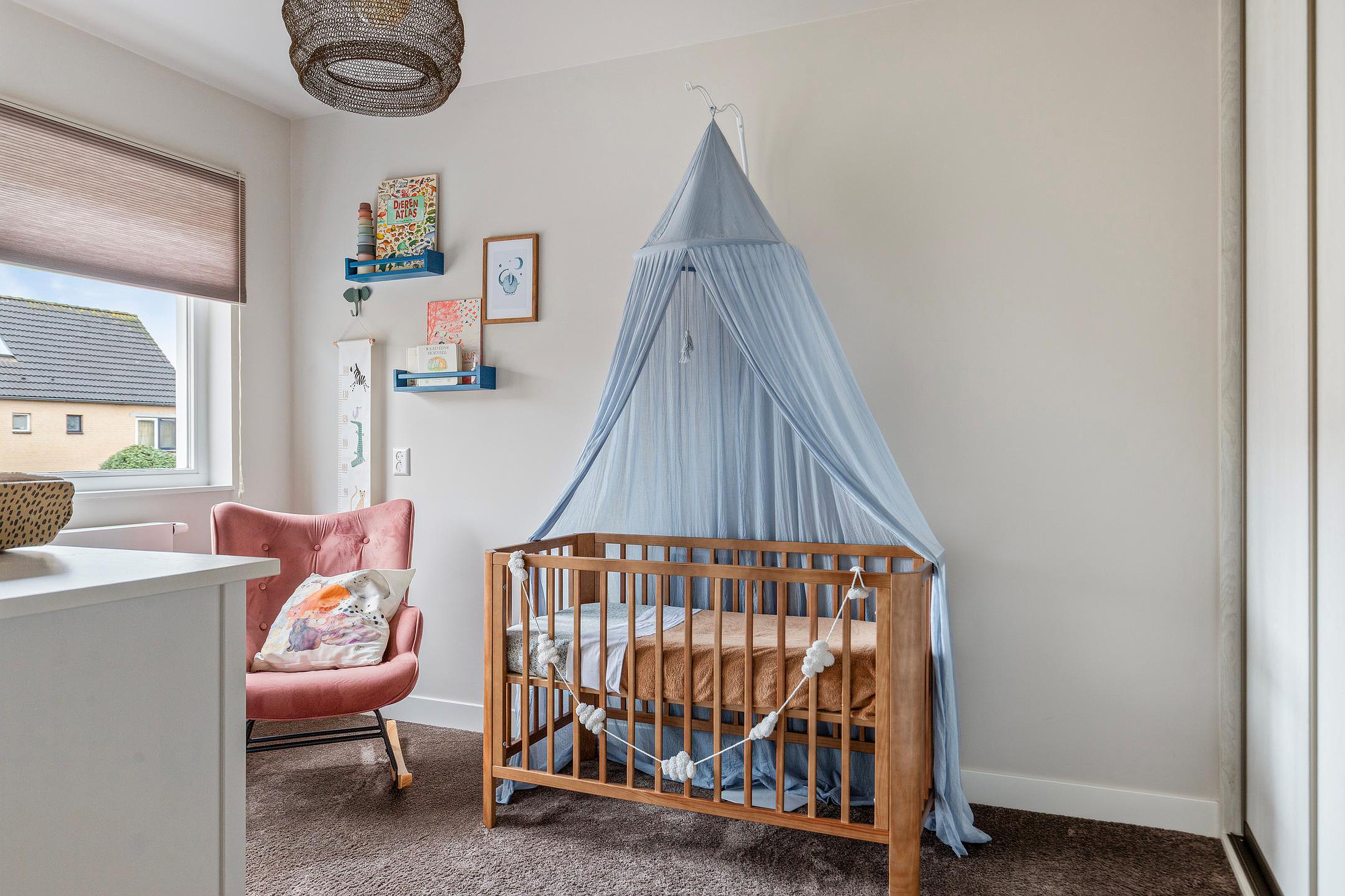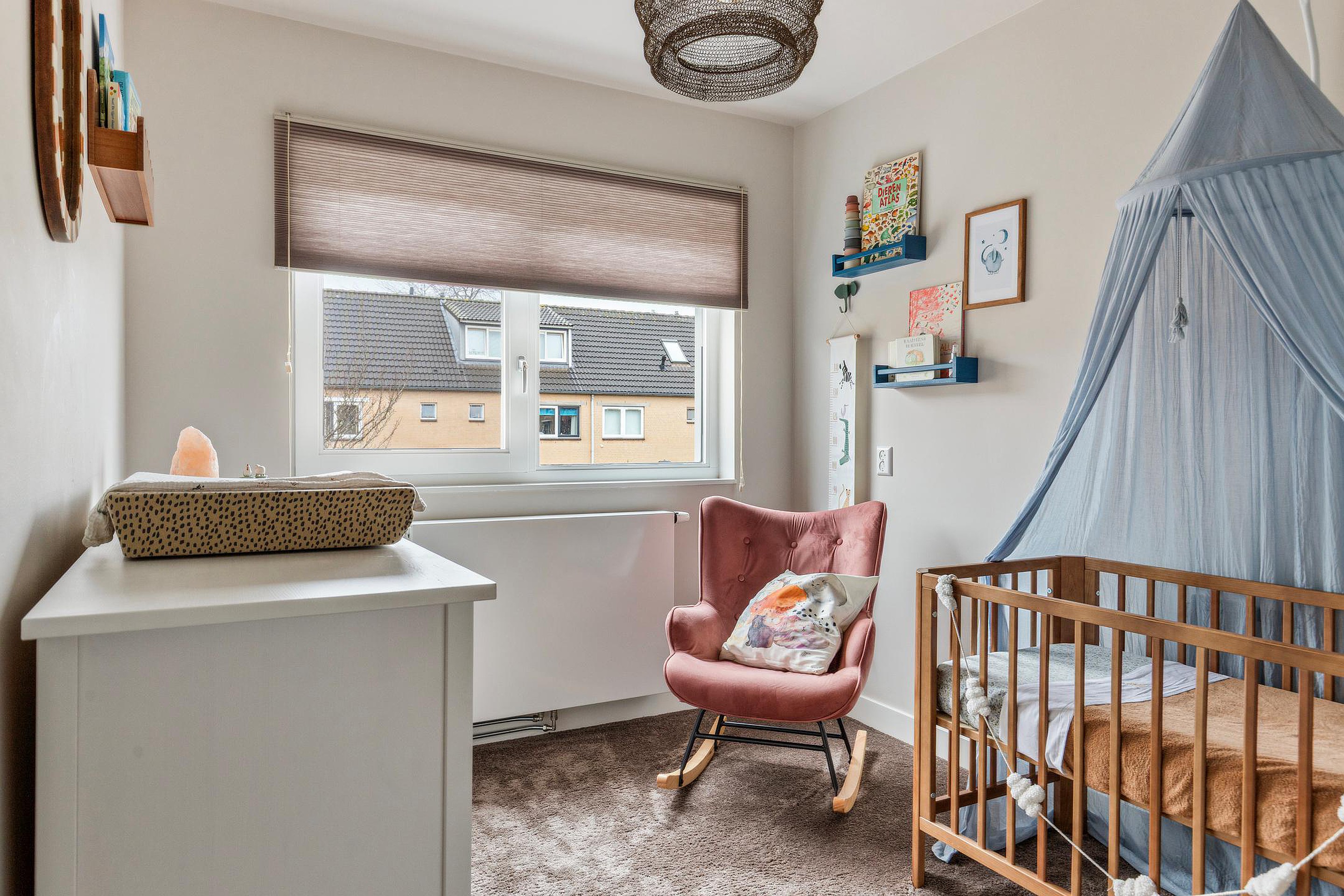 Slaapkamer 2, een leuke kamer aan de voorzijde, eveneens voorzien van een elektrisch rolluik en een maatwerk kast met schuifdeuren.