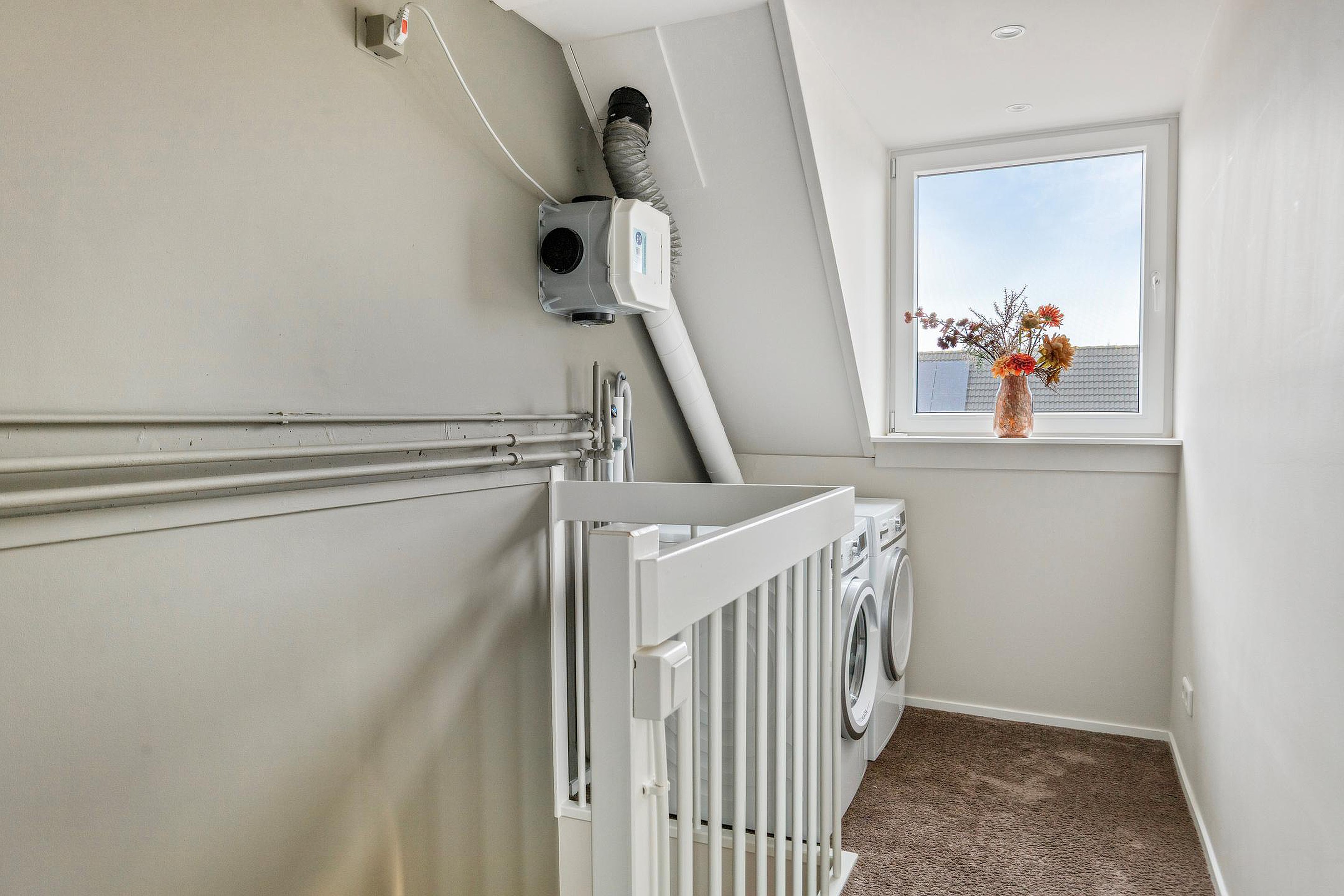 Overloop, met toegang tot slaapkamer 3, de cv-ketel opstelling, omvormer van de PV zonnepanelen, mechanische ventilatie unit en de wasmachine- en drogeraansluiting.