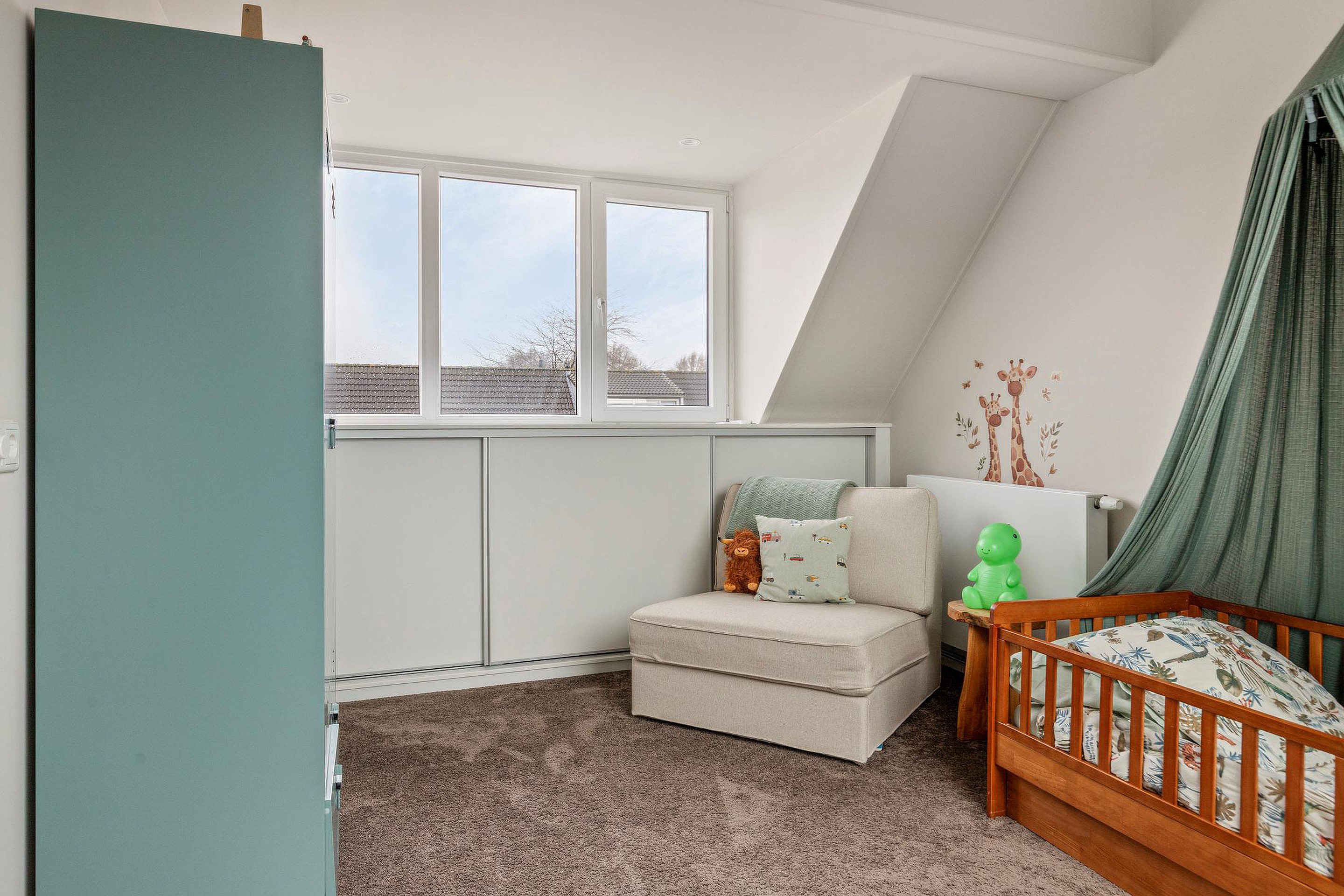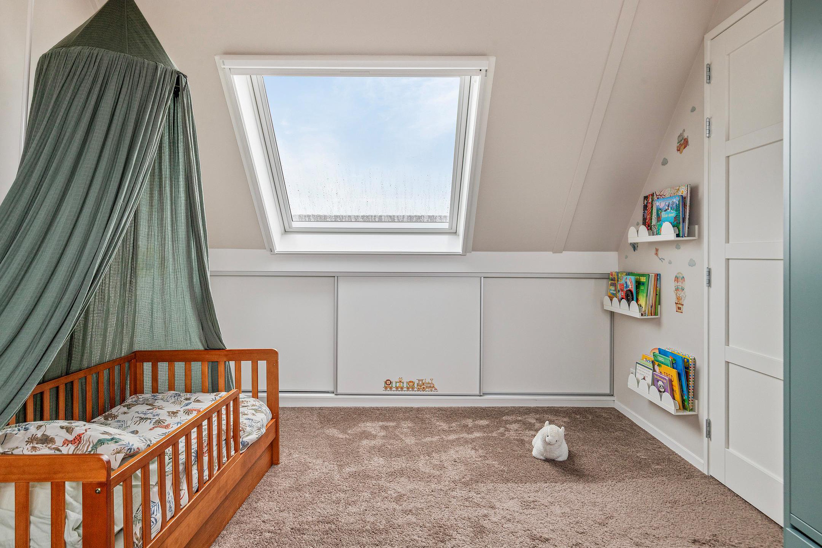 Slaapkamer 3, een leuke zolderkamer, voorzien van een dakkapel aan de voorzijde met een elektrisch rolluik, een groot kunststof Velux dakraam aan de achterzijde met een verduisterend rolgordijn, airconditioning en bergruimte achter de knieschotten aan zowel de voor- als achterzijde.