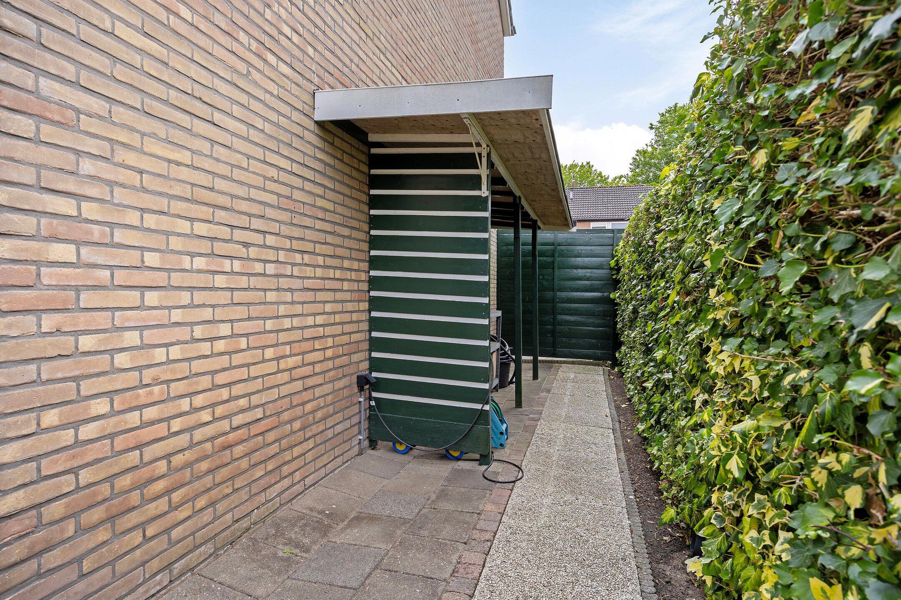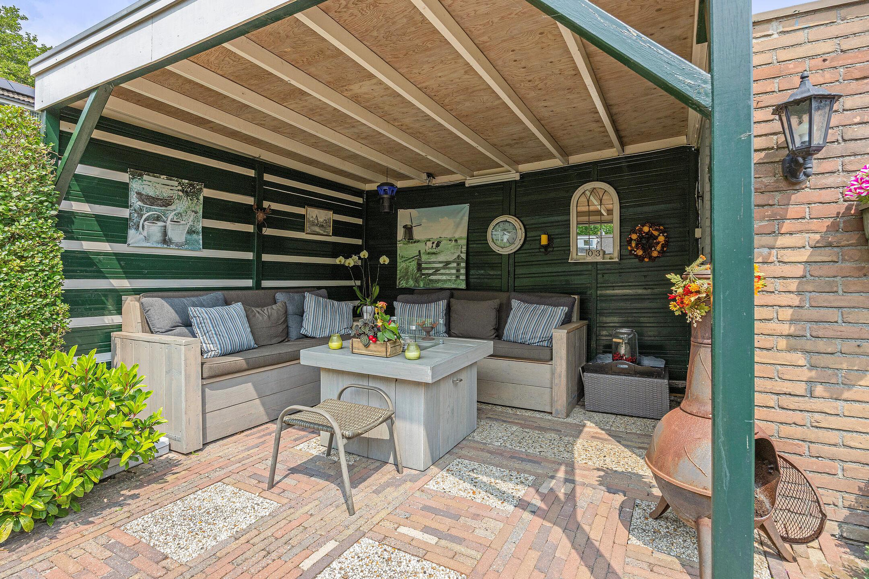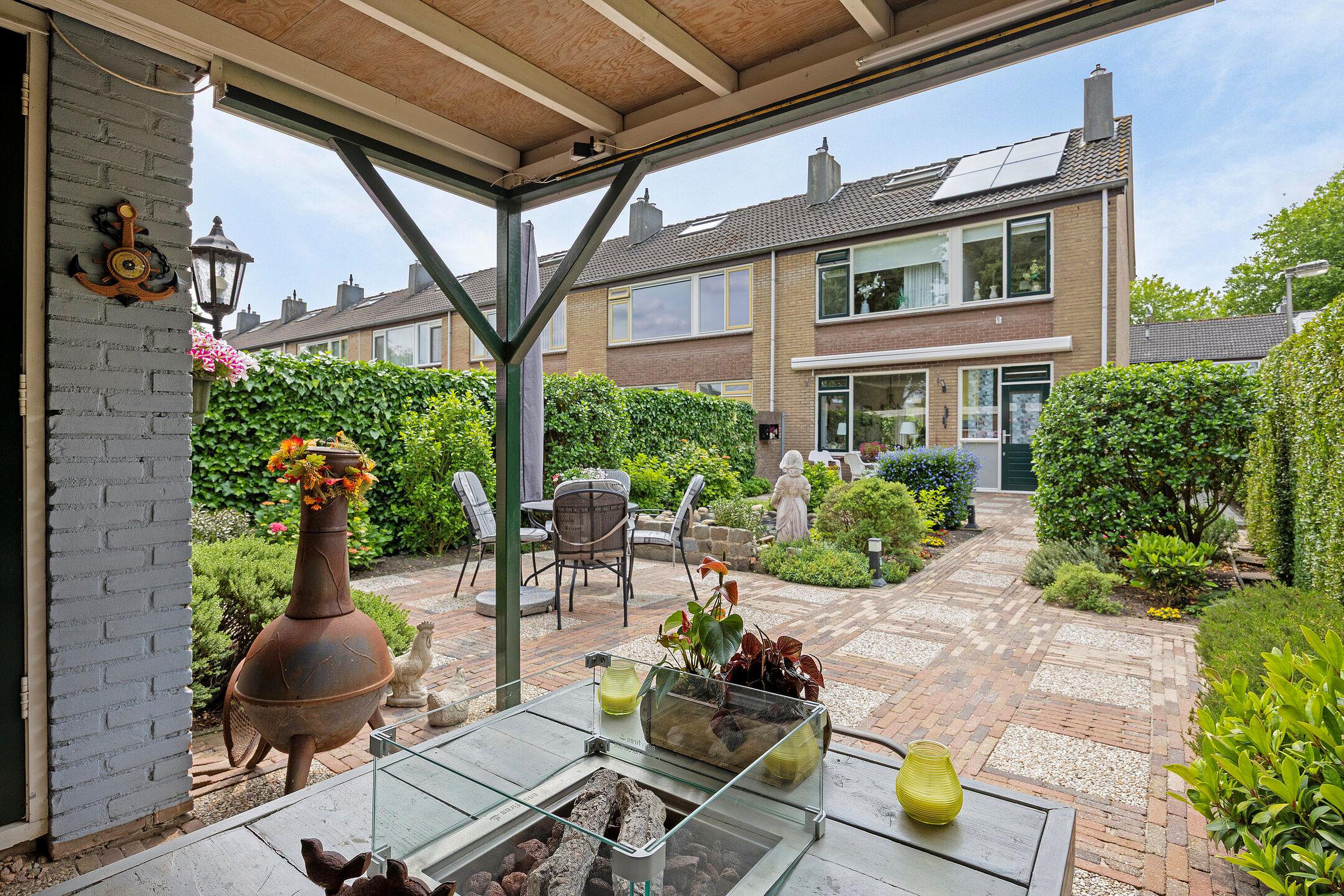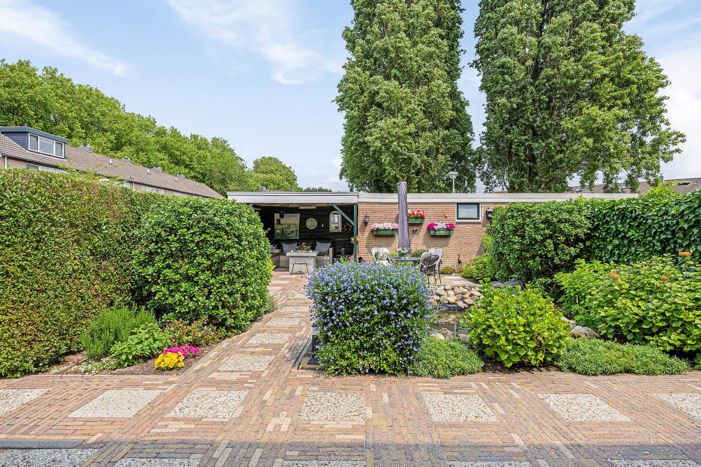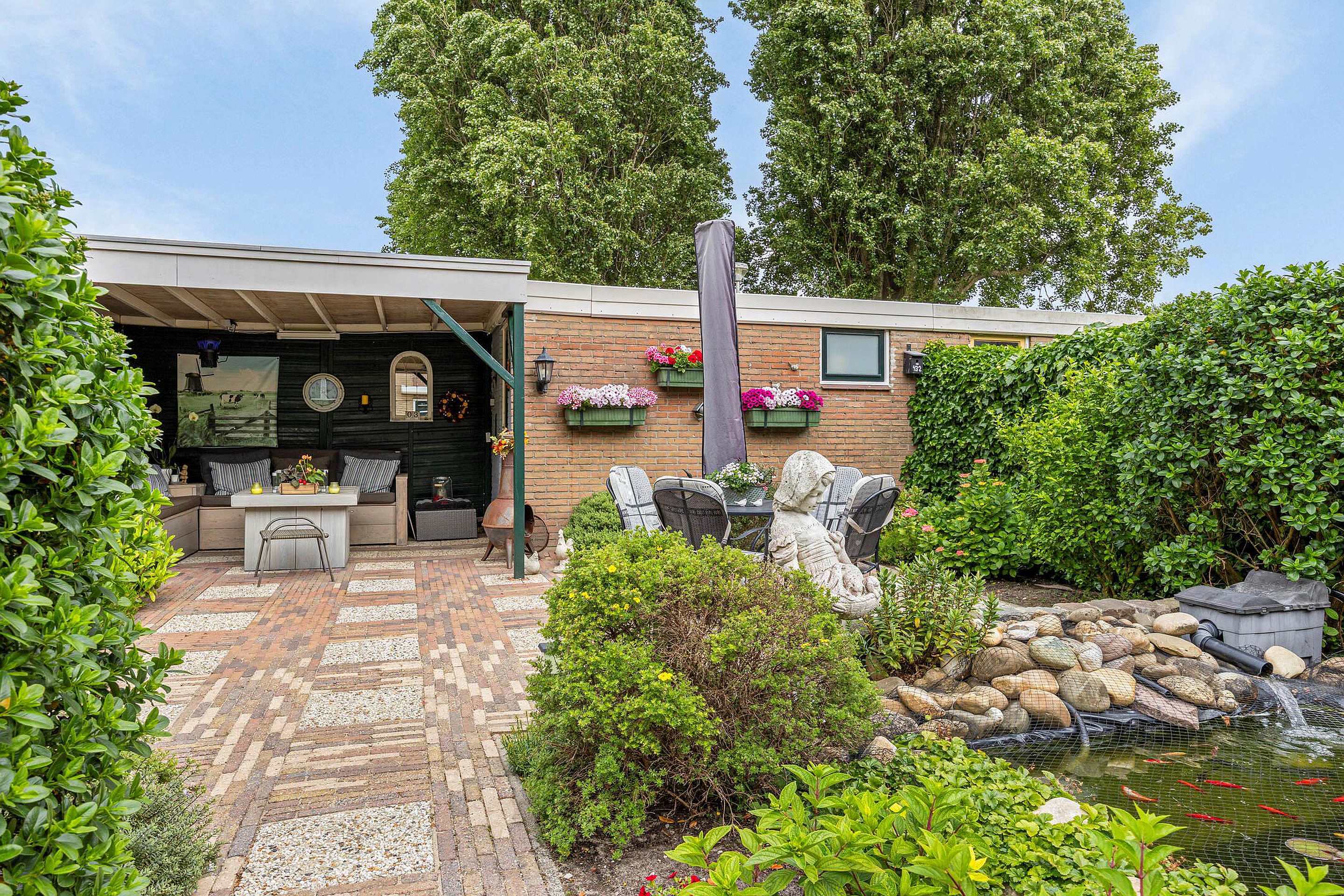 Achtertuin (ca. 15.15 x 8.45), een royale, groene tuin met een vijver, wat zorgt voor een gezellige sfeer. Grotendeels bestraat en voorzien van een stenen berging met elektriciteit, verlichting en een gezellige overkapping. Heerlijk om ’s avonds nog even een drankje te doen! Verder is er elektrische zonwering en zij-uitgang op de straat aanwezig.