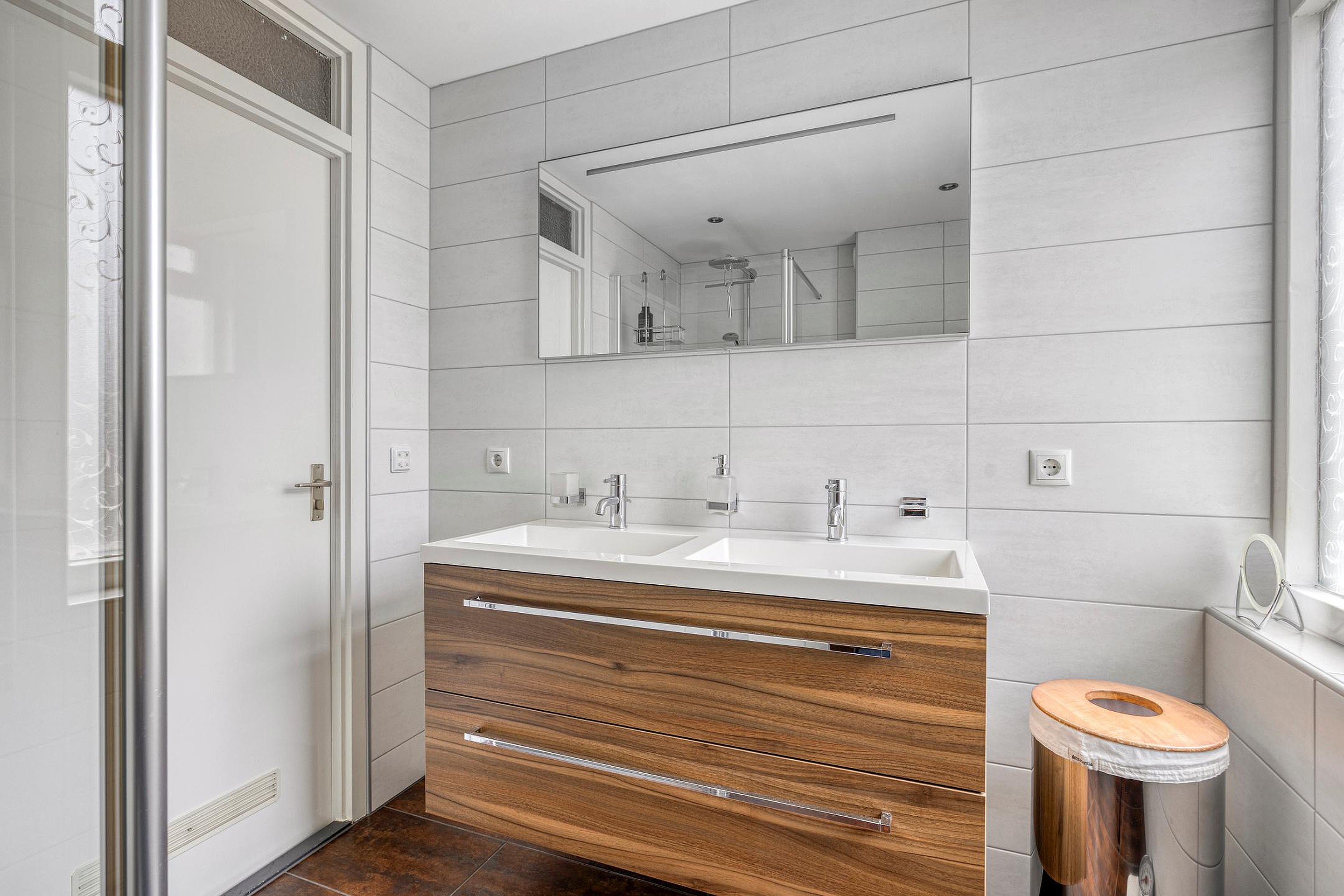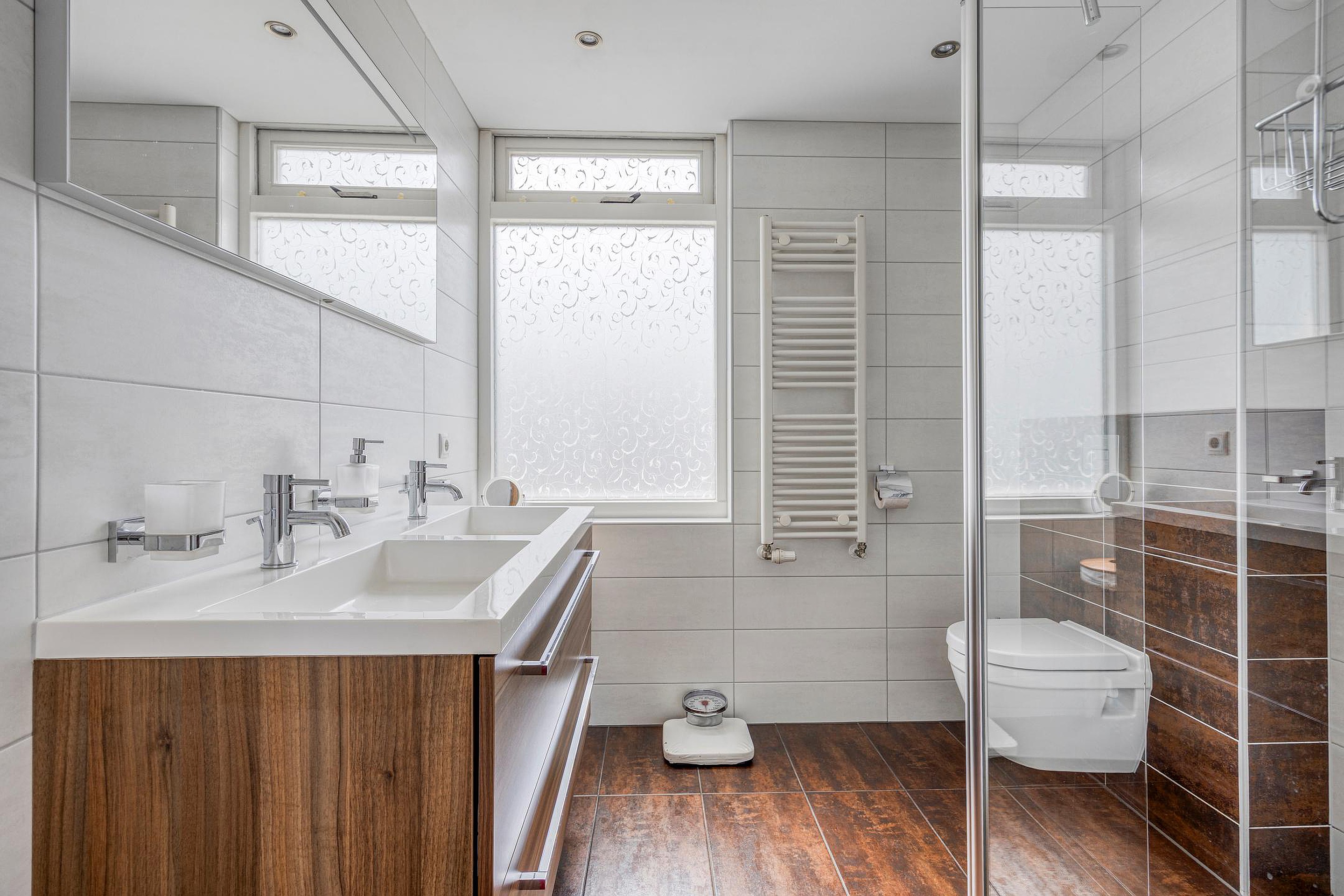 Badkamer, gelegen aan de voorzijde, geheel betegeld en voorzien van vloerverwarming met een inloopdouche met thermostaatkraan en rainshower, twee wastafels met onderladen en spiegel, een tweede toilet (hangend closet), badkamerradiator en mechanische ventilatie.