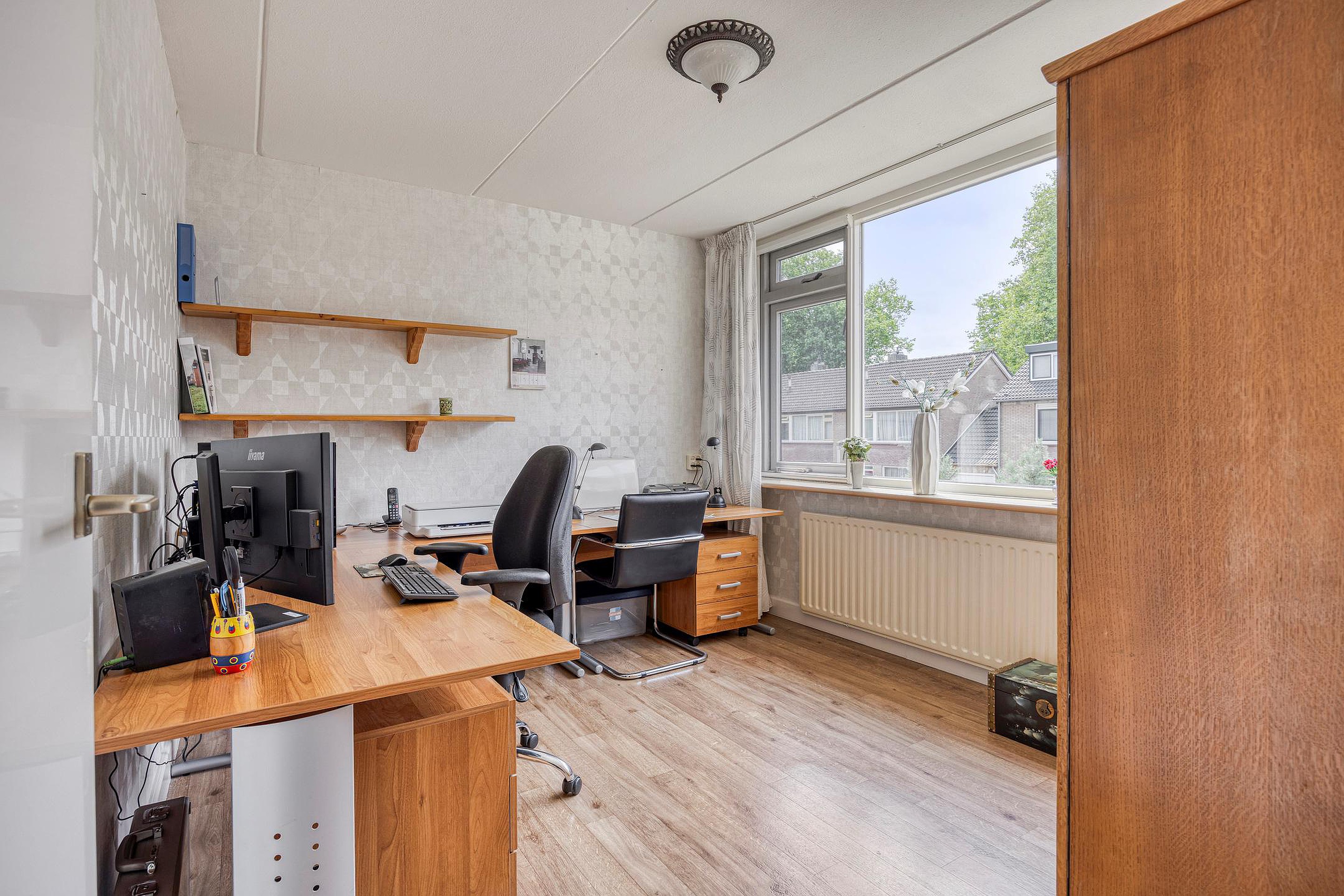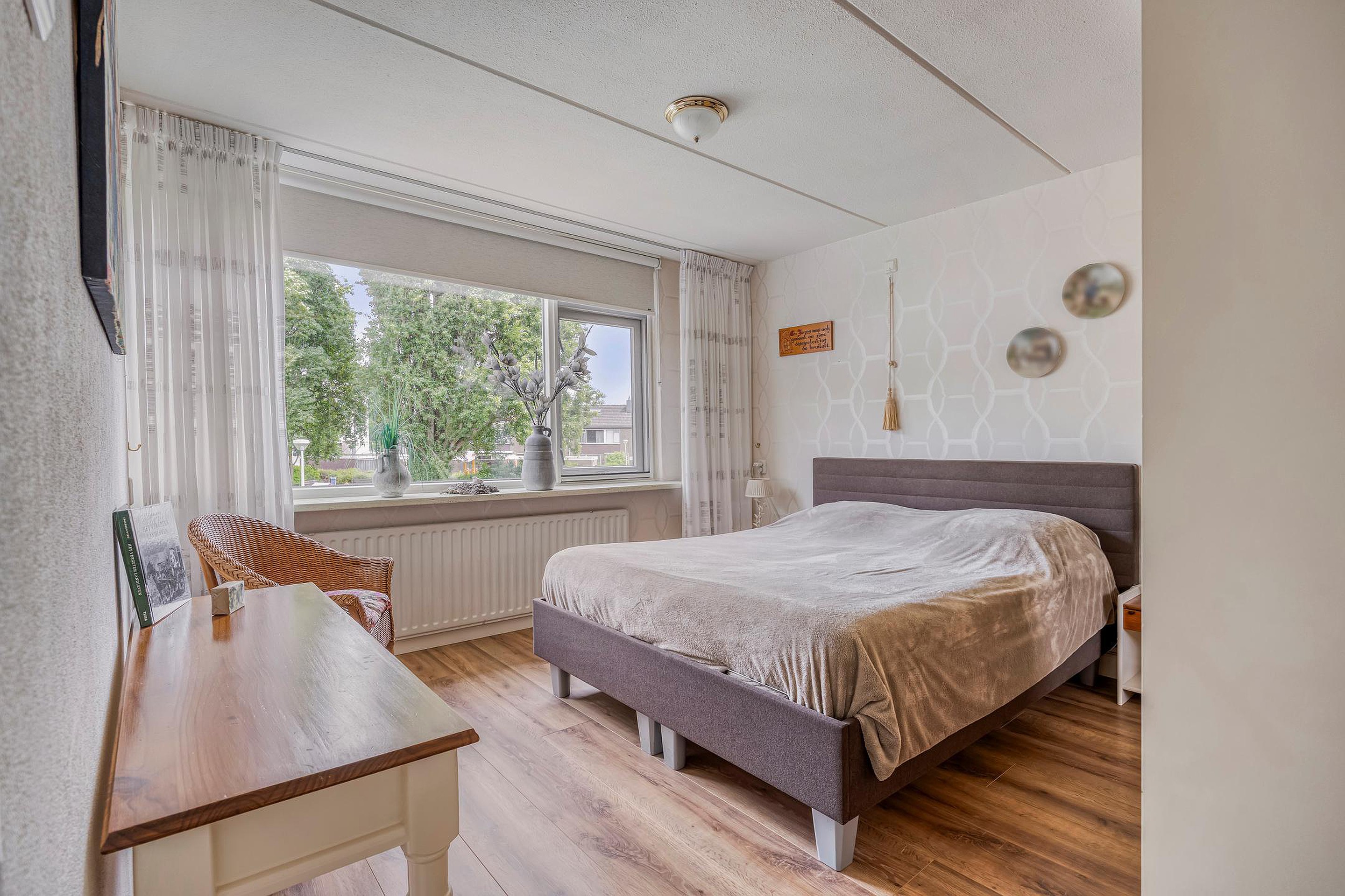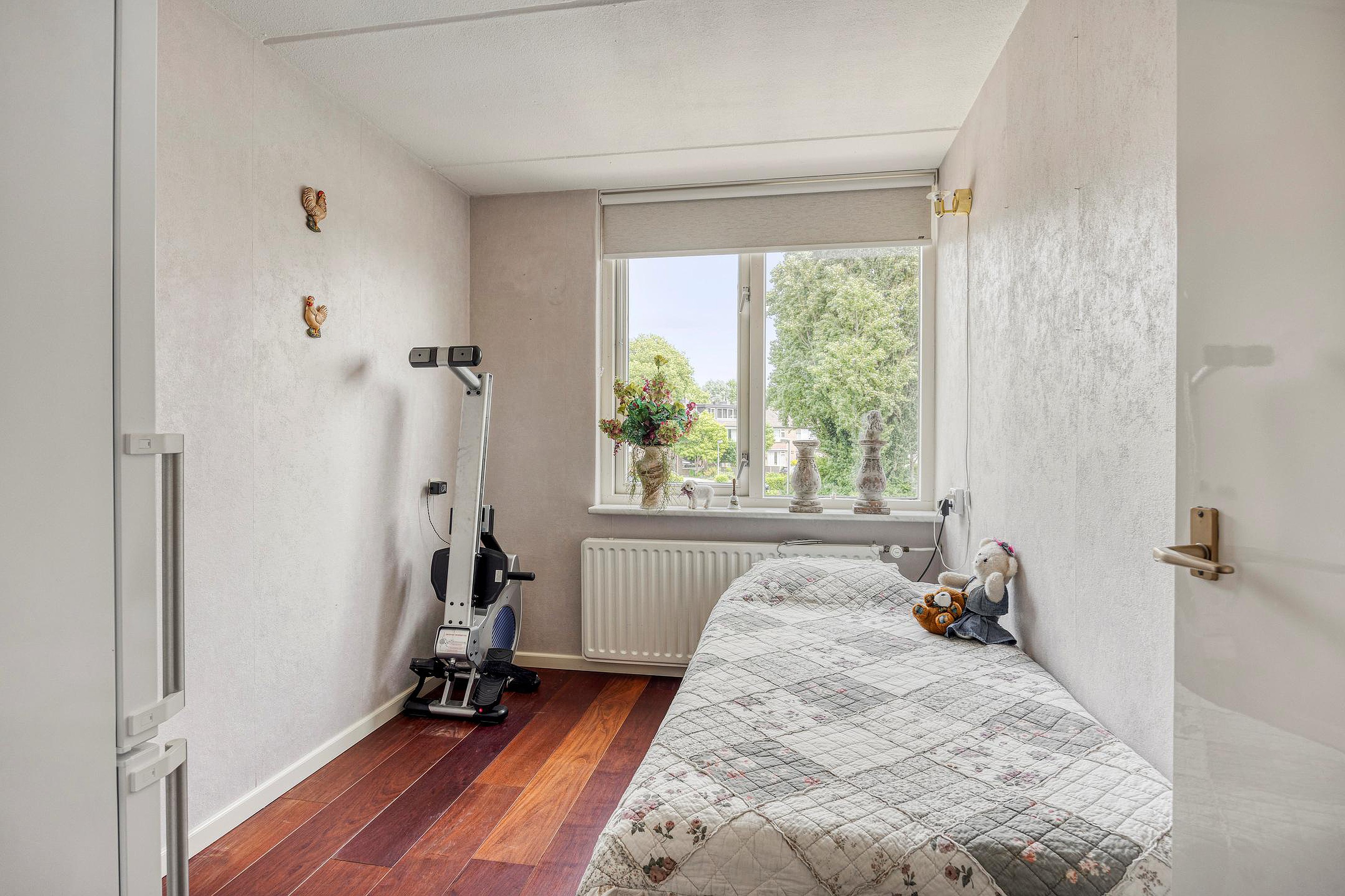 Slaapkamer 3, gelegen aan de achterzijde, voorzien van houten vloerdelen.