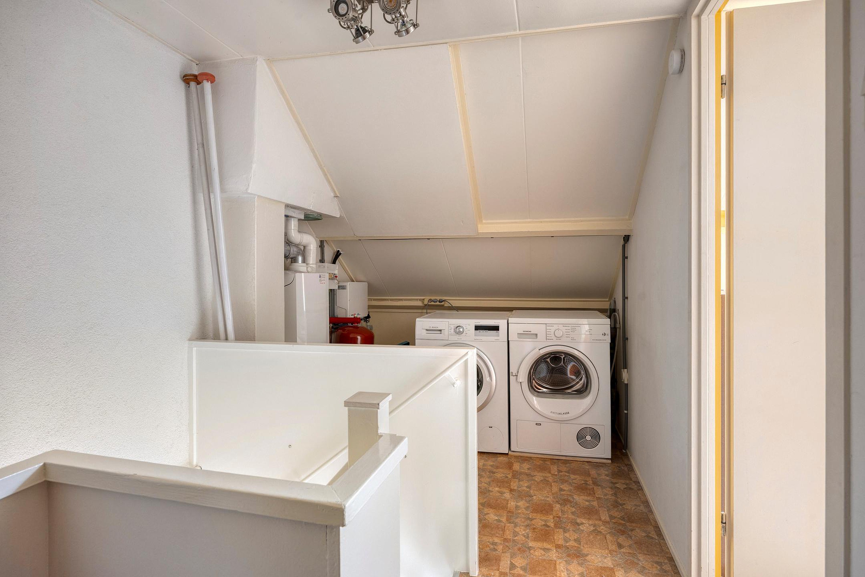 Overloop, ook voorzien van zeil op de vloer, met wasmachine- en drogeraansluiting, opstelling C.V.-ketel, mechanische ventilatie-box, omvormer PV-zonnepanelen (Solar Edge) en veel opbergruimte achter de knieschotten.