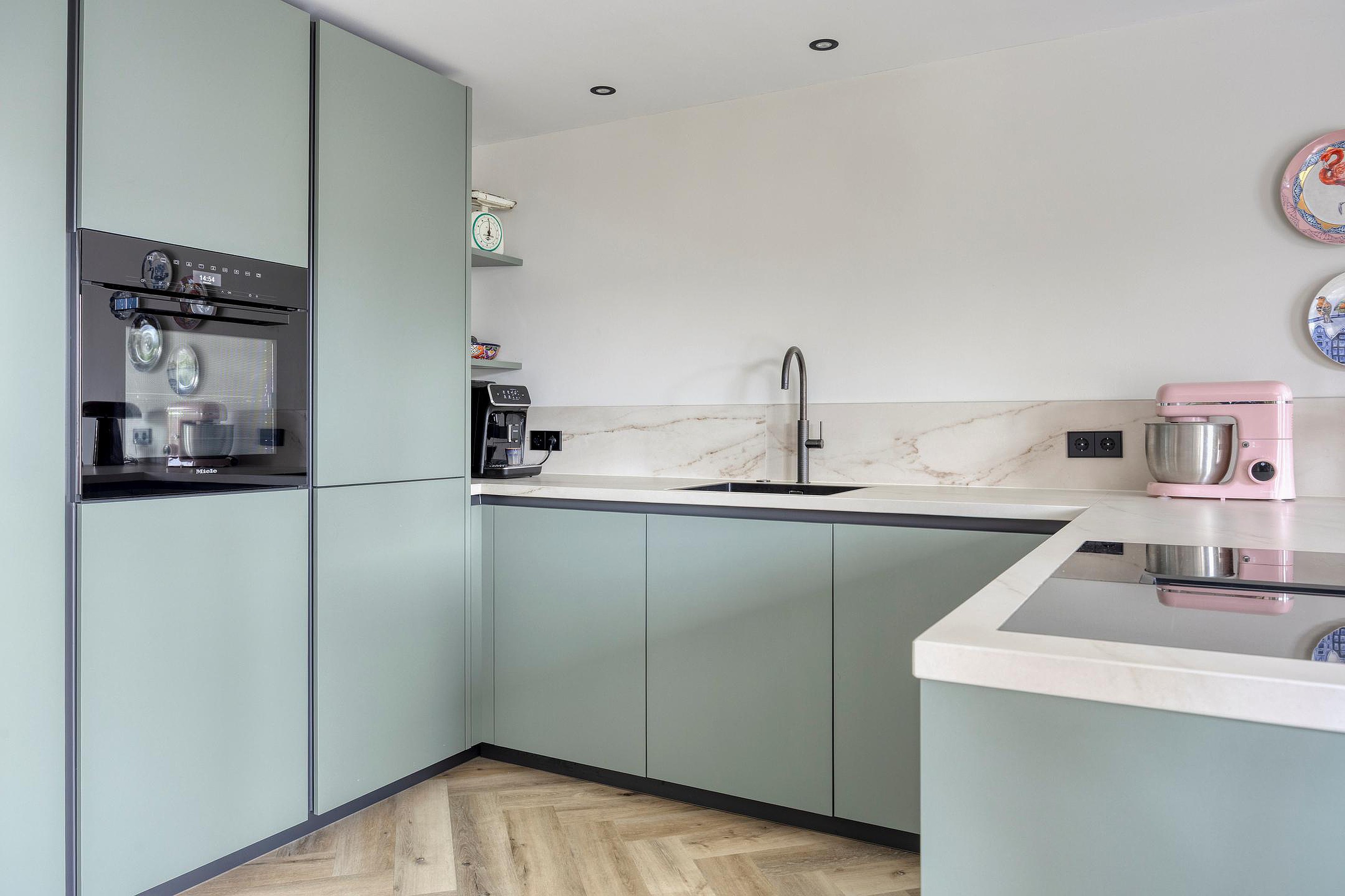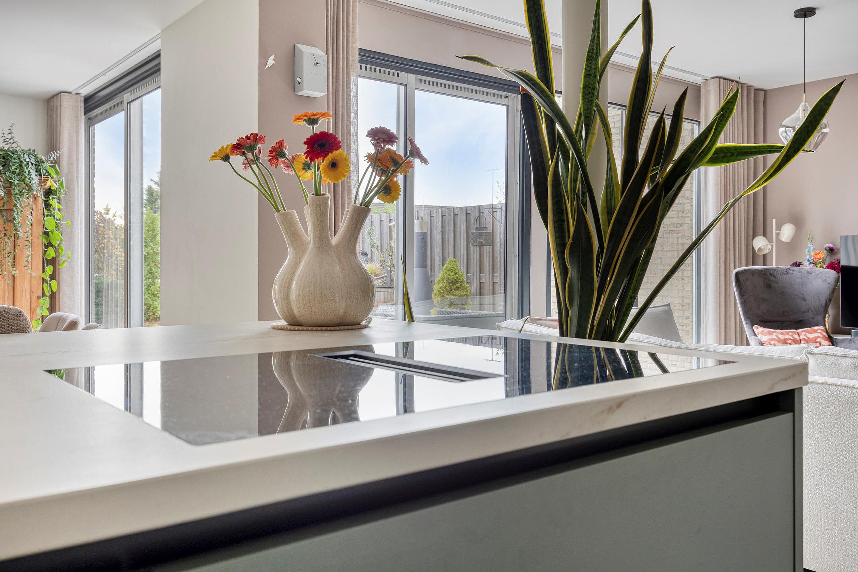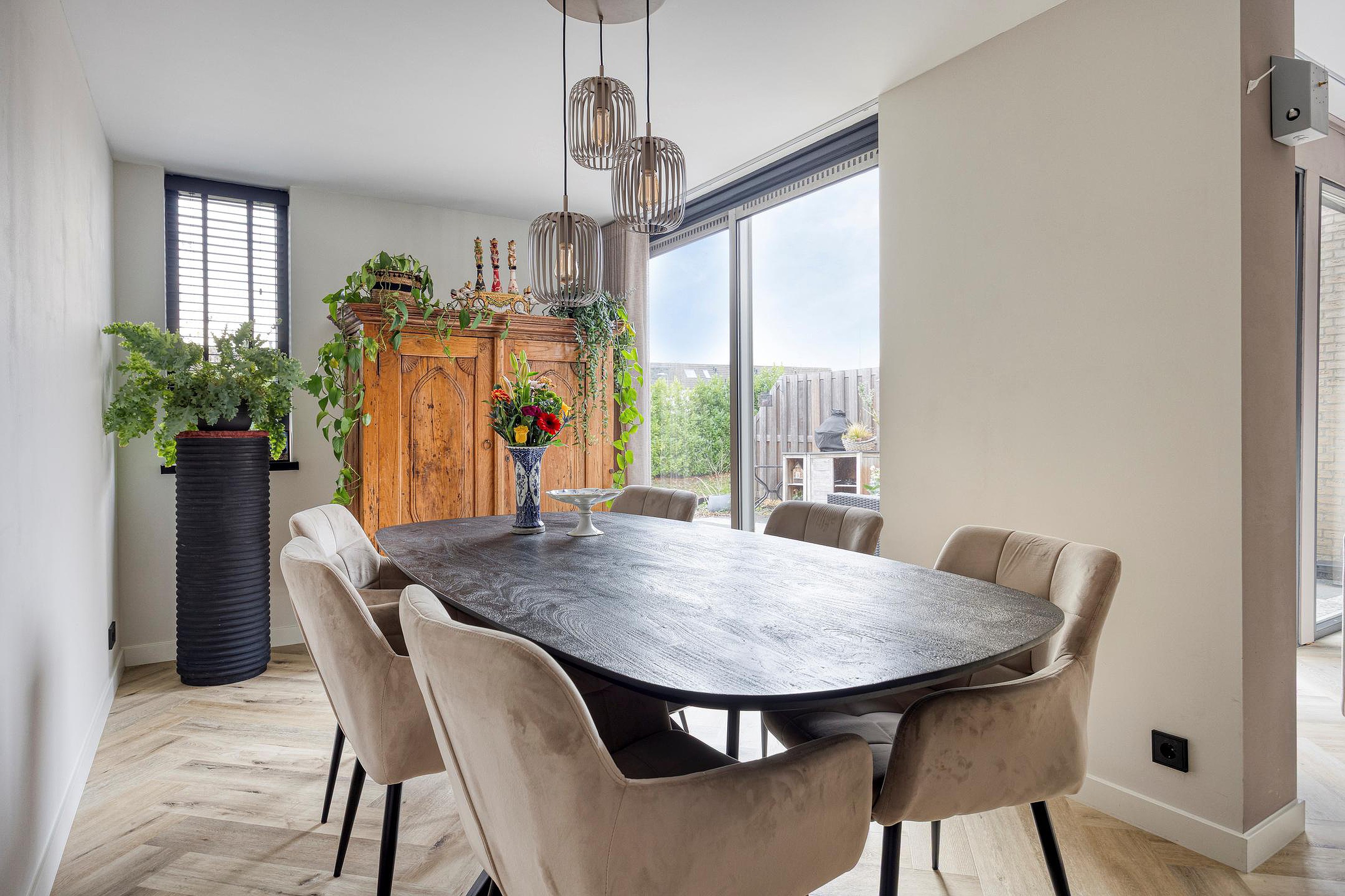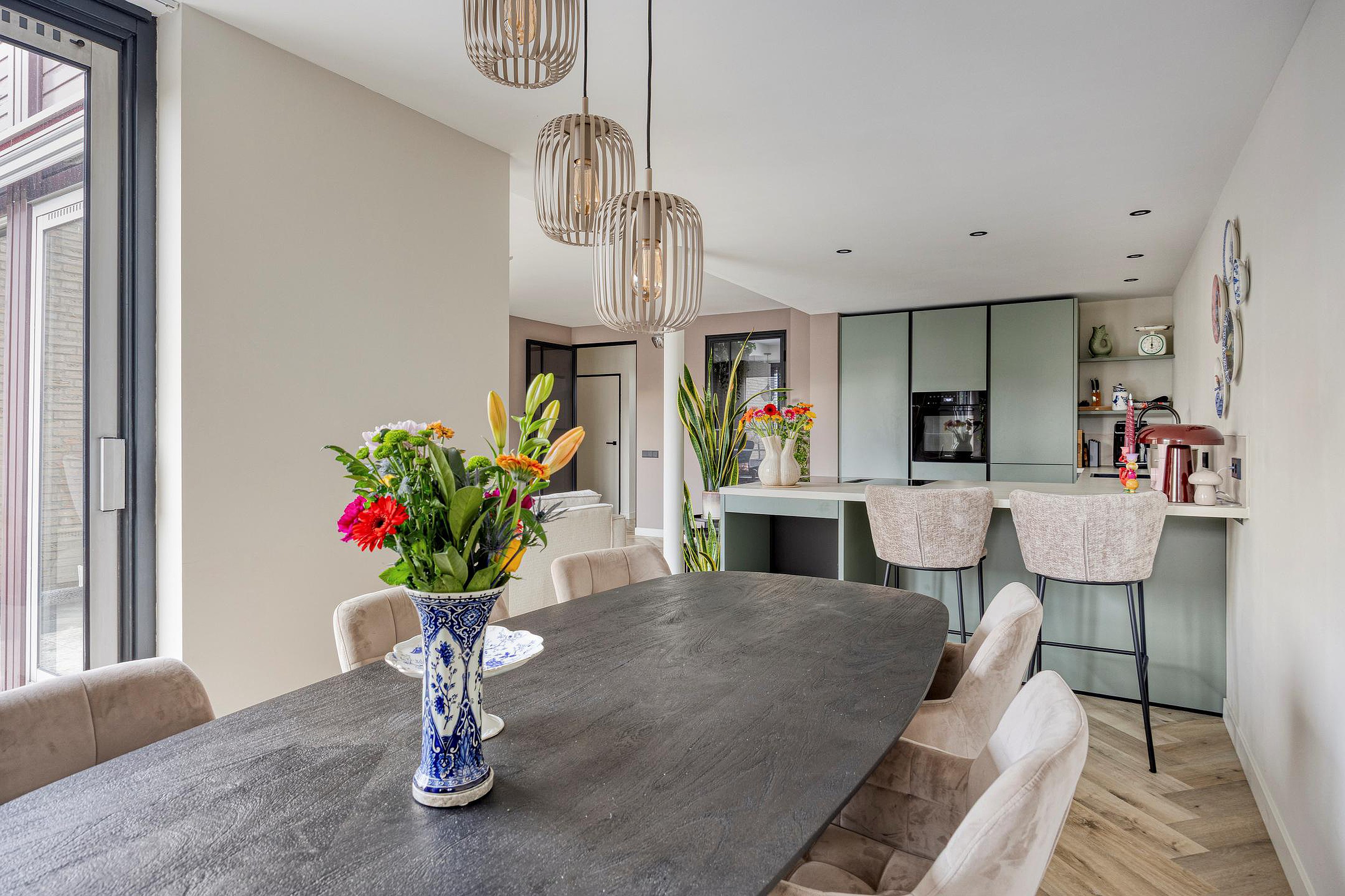 De luxe open keuken vormt het hart van de woning. Deze is uitgerust met een baropstelling, koelkast, oven, vaatwasser, een vierpits inductiekookplaat met geïntegreerde afzuiging en een kokend waterkraan. De eetruimte sluit prachtig aan op de keuken en wordt dankzij de brede schuifpui verbonden met de zonnige achtertuin.